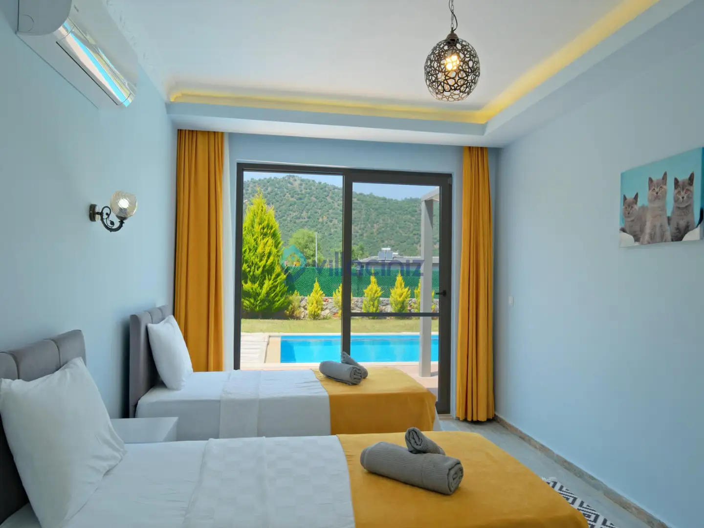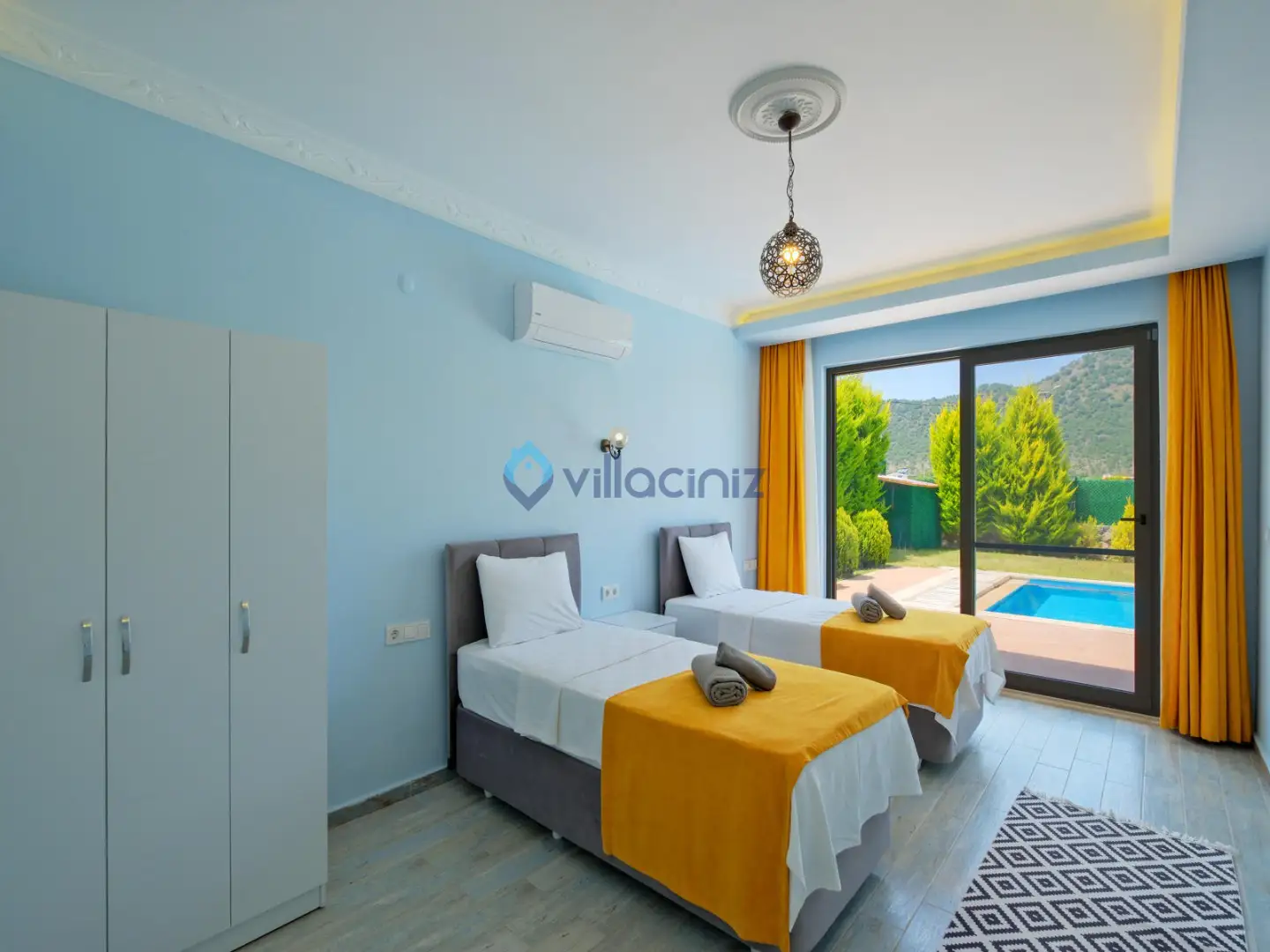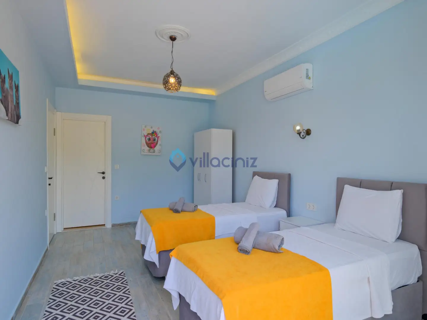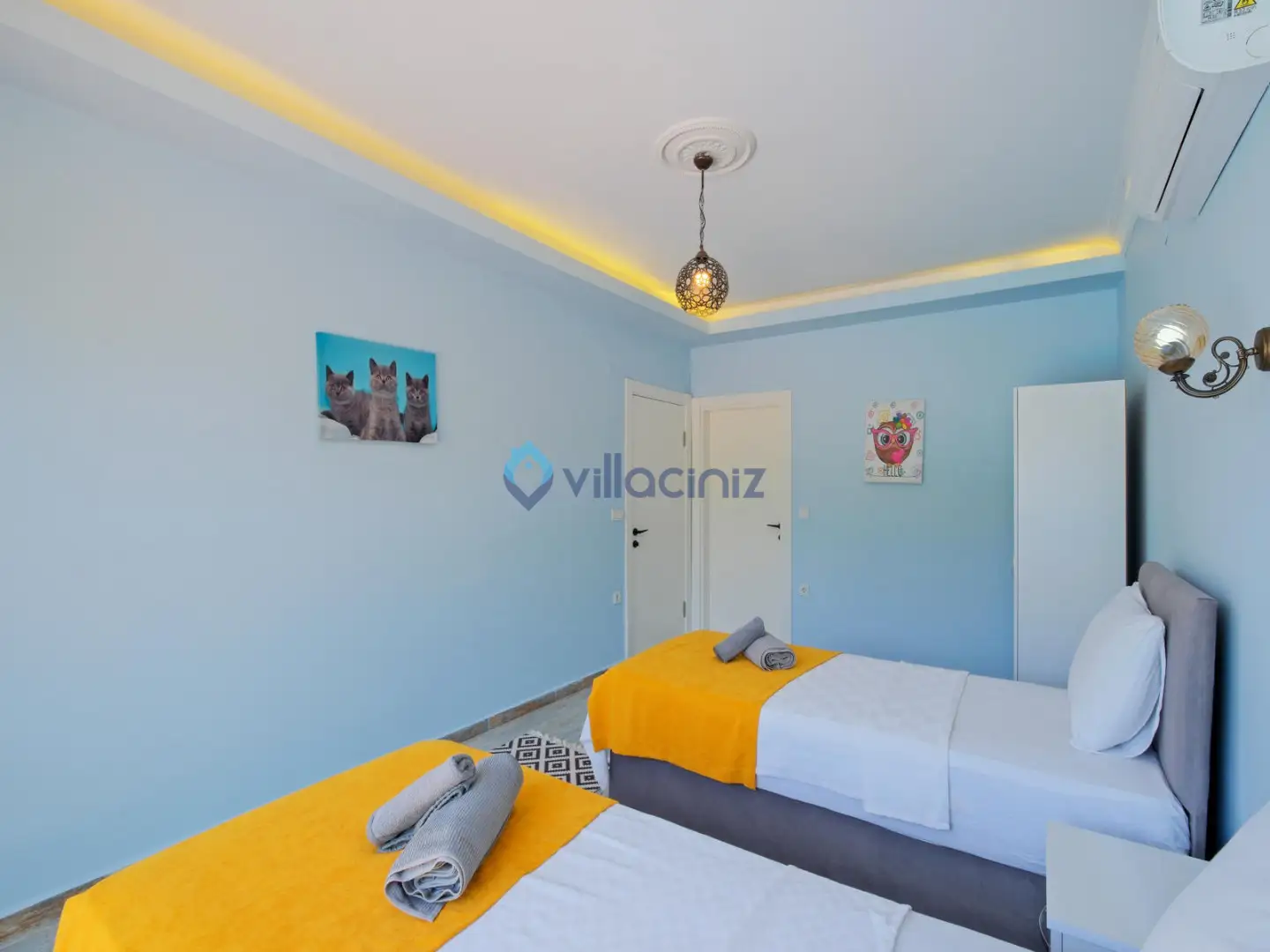 Yatak odası 2: 2 Adet tek kişilik yatak, klima, komodin, elbise dolabı, banyo ve tuvalet bulunmaktadır.