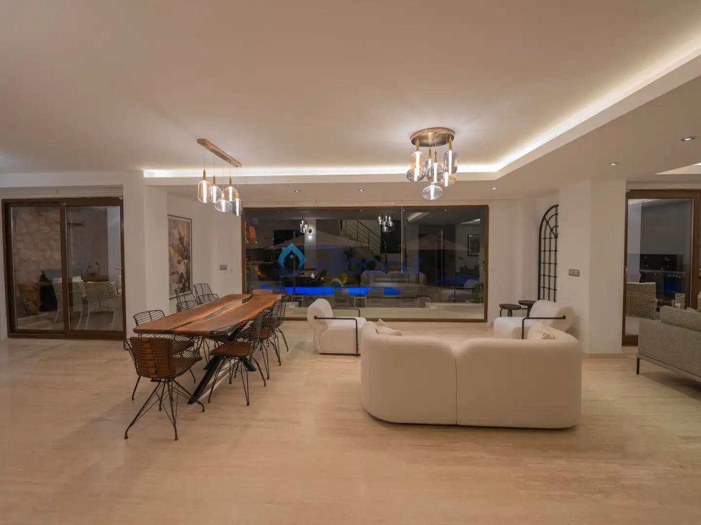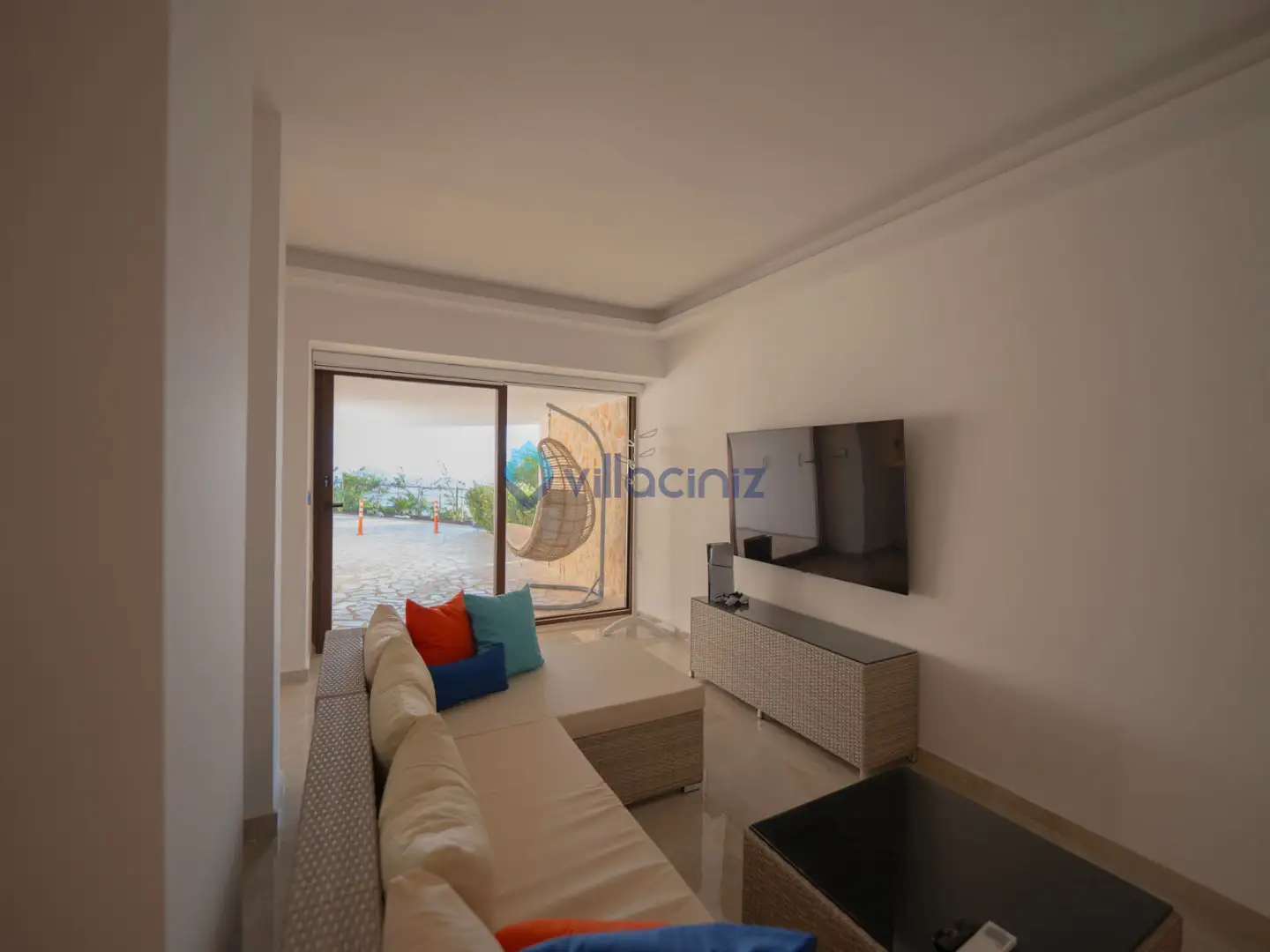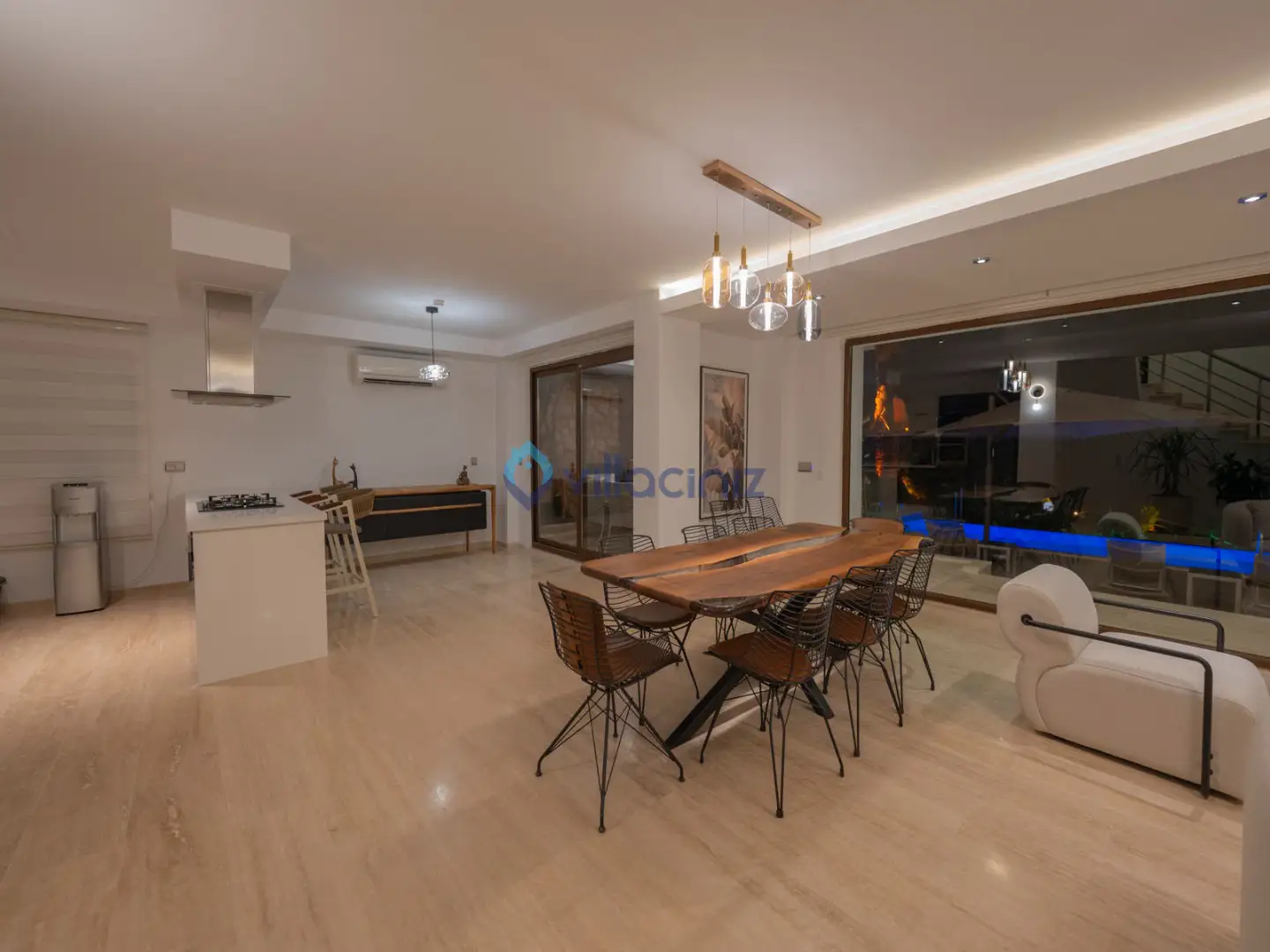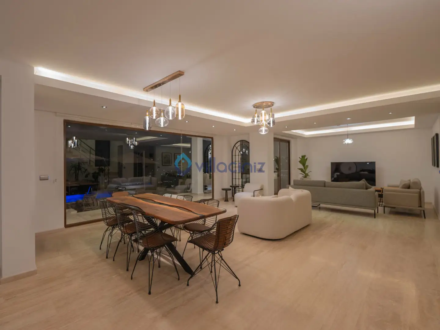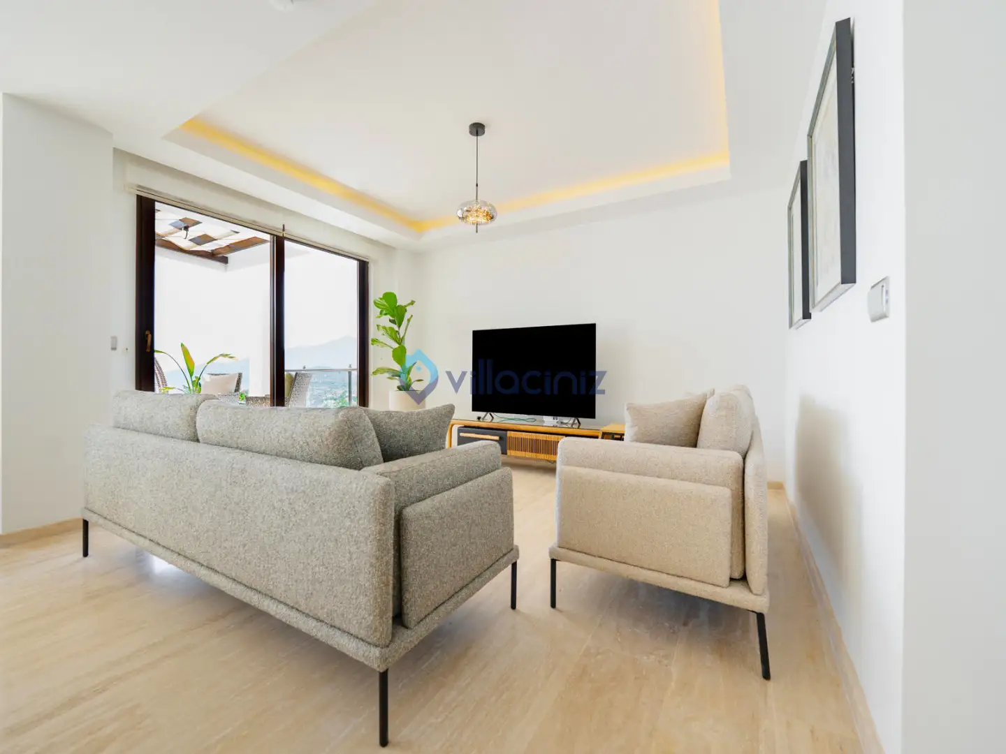 Modern oturma grubu, plazma televizyon uydu alıcısı, klima, orta sehpa, yemek masası ve havuz terasına çıkış bulunmaktadır.