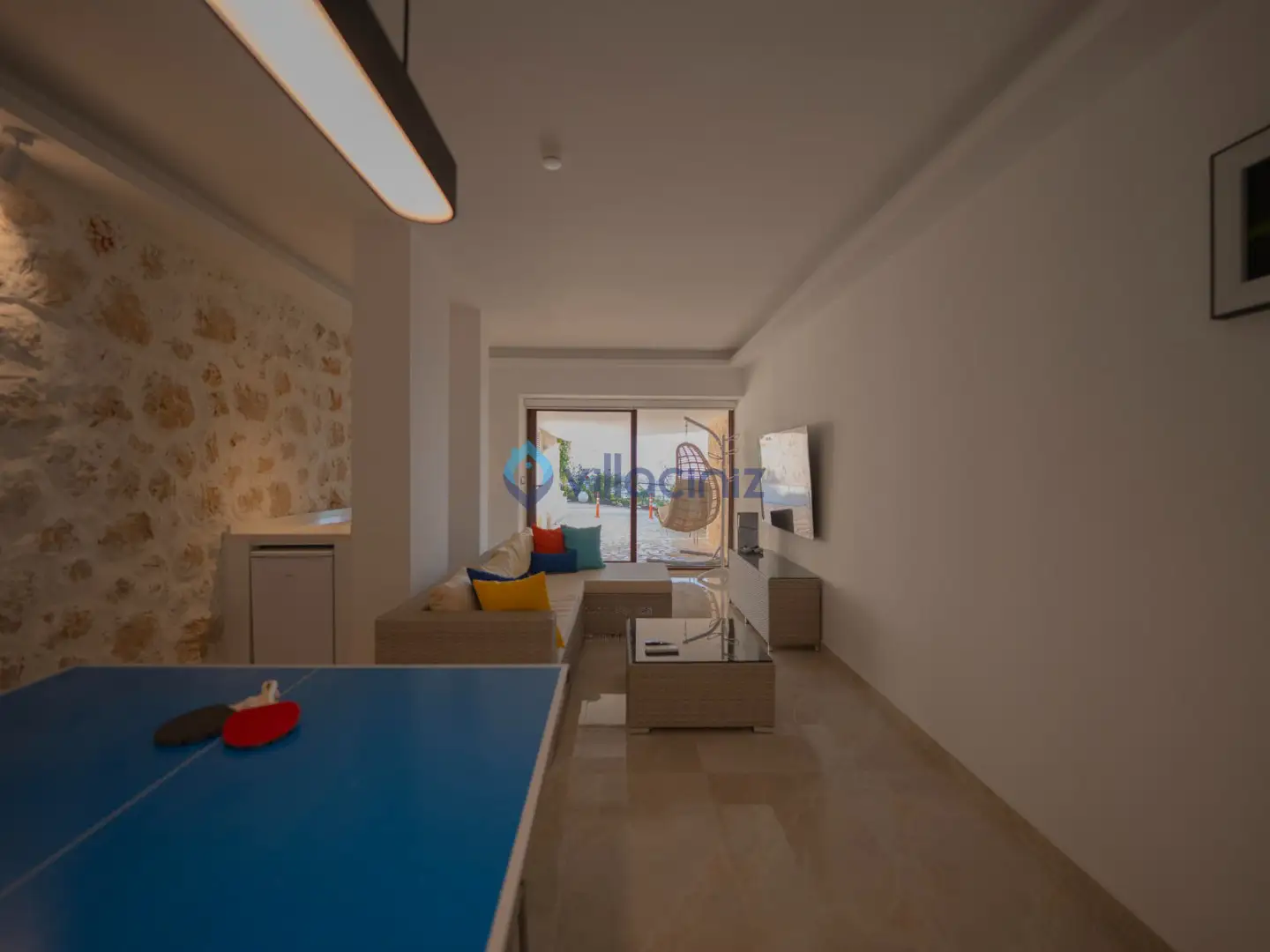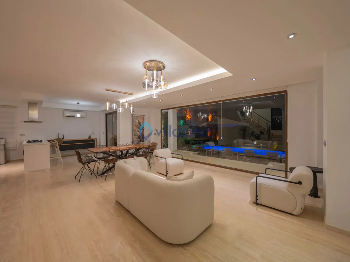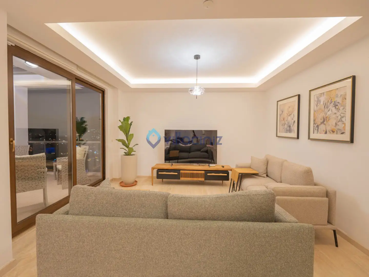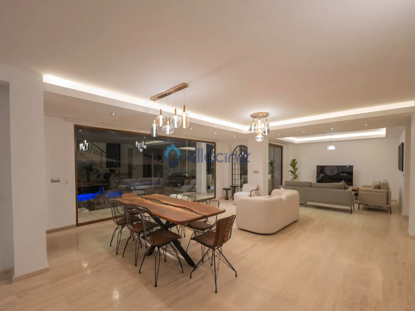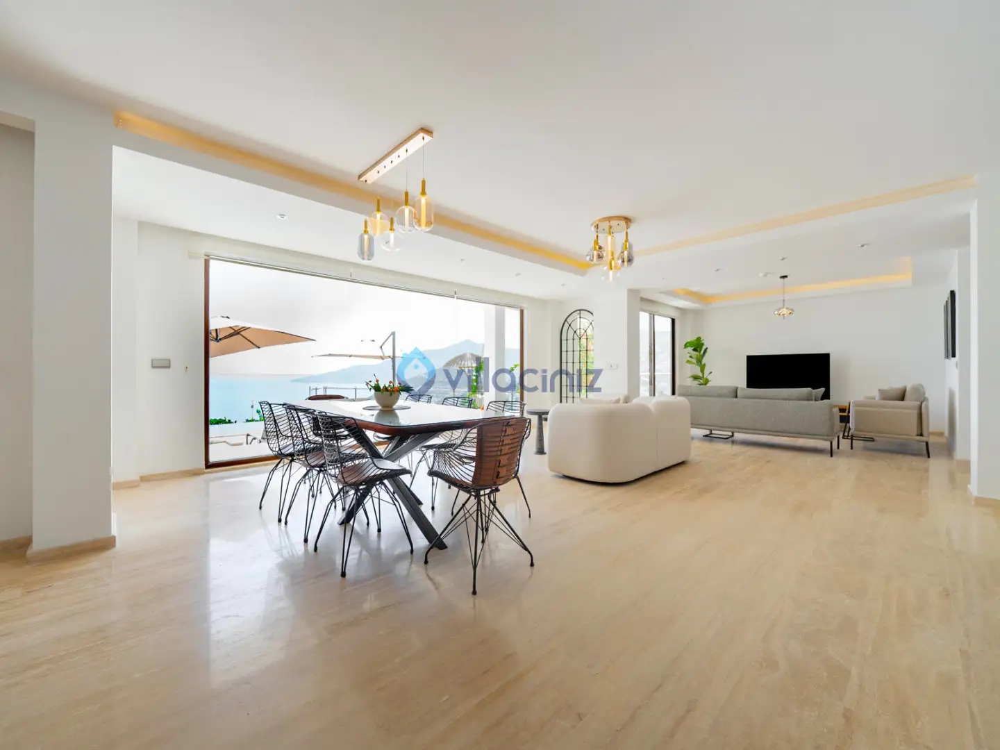 Modern oturma grubu, plazma televizyon uydu alıcısı, klima, orta sehpa, yemek masası ve havuz terasına çıkış bulunmaktadır.