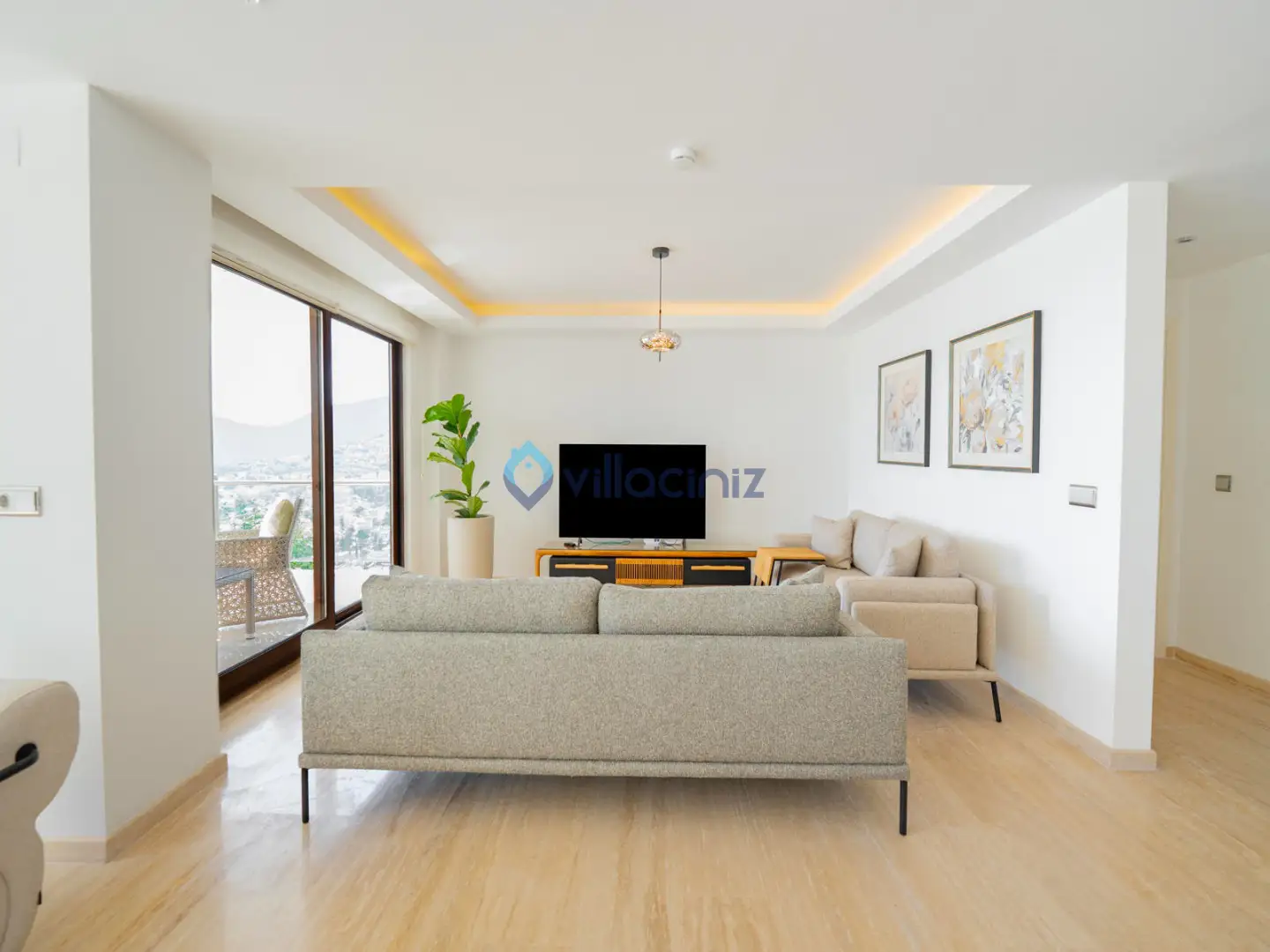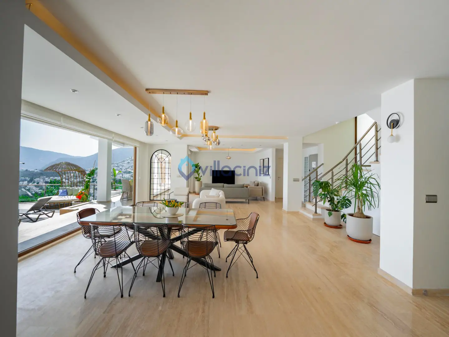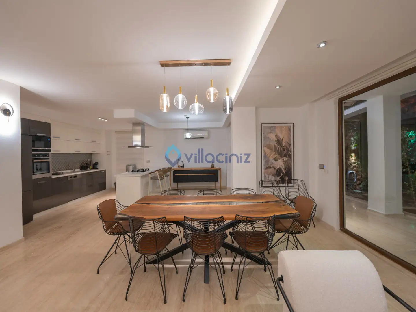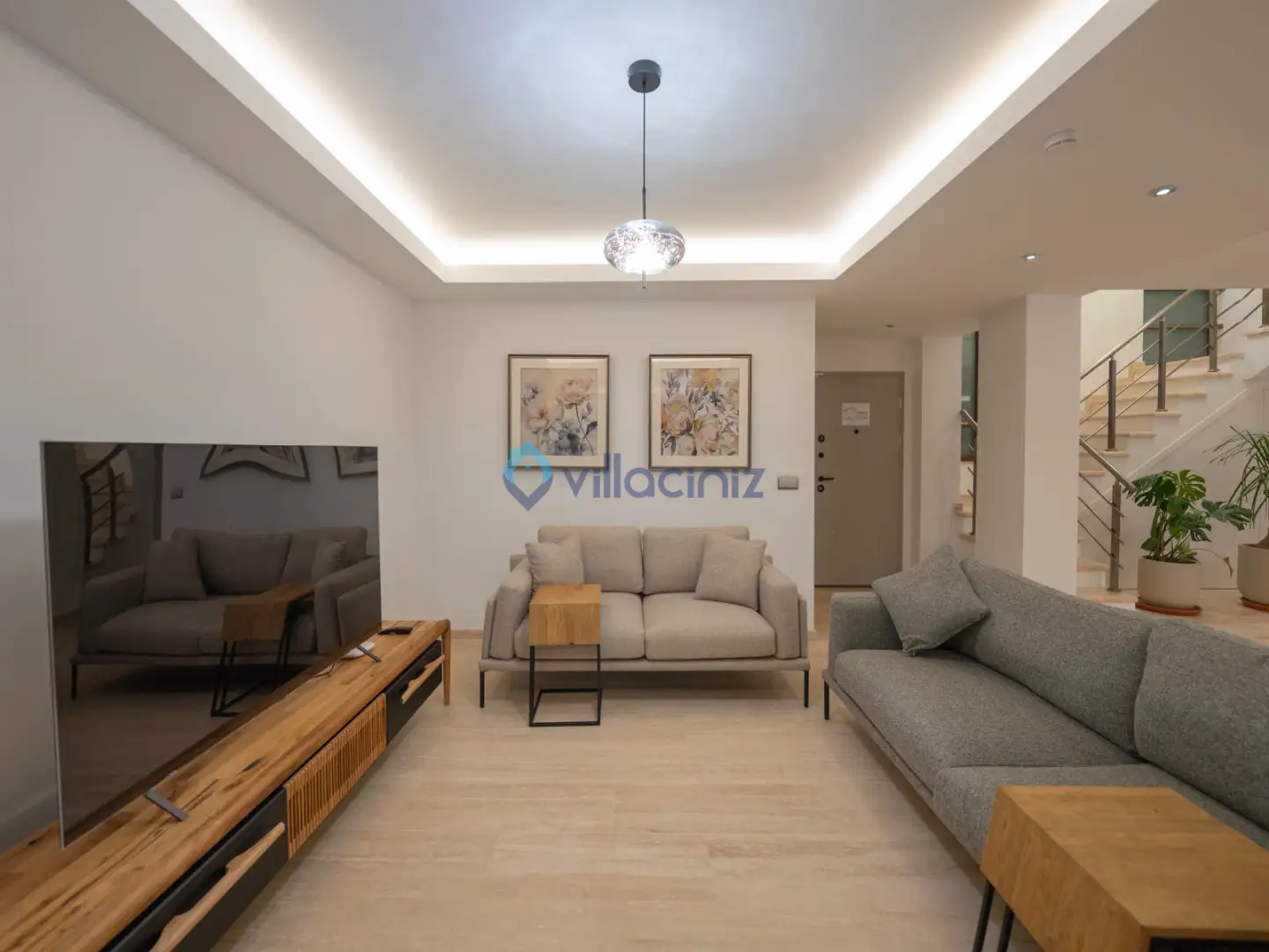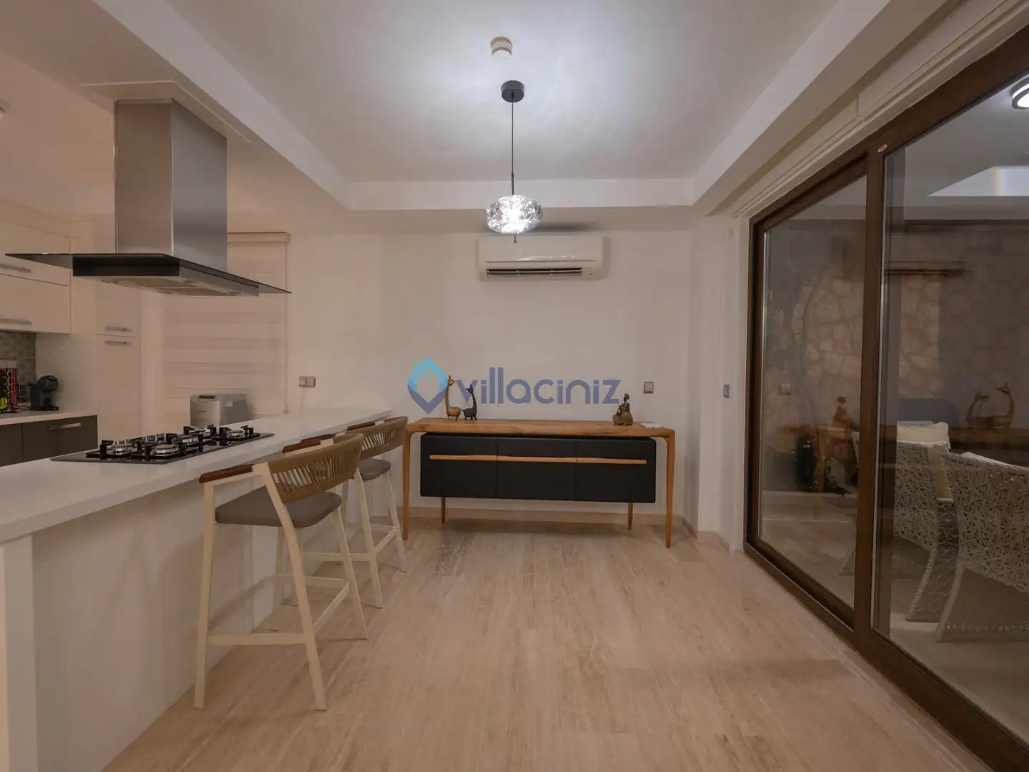 Modern oturma grubu, plazma televizyon uydu alıcısı, klima, orta sehpa, yemek masası ve havuz terasına çıkış bulunmaktadır.