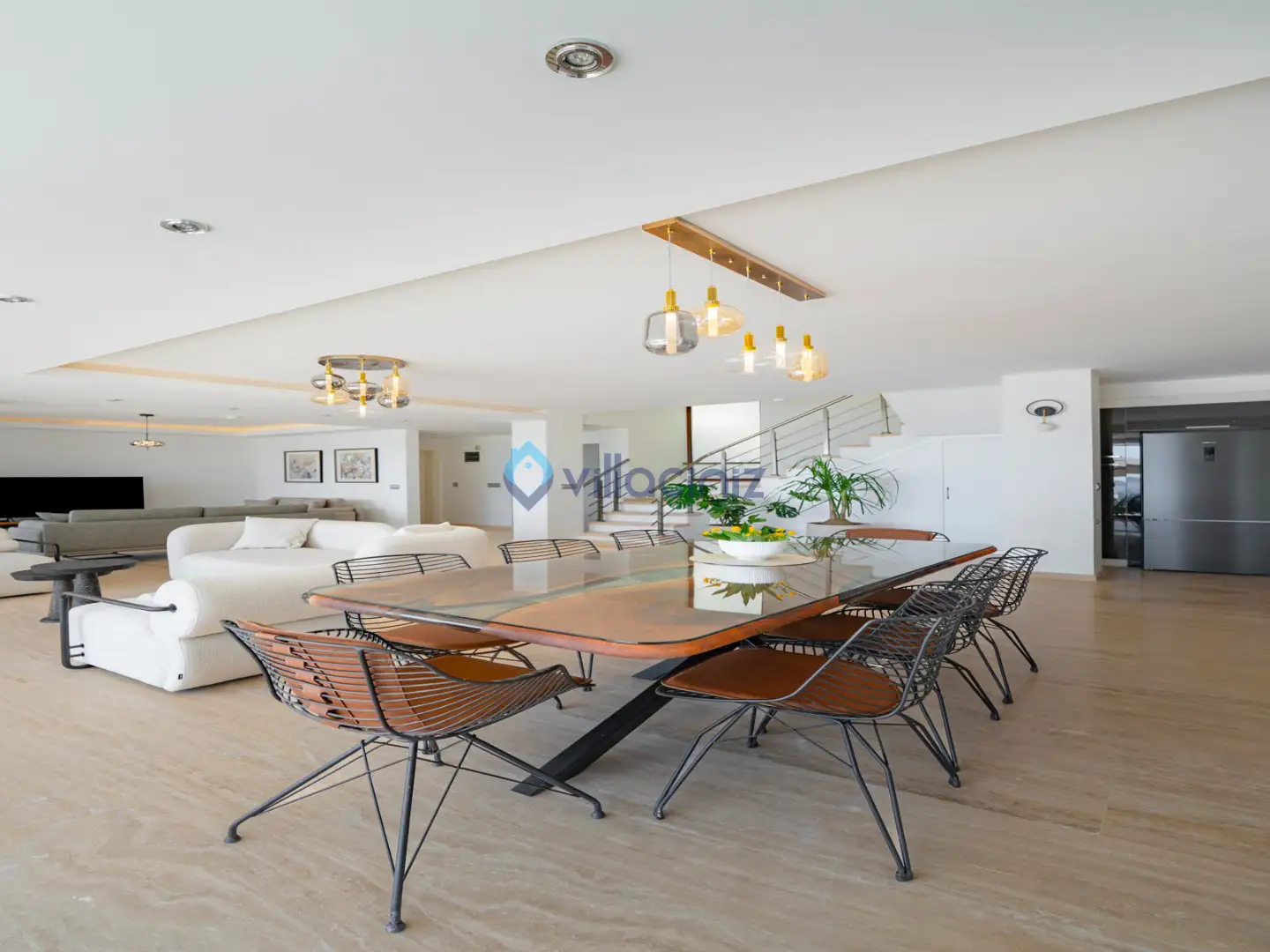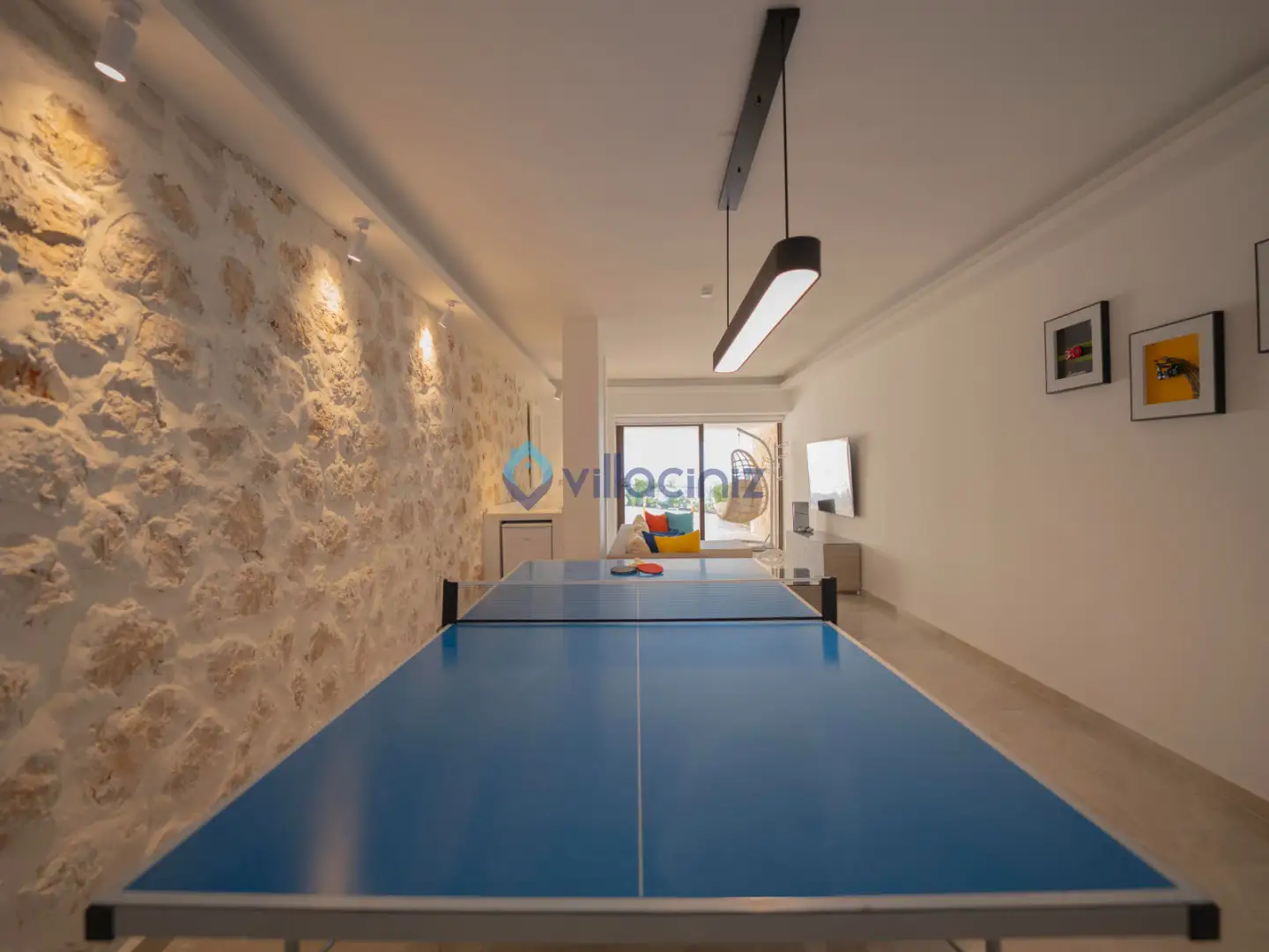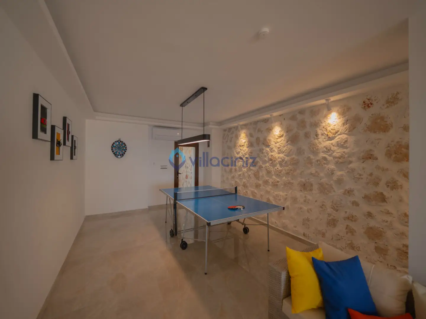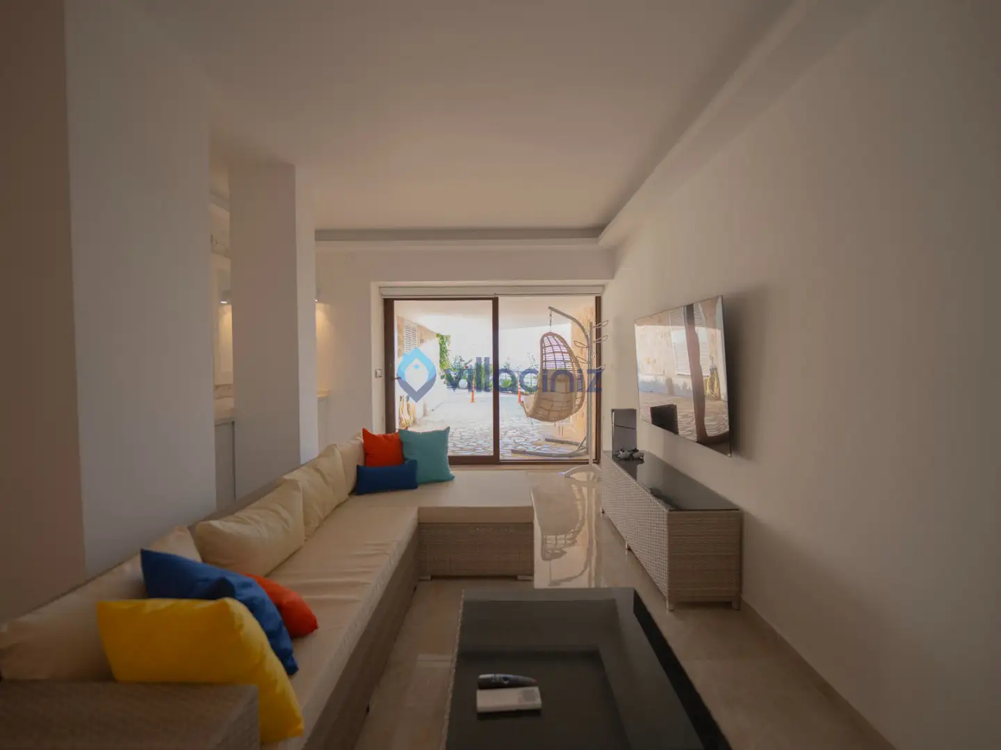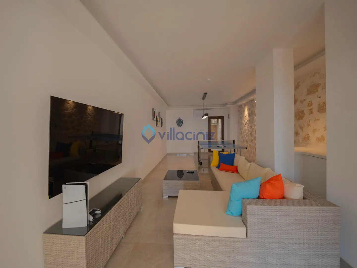 Modern oturma grubu, plazma televizyon uydu alıcısı, klima, orta sehpa, yemek masası ve havuz terasına çıkış bulunmaktadır.