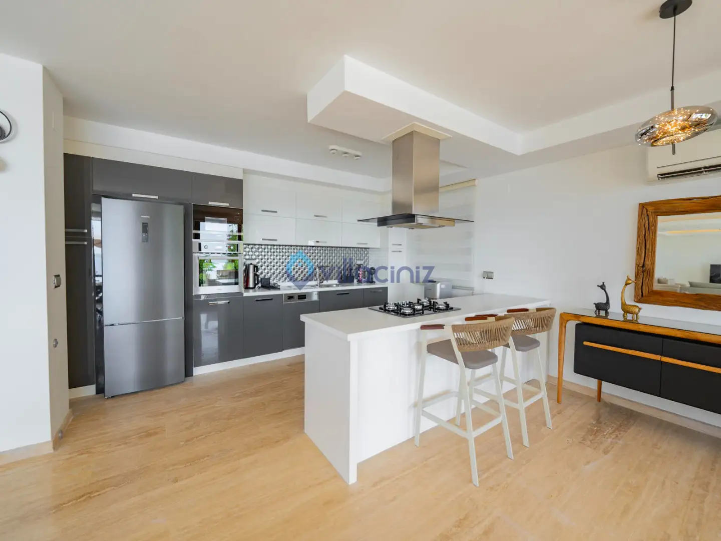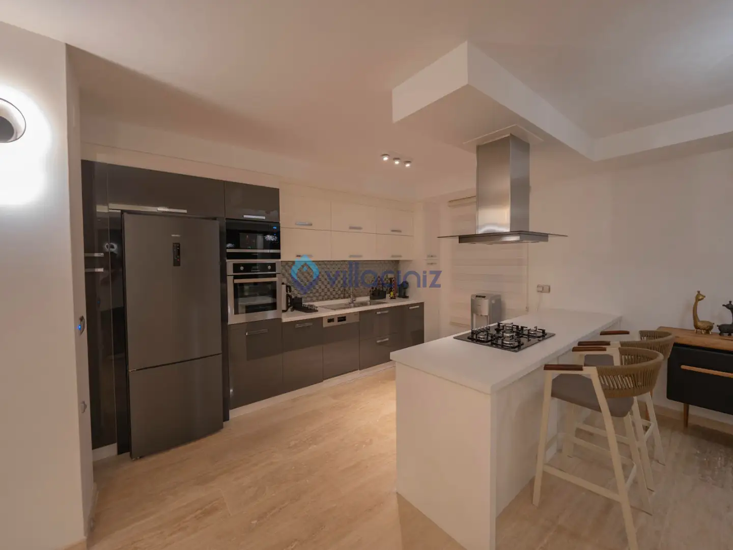 Modern Amerikan mutfak, buzdolabı, çamaşır makinesi, bulaşık makinesi, fırın, 4'lü ocak, temel mutfak araç gereçleri ve yemek masası bulunmaktadır.