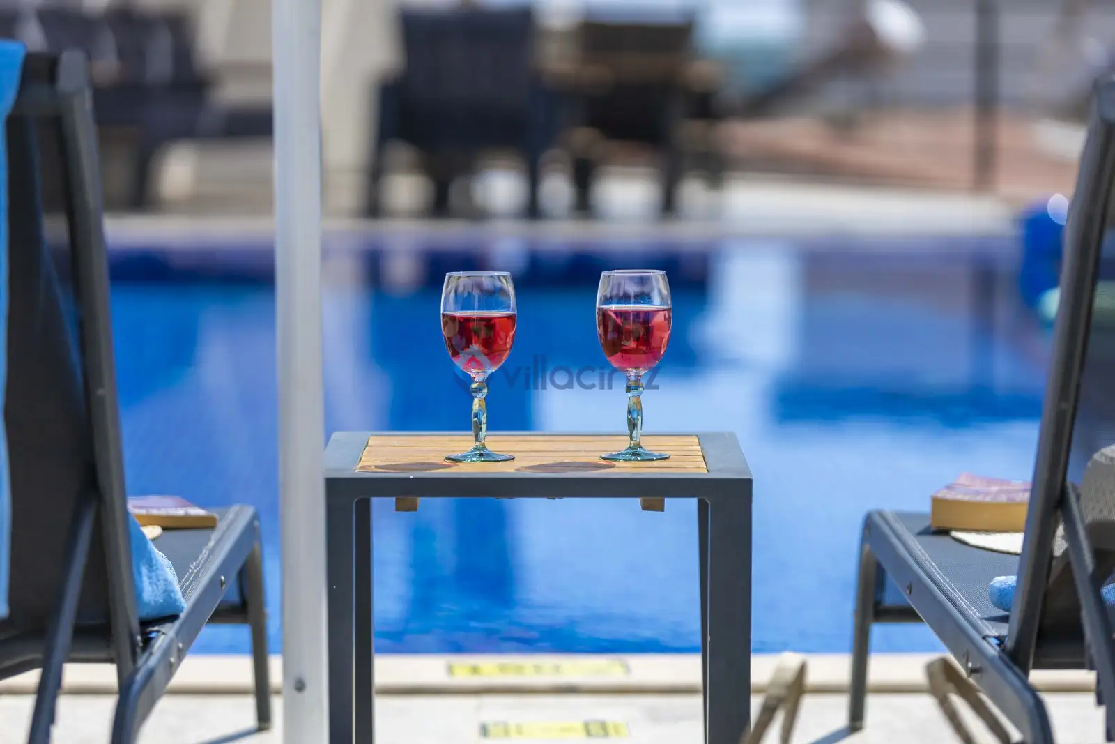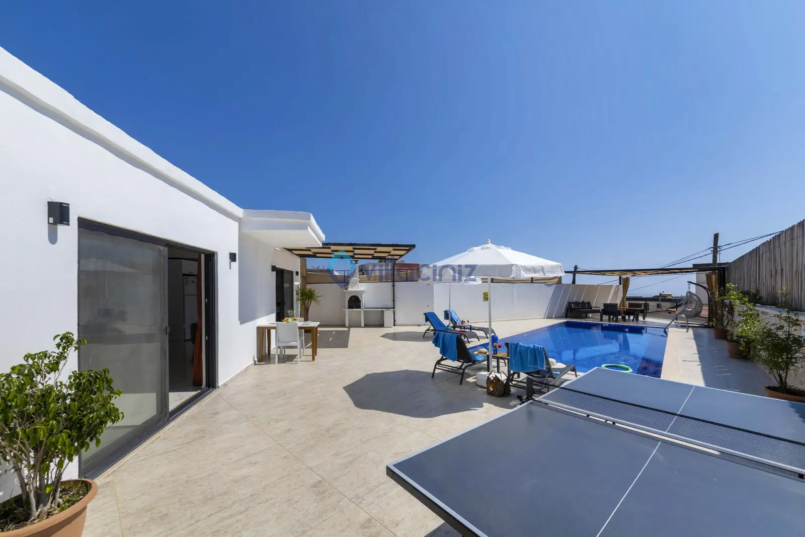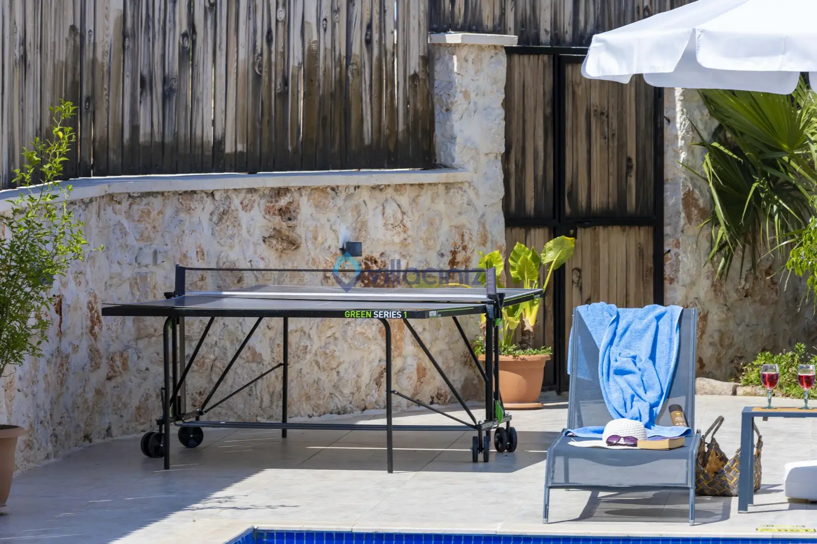 Korunakli yüzme havuzu, şezlong, şemsiye, masa ve sandalye, masa tenisi, mangal bulunmaktadır.