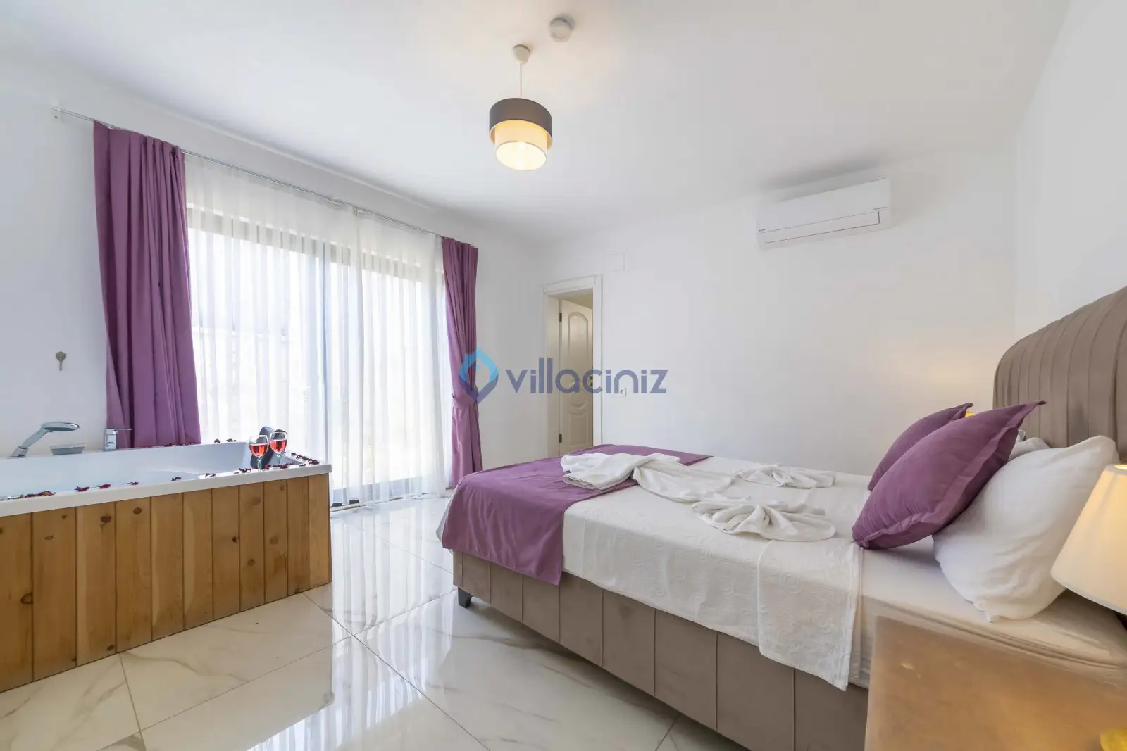 Yatak odası: 1 adet çift kişilik yatak, elbise dolabı, makyaj masası, komodin, klima, jakuzi, banyo ve tuvalet bulunmaktadır.