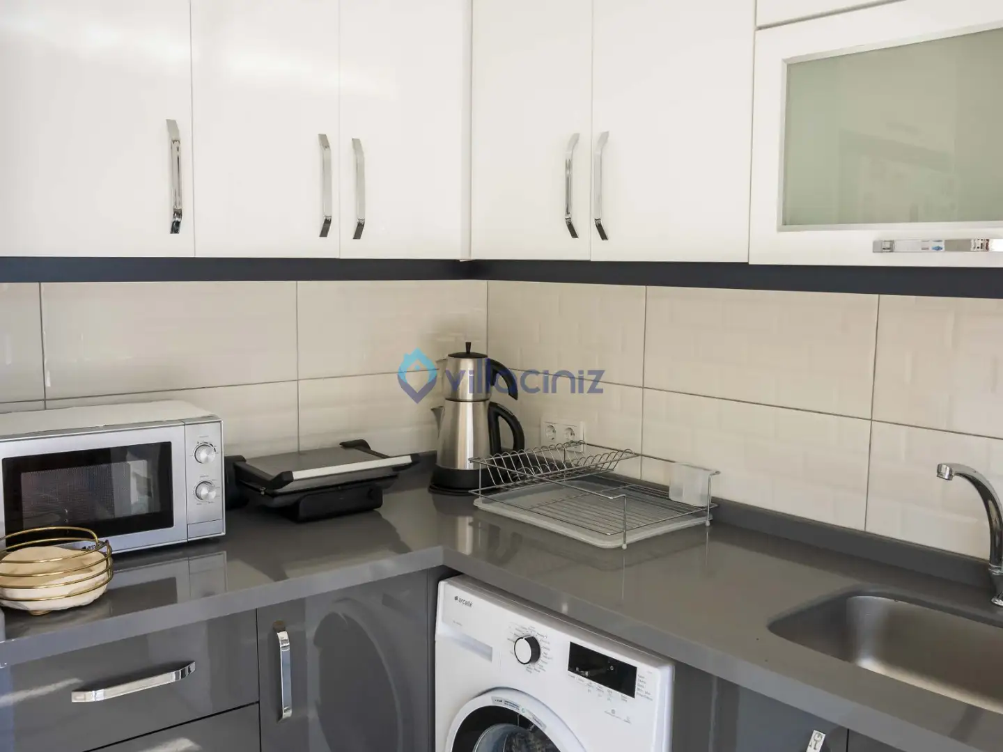 Modern Amerikan Mutfak, buzdolabı, çamaşır makinesi, bulaşık makinesi, ankastre fırın, mikrodalga fırın, 4'lü ocak, elektrikli su ısıtıcısı, yemek takımı, çatal bıçak seti, tavalar, tencereler, bardaklar bulunmaktadır.