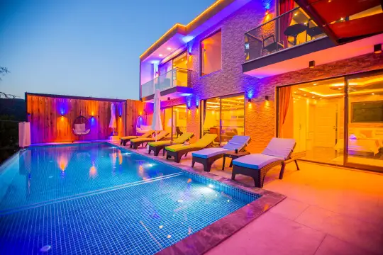 Kalkan Sarıbelen bölgesinde doğa manzarasına sahip 3 Yatak Odalı 6 Kişilik Özel Yüzme Havuzlu, Saunalı ve Türk Hamamlı Muhafazakar Kiralık modern bir villamızdır. Balayı çiftleri ve çocuklu aileler için geniş havuz terasında ve geniş bahçe alanında sessiz ve sakin rahat bir tatil arzulayan misafirlerimiz için bu villa seçeneğimiz son derece yerinde bir karar olacaktır. Villamızın tüm yatak odalarından havuz terasına çıkış bulunmaktadır.