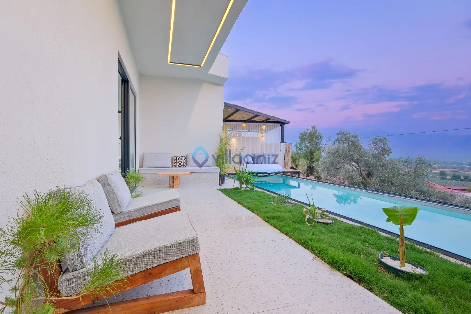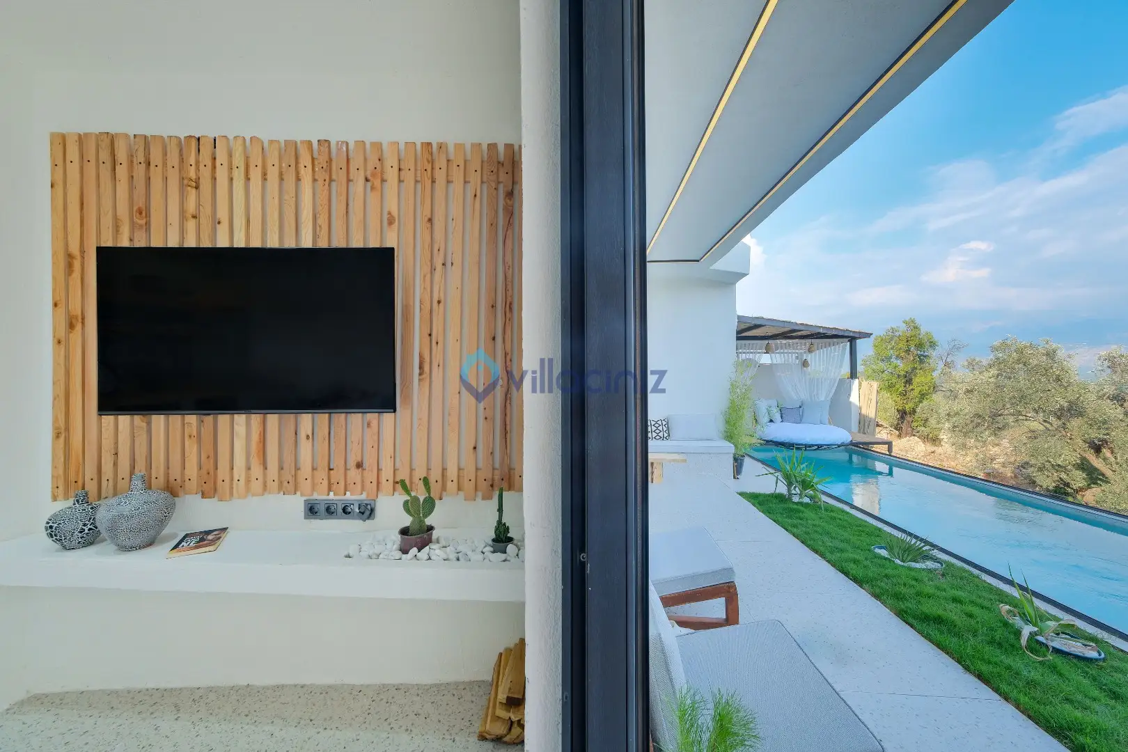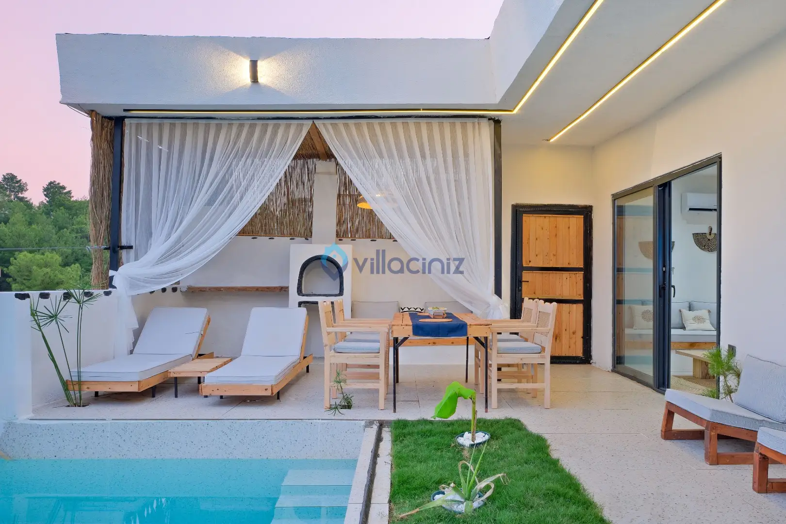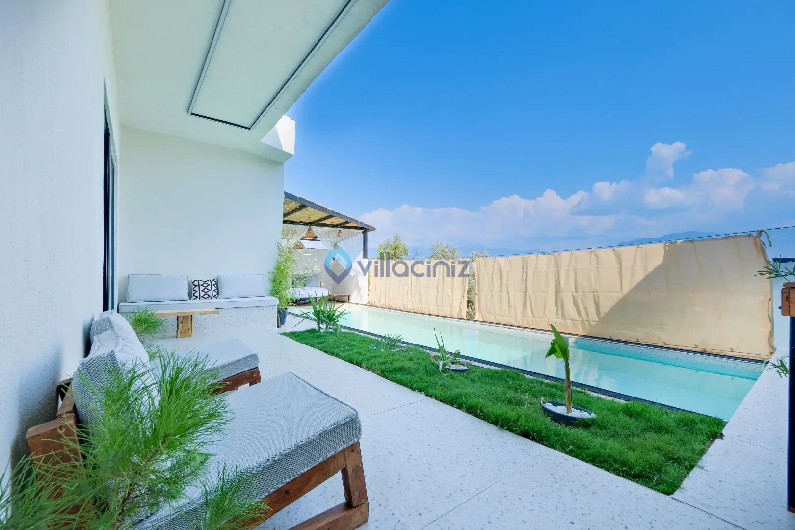 Not: Villanın güneşlenme terası ve havuzunun dış taraftan görünmemesi için gerekli önlemler alınmıştır fakat villanın diğer bölümlerinin görünürlüğü kesin olarak garanti edilememektedir.