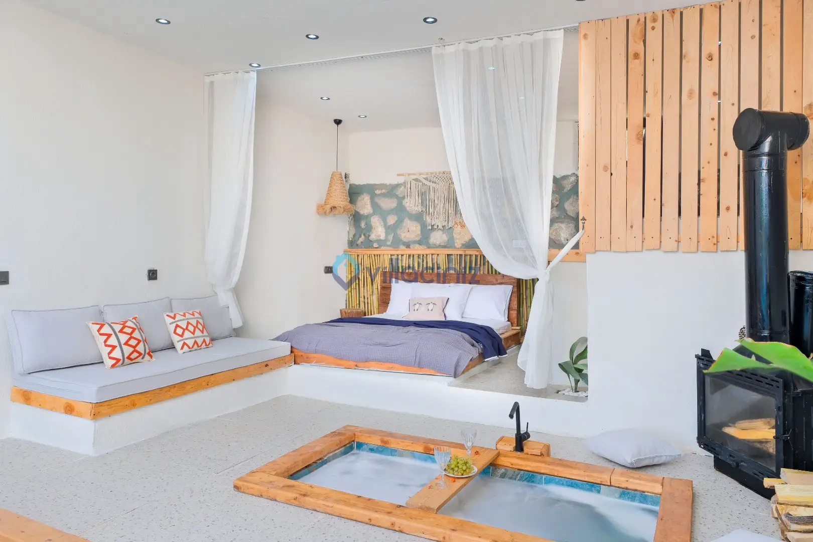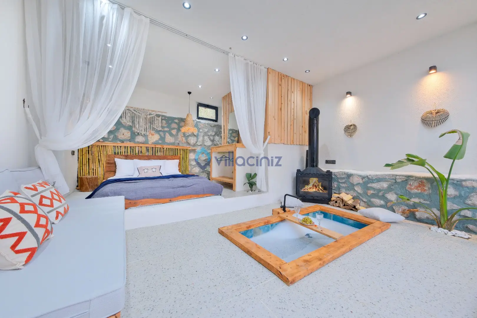 1. Yatak odası: Çift kişilik yatak, makyaj masası,klima, elbise dolabı, komodin, jakuzi, kapalı havuz, şömine, tuvalet, banyo bulunmaktadır.