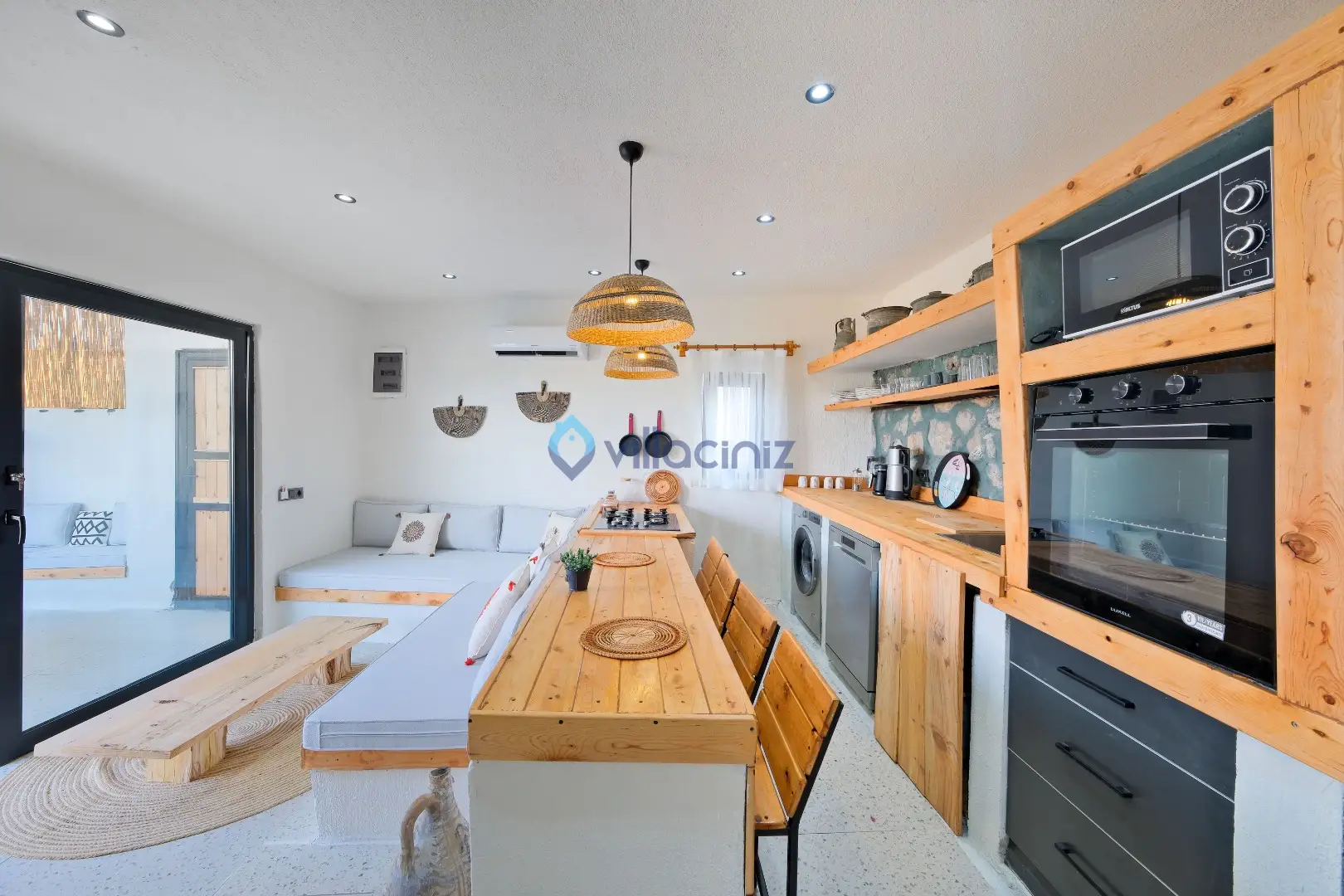 Amerikan mutfak, bulaşık makinesi, buzdolabı, çamaşır makinası, çaycı, fırın, mikrodalga fırın, ocak, su ısıtıcısı ,yemek masası