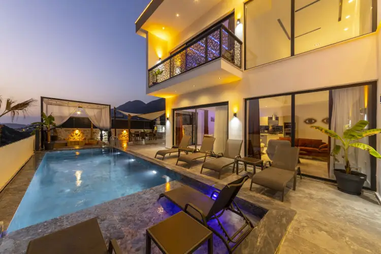 Kalkan Ordu bölgesinde bulunan Villa Firoza 4, kısmi deniz manzaralı, 6 kişi kapasiteli 3 yatak odalıdır. Lüks şekilde dizayn edilmiş villamız da çift jakuzi ve kapalı havuz mevcuttur. Villa Firoza 4, muhafazakar aileler, kalabalık arkadaş grupları, geniş aileler için ideal bir seçenek olacaktır. Havuz alanı perdeleme sistemi ile muhafazakar hale getirilmiştir. Villa Firoza 4'te özel yüzme havuzu, salıncak, barbekü alanı, çocuk oyun alanı mevcut olup lüks ve modern dizayn edilmiştir. İhityacınız olan her şey düşünülmüştür, villamız Kalkan merkez bölgesinde 3 km mesafede yer almaktadır. Sevdiklerinizle ile birlikte unutulmaz tatil anıları biriktirebilir, havuz terasında çayınızı yudumlarken yılın yorgunluğunu atabilirsiniz.
