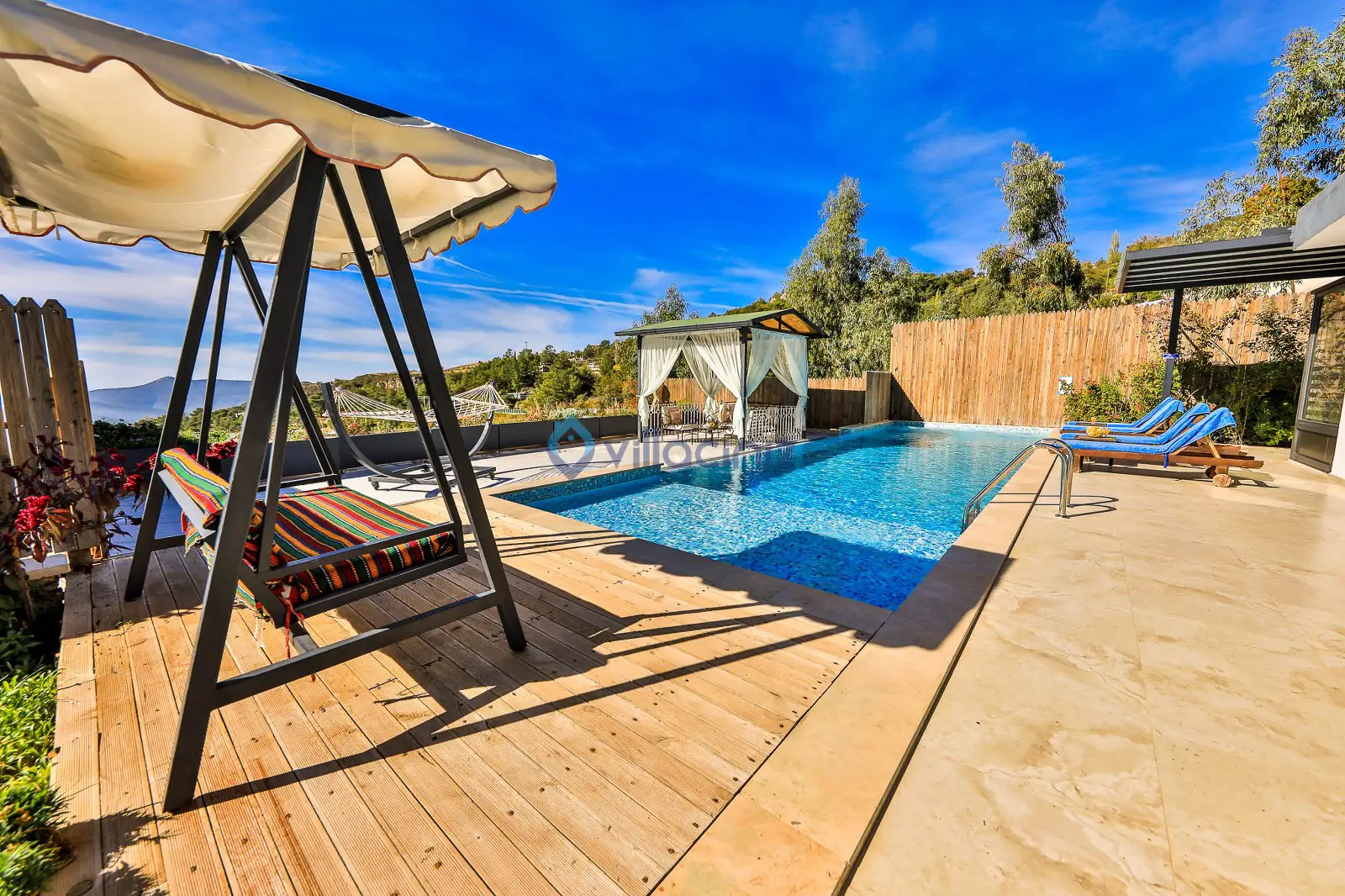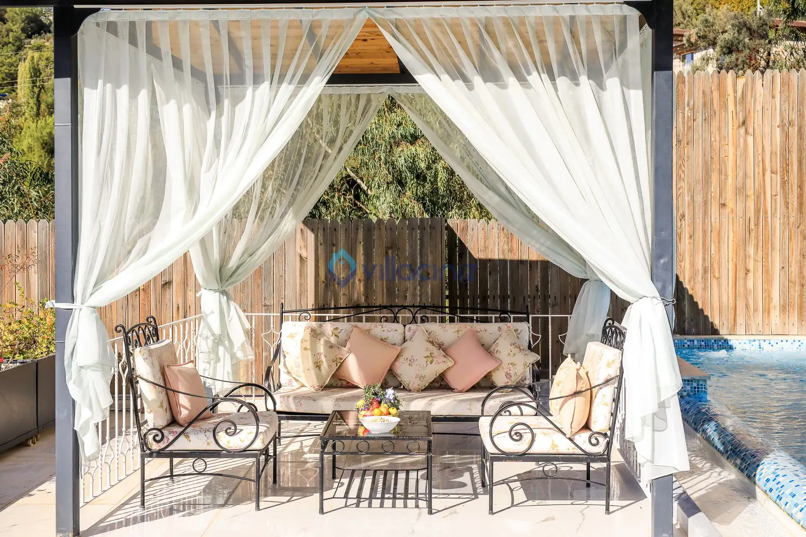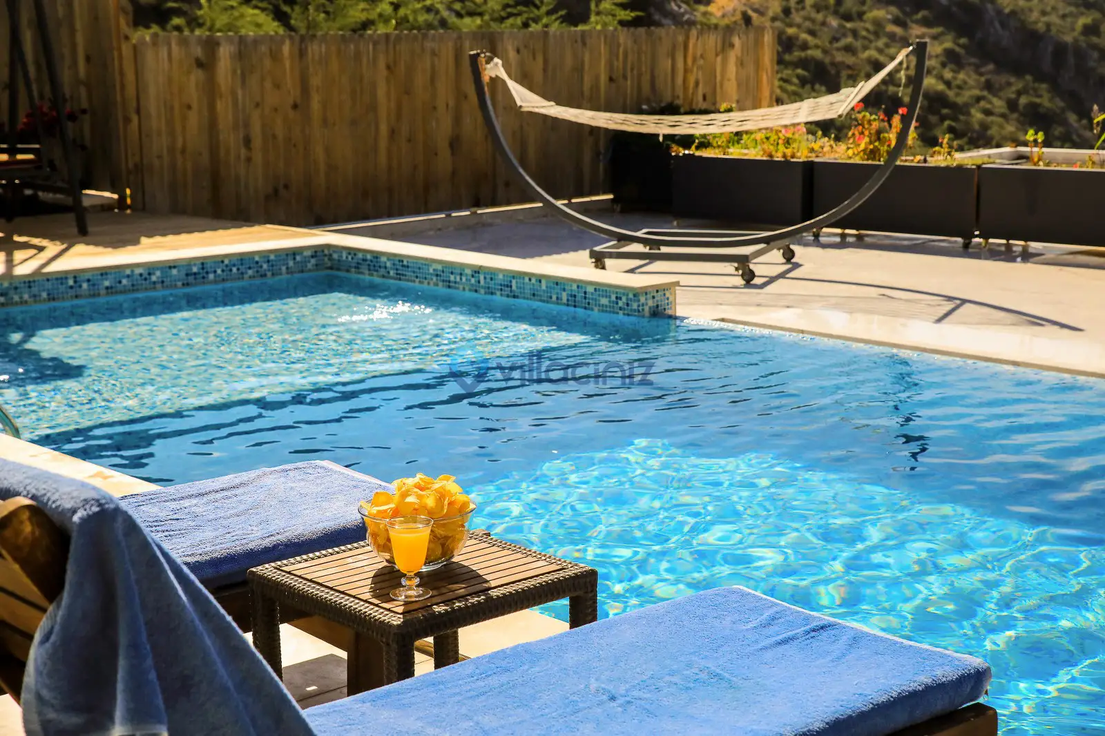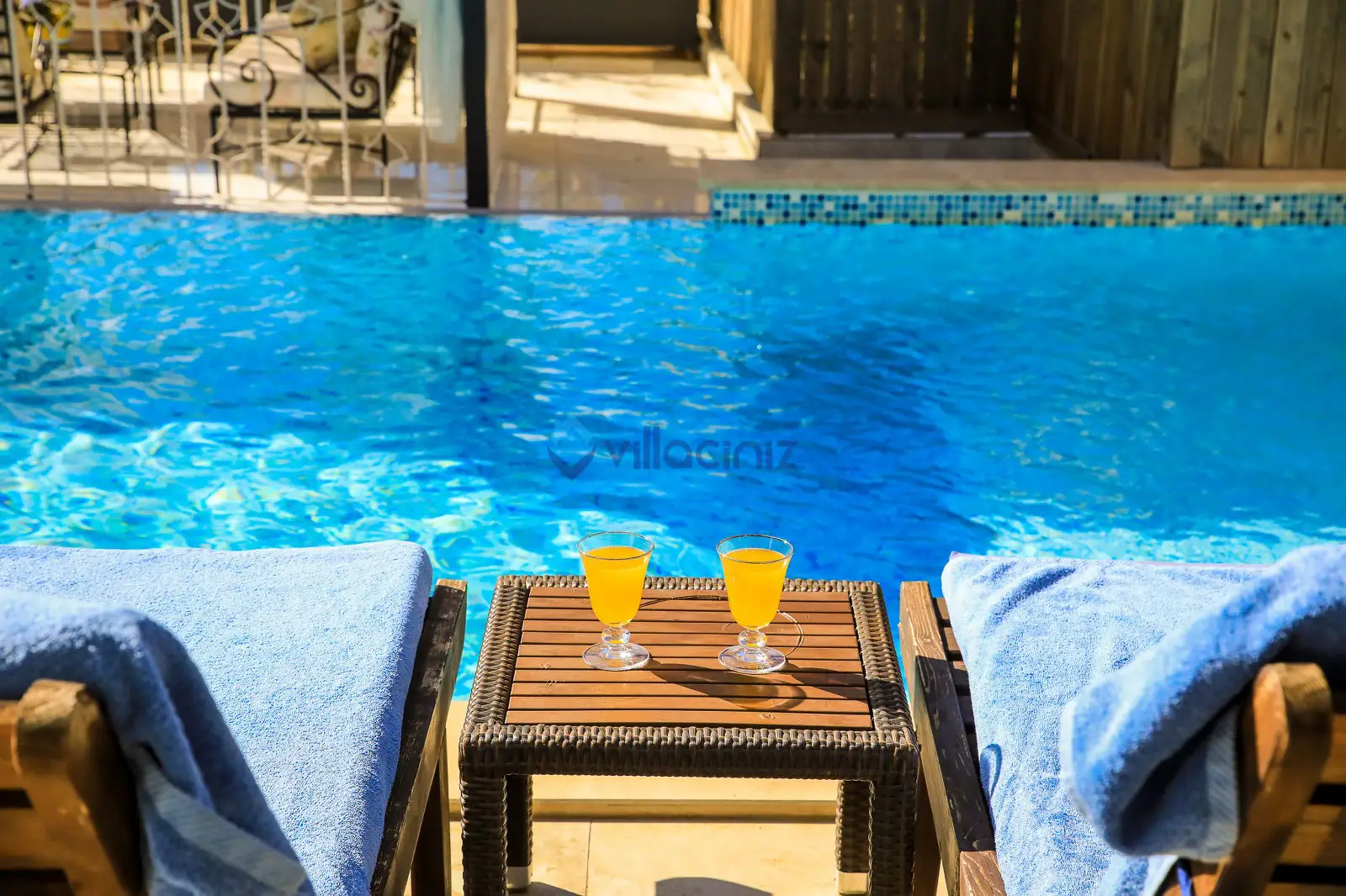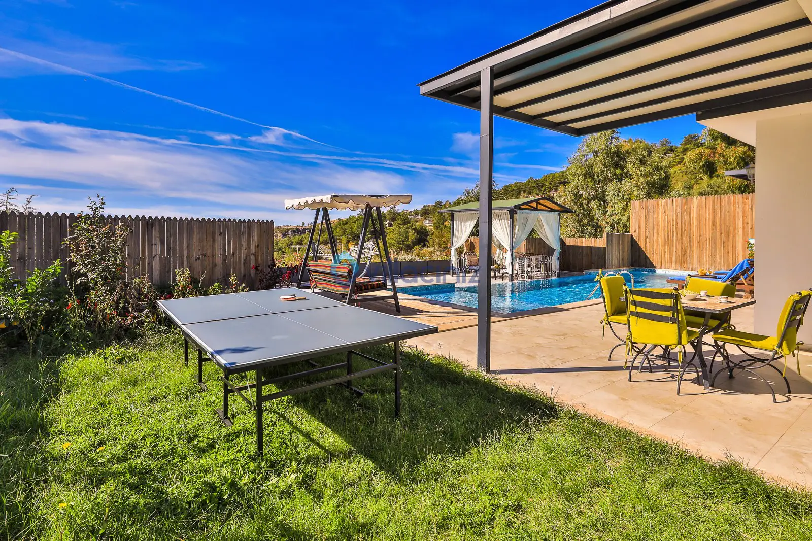 Bahçe içerisinde güneşlenme terası, özel yüzme havuzu, şezlonglar, güneş şemsiyesi, 4 kişilik bahçe yemek masası ve sandalyeler, salıncak ve mangal bulunmaktadır.