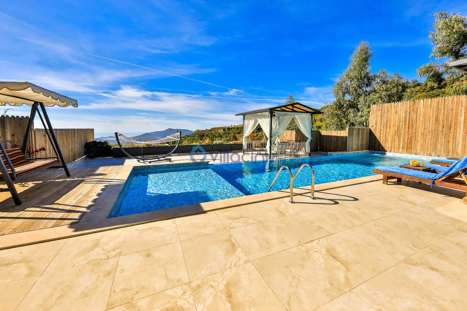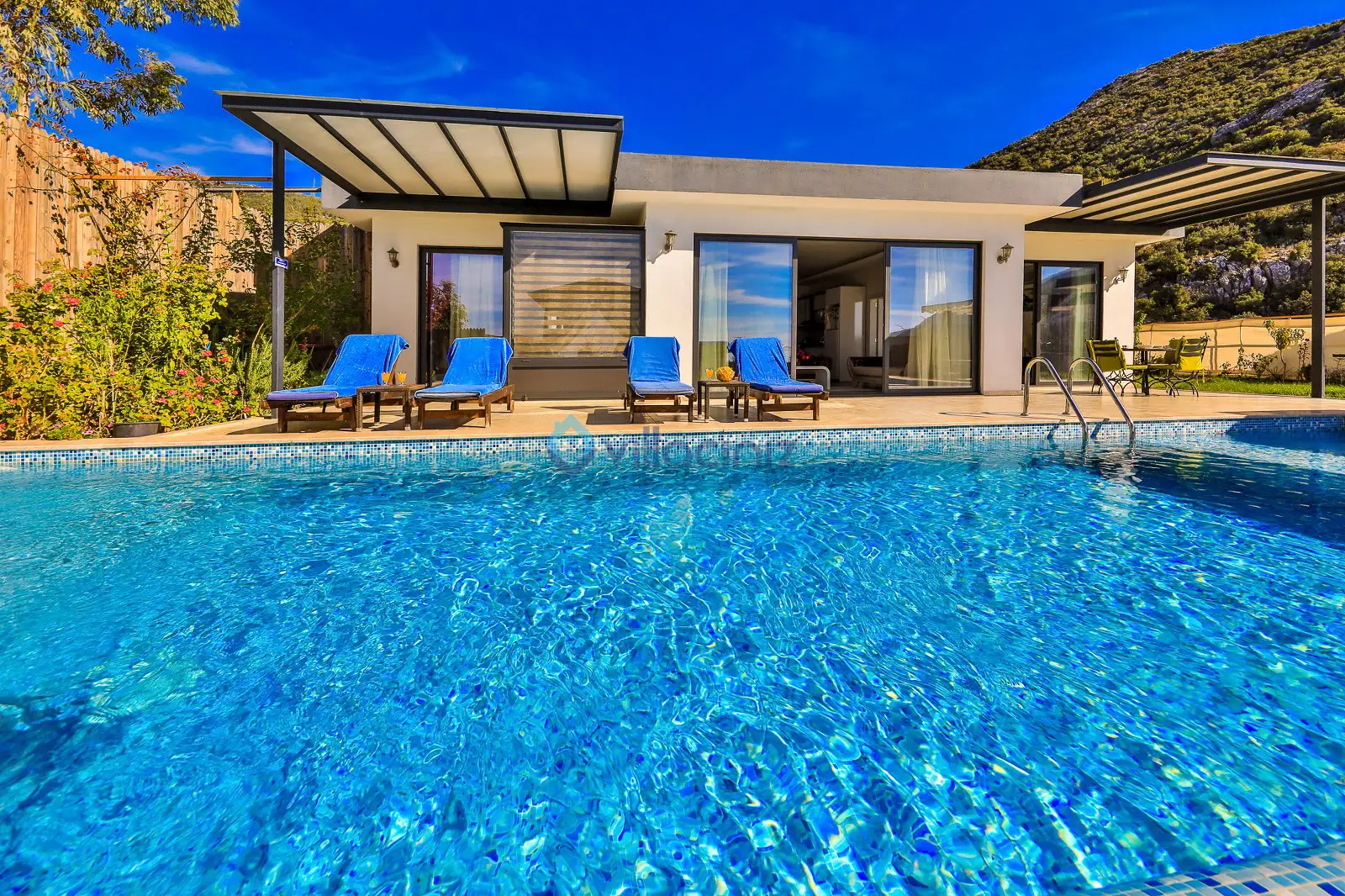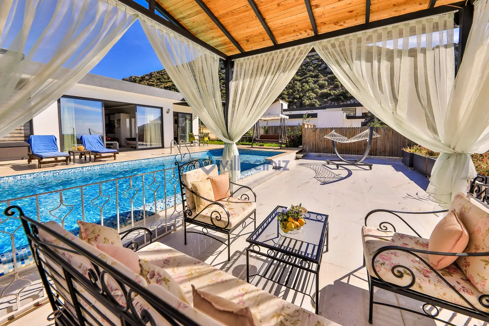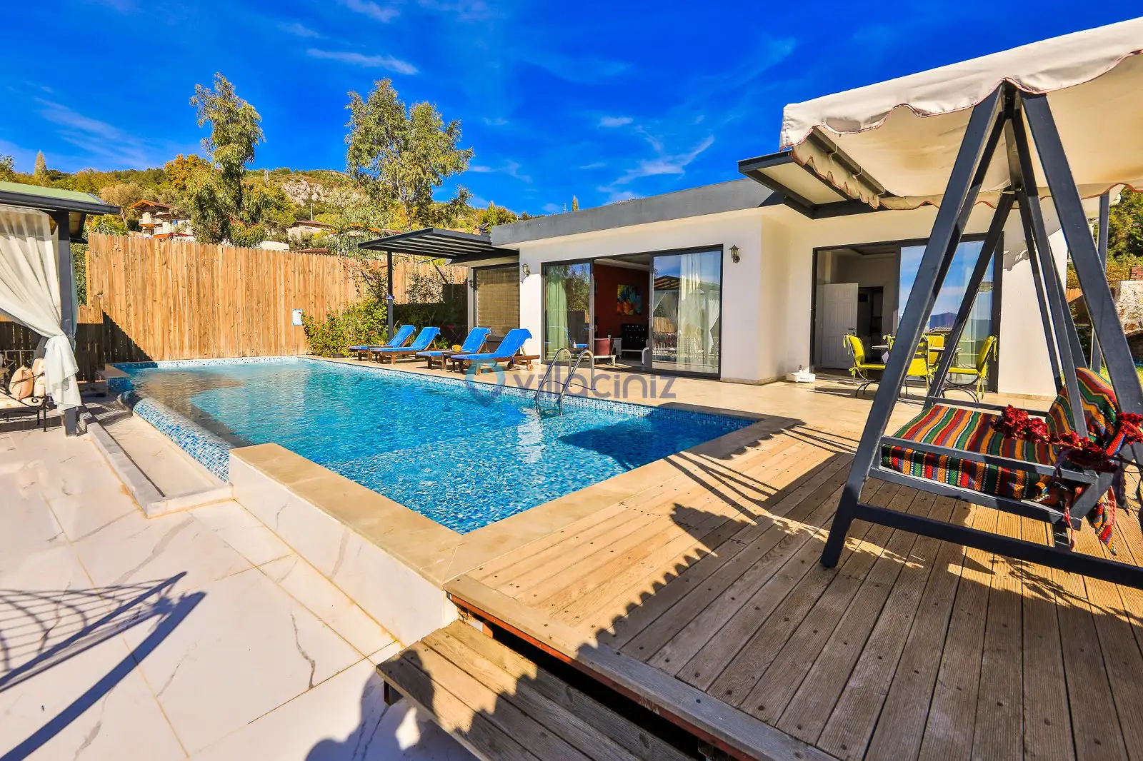 Bahçe içerisinde güneşlenme terası, özel yüzme havuzu, şezlonglar, güneş şemsiyesi, 4 kişilik bahçe yemek masası ve sandalyeler, salıncak ve mangal bulunmaktadır.