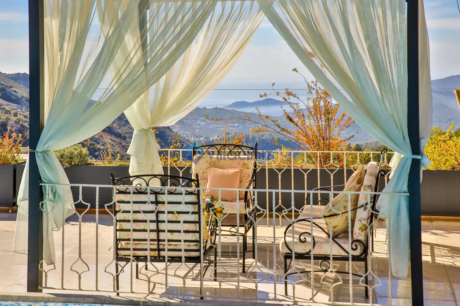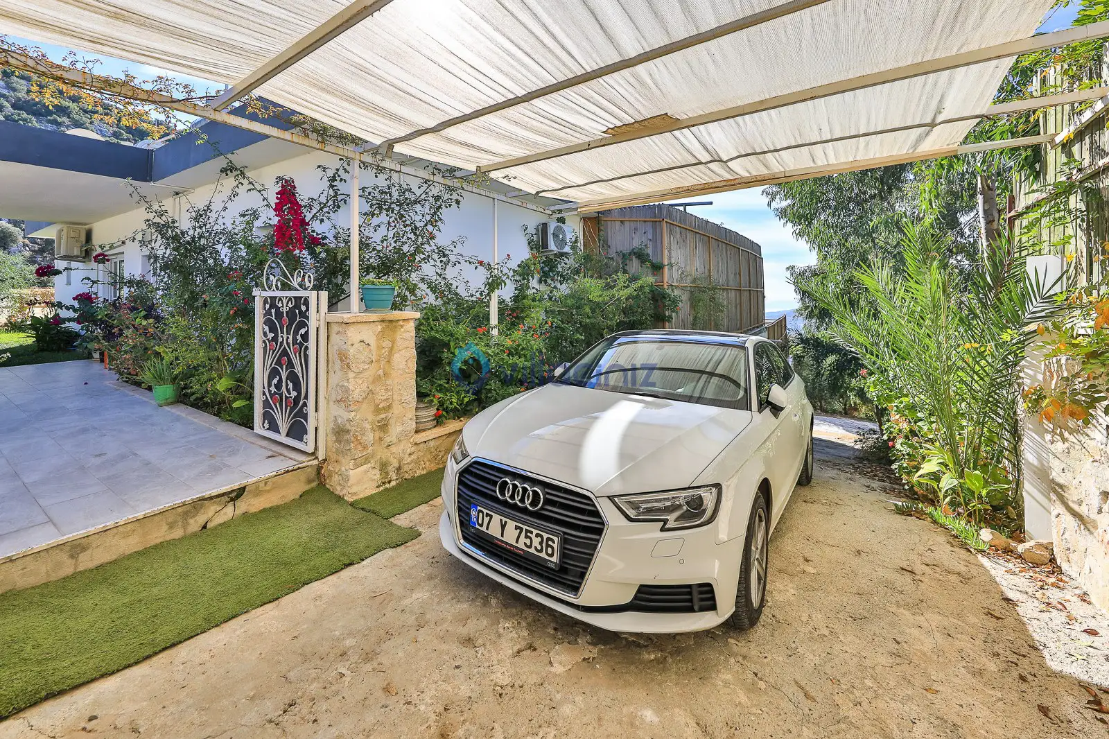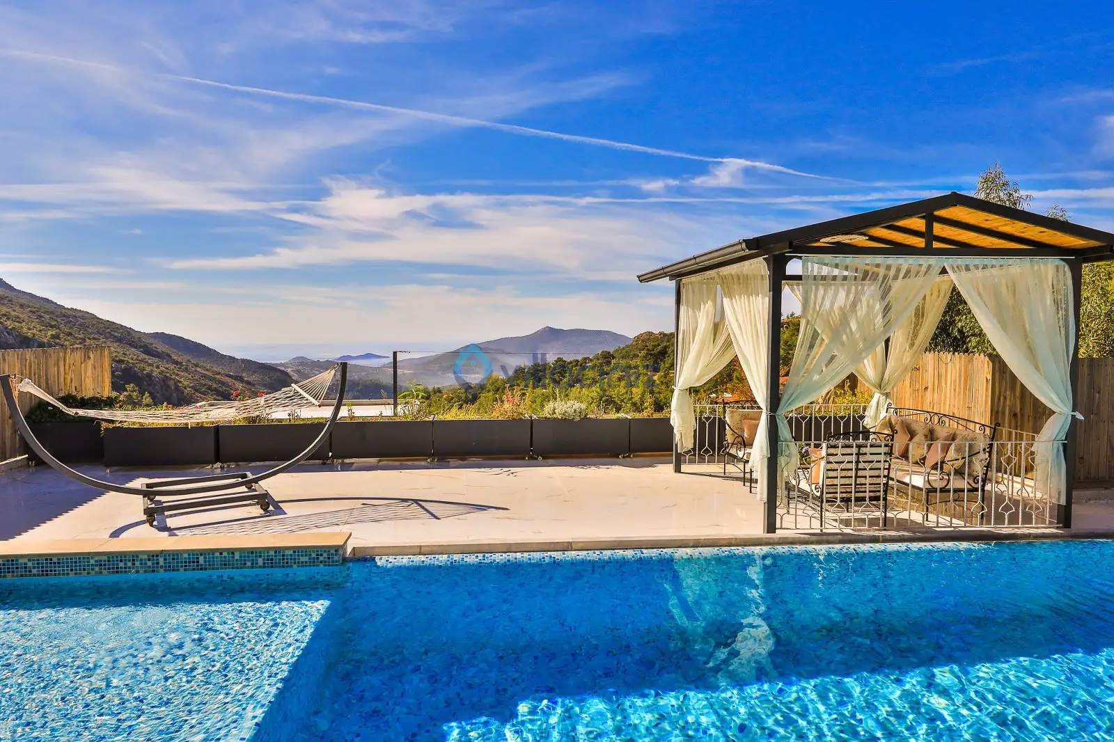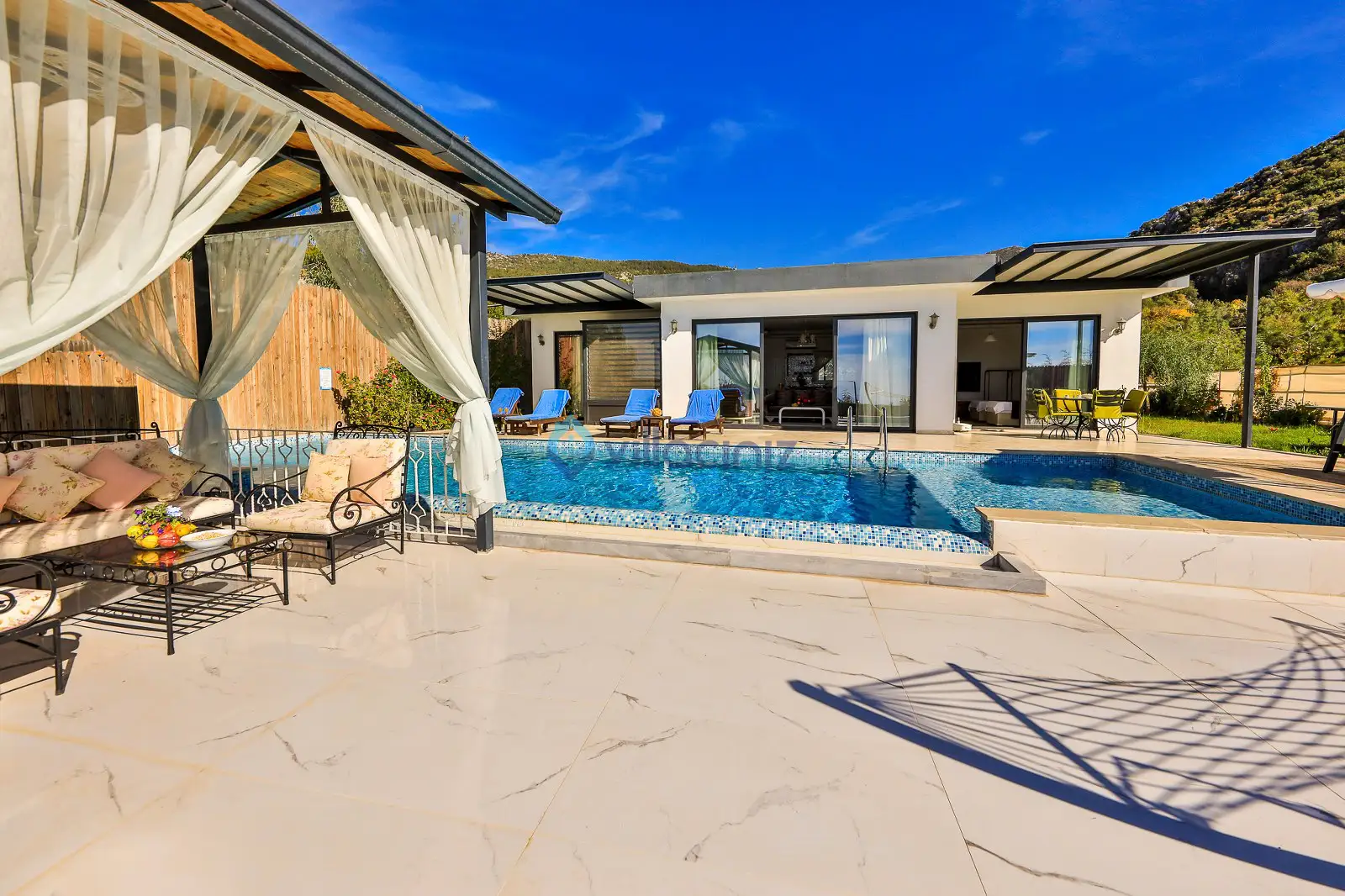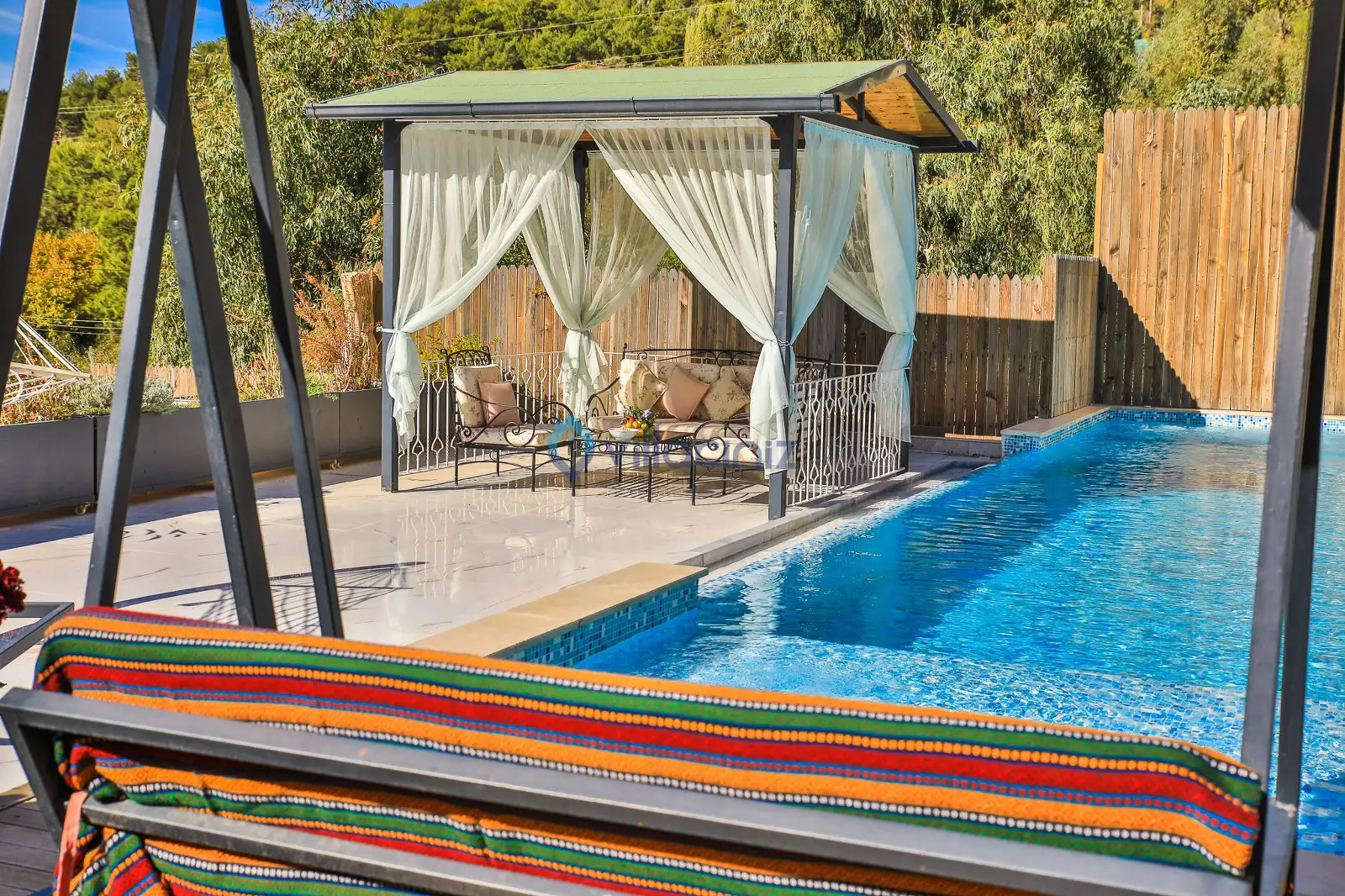 Bahçe içerisinde güneşlenme terası, özel yüzme havuzu, şezlonglar, güneş şemsiyesi, 4 kişilik bahçe yemek masası ve sandalyeler, salıncak ve mangal bulunmaktadır.
