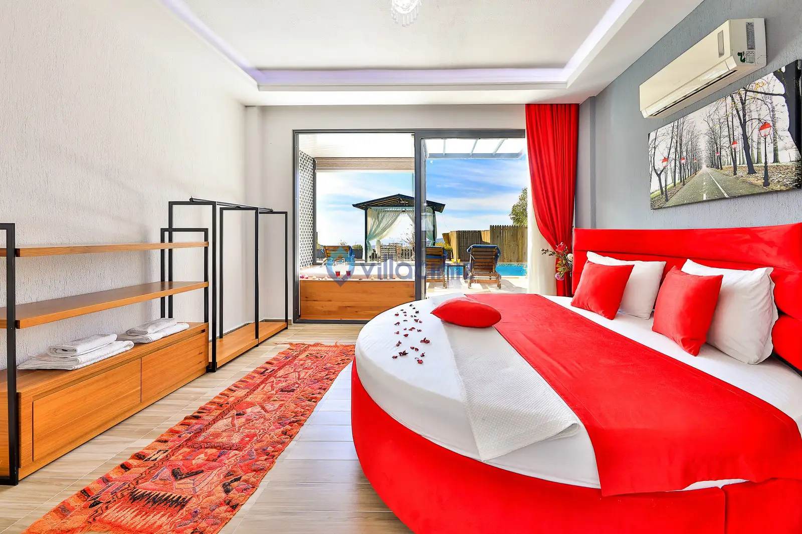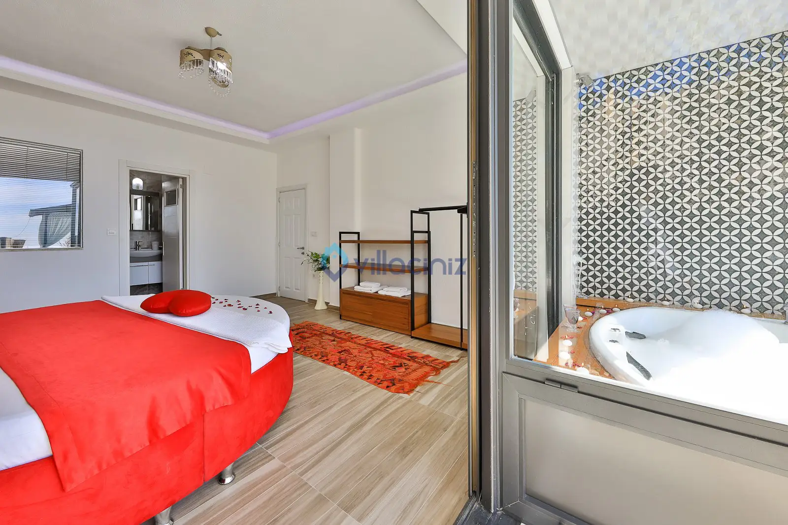 1. Yatak Odası: 1 adet çift kişilik yatak, klima, komodin, makyaj masası, elbise dolabı, jakuzi ve banyo tuvalet bulunmaktadır.