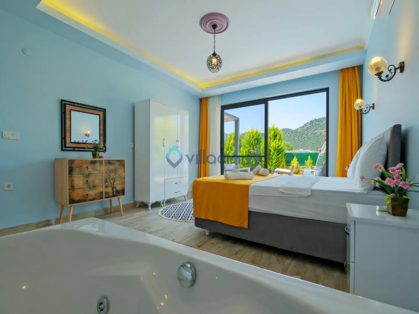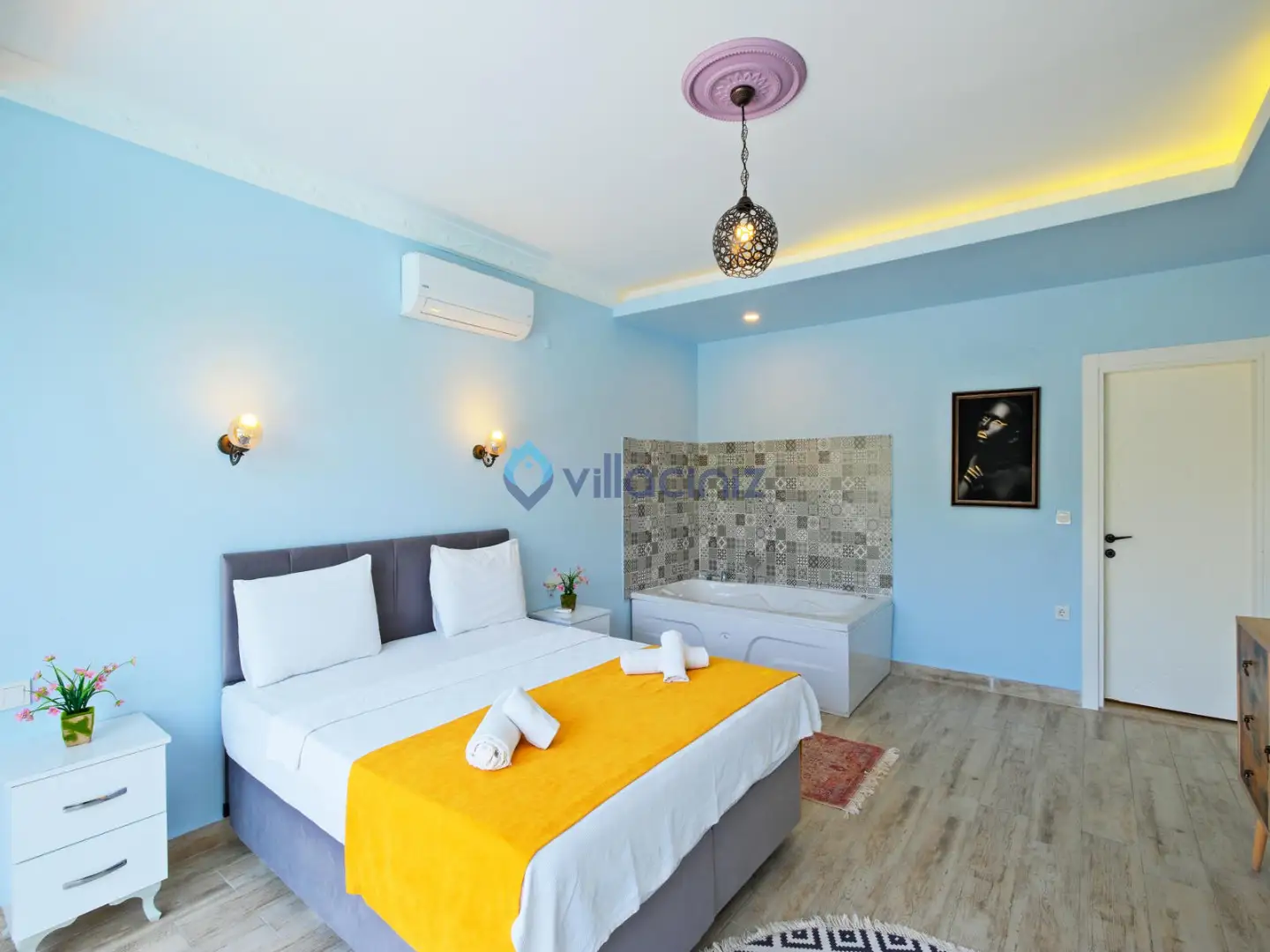Yatak odası 1: Çift kişilik yatak, klima, komodin, elbise dolabı, makyaj masası, banyo ve tuvalet bulunmaktadır.