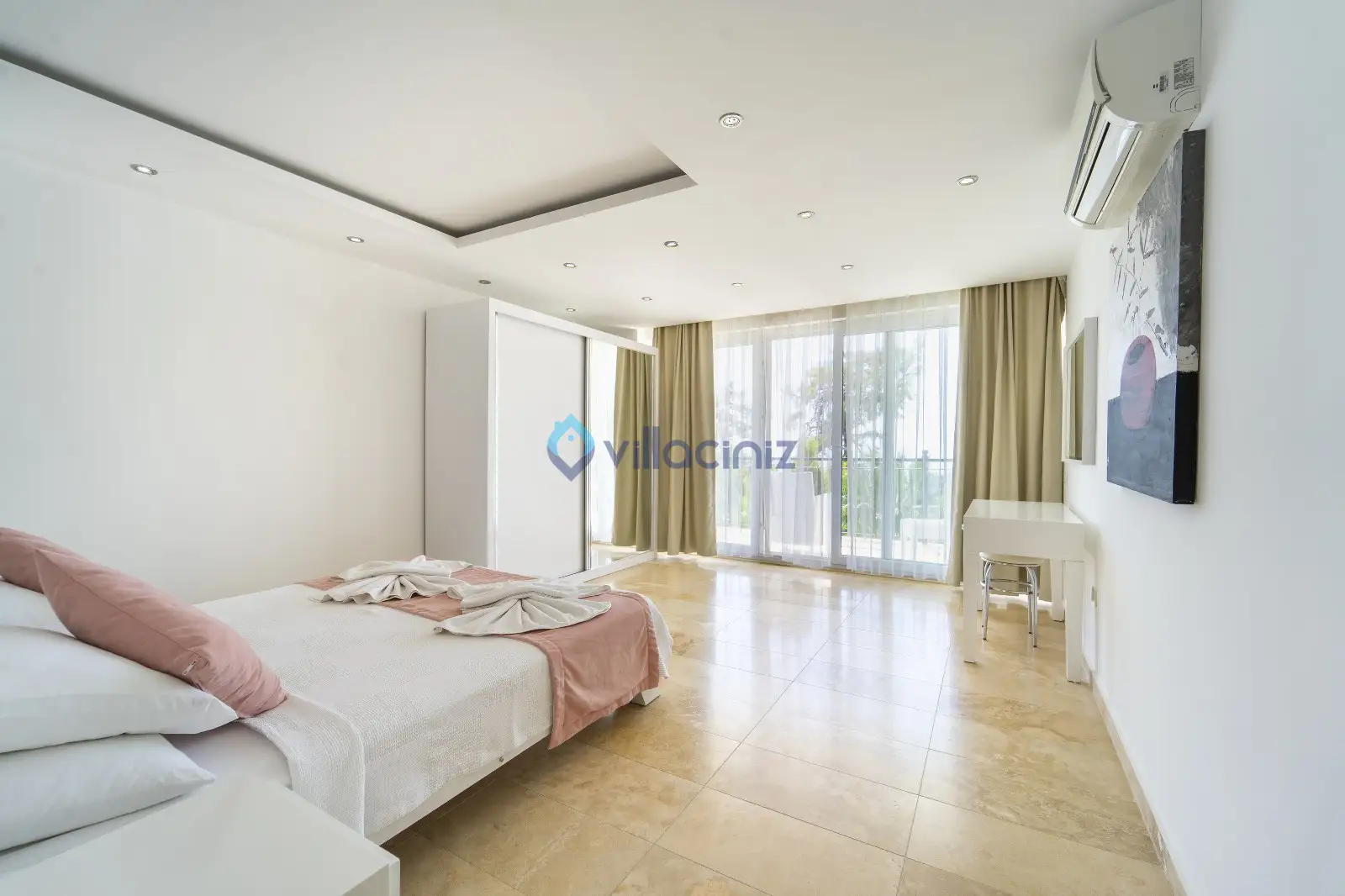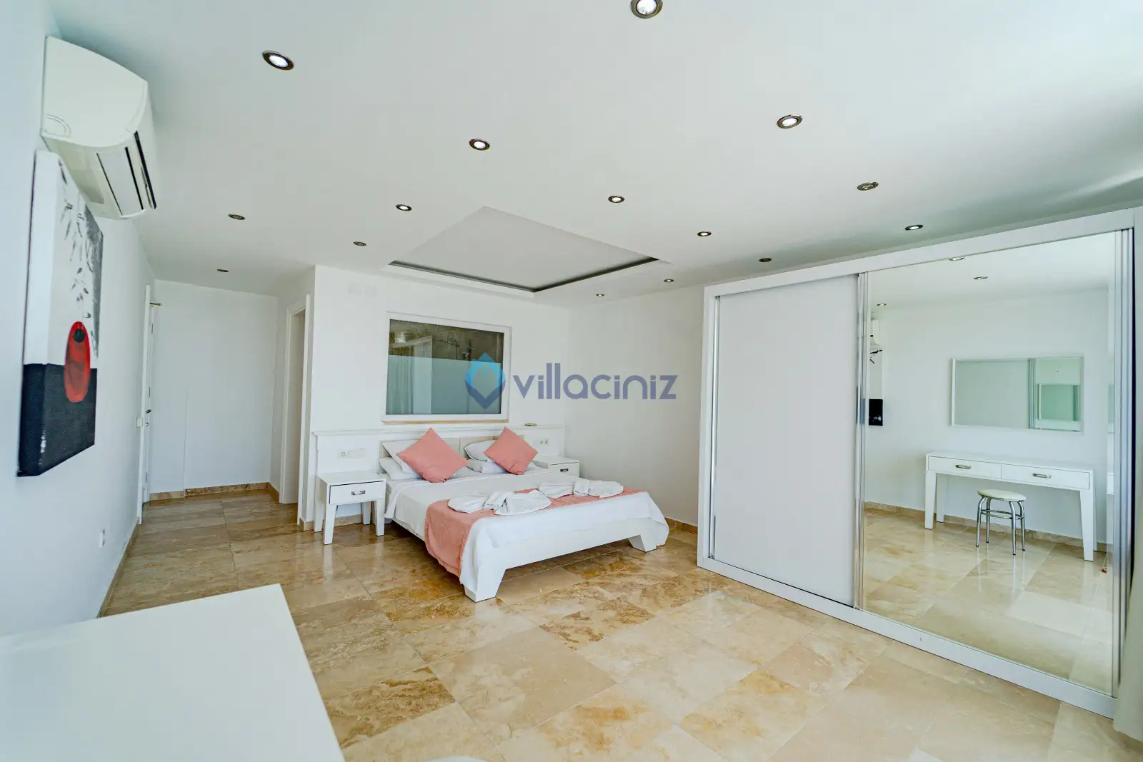 Yatak Odası 1: Suit doğa manzaralı odada çift kişilik yatak, komodin, klima, makyaj masası, elbise dolabı, ebeveyn banyosu bulunmaktadır.