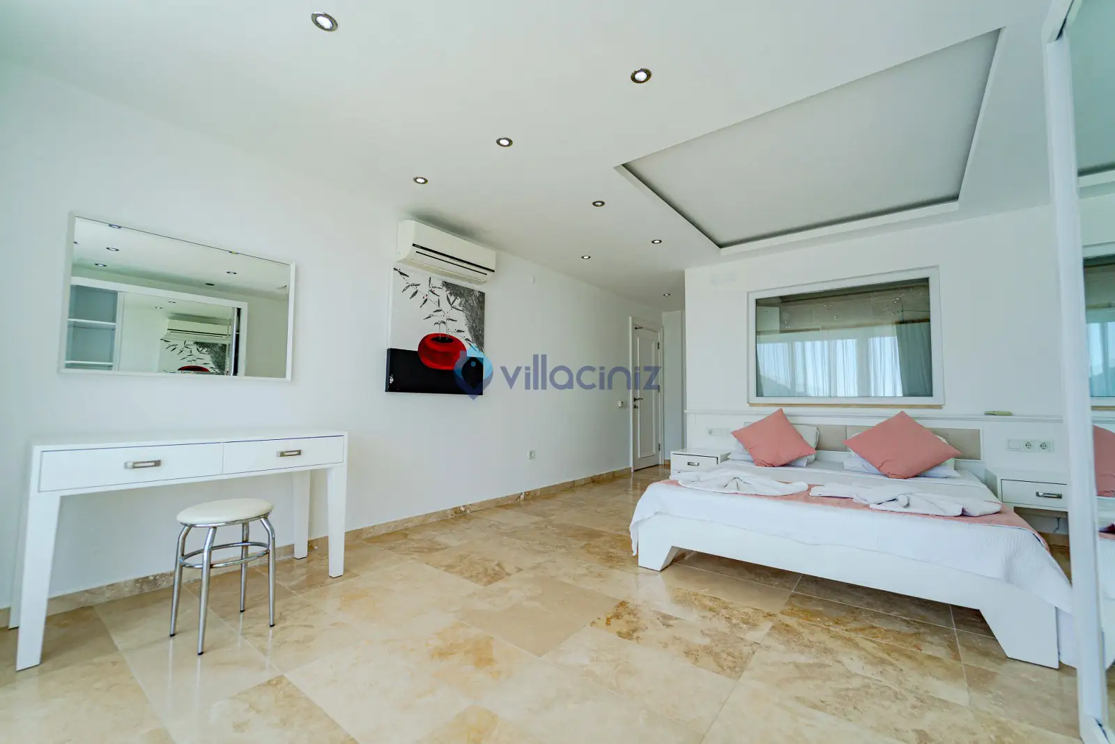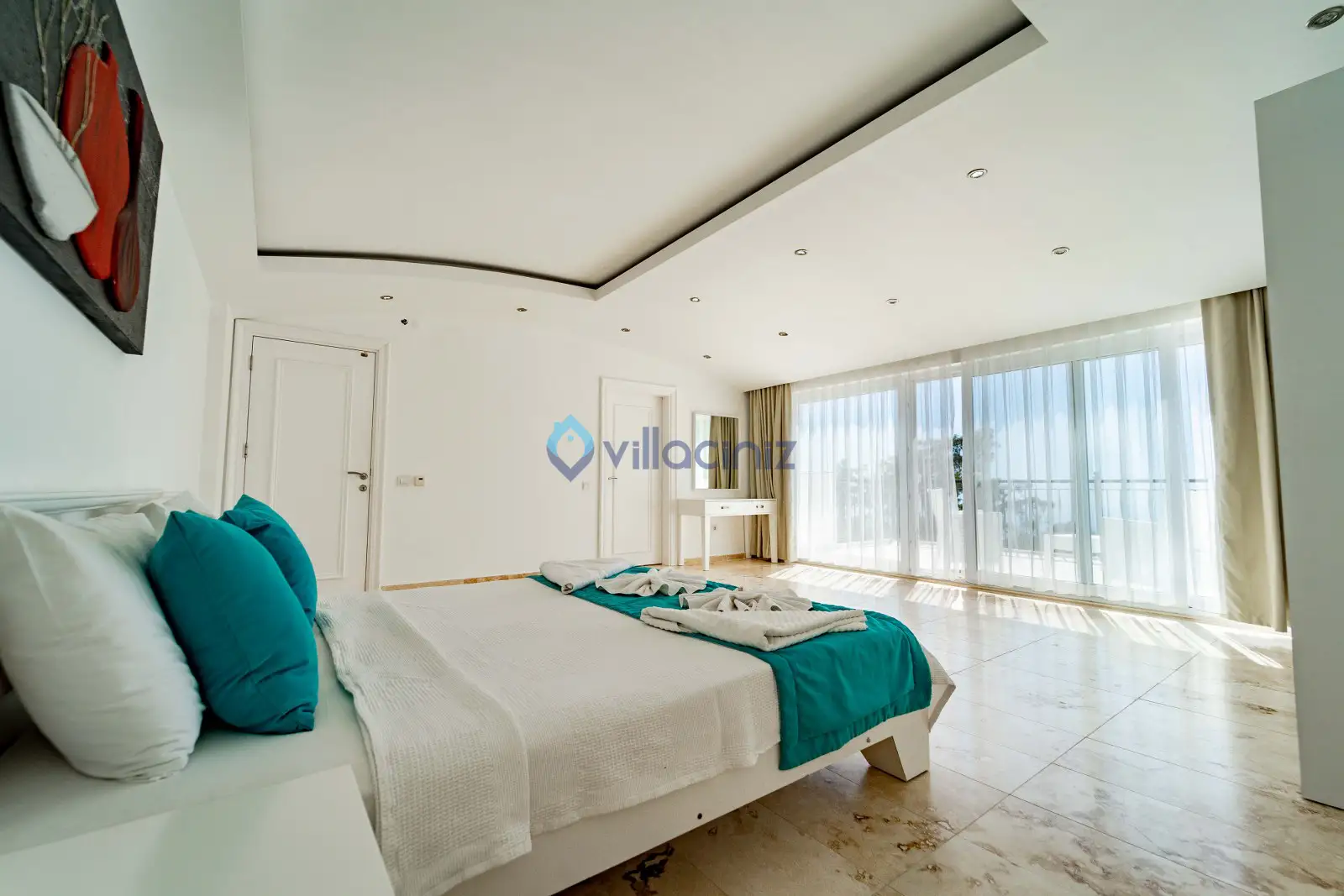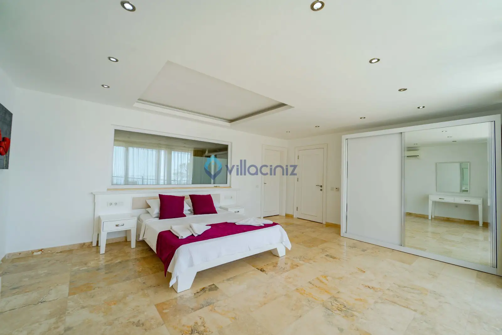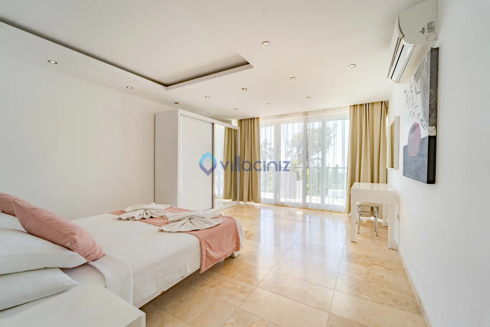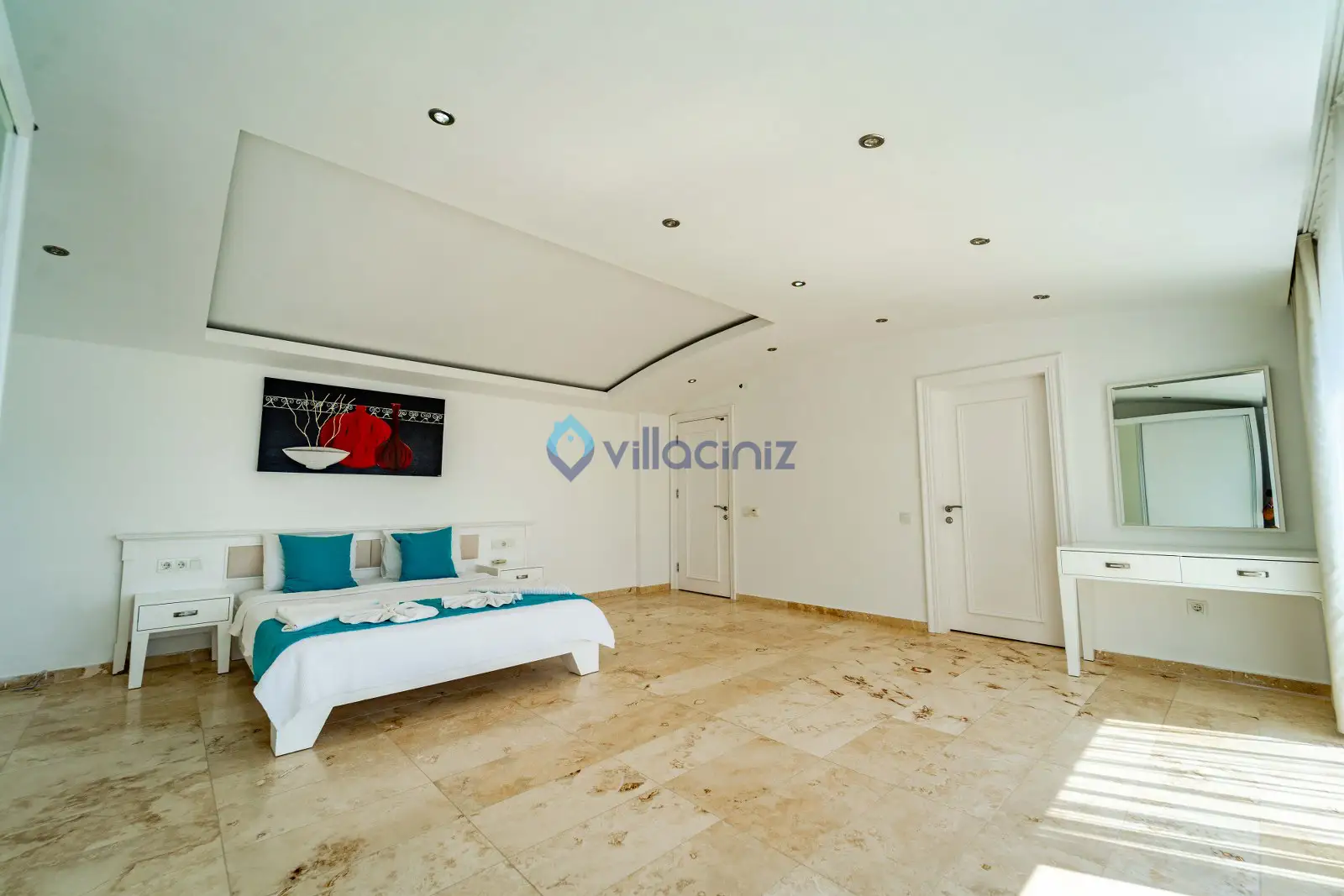 Yatak Odası 5: Suit doğa manzaralı odada çift kişilik yatak, komodin, klima, makyaj masası, elbise dolabı, ebeveyn banyosu bulunmaktadır.