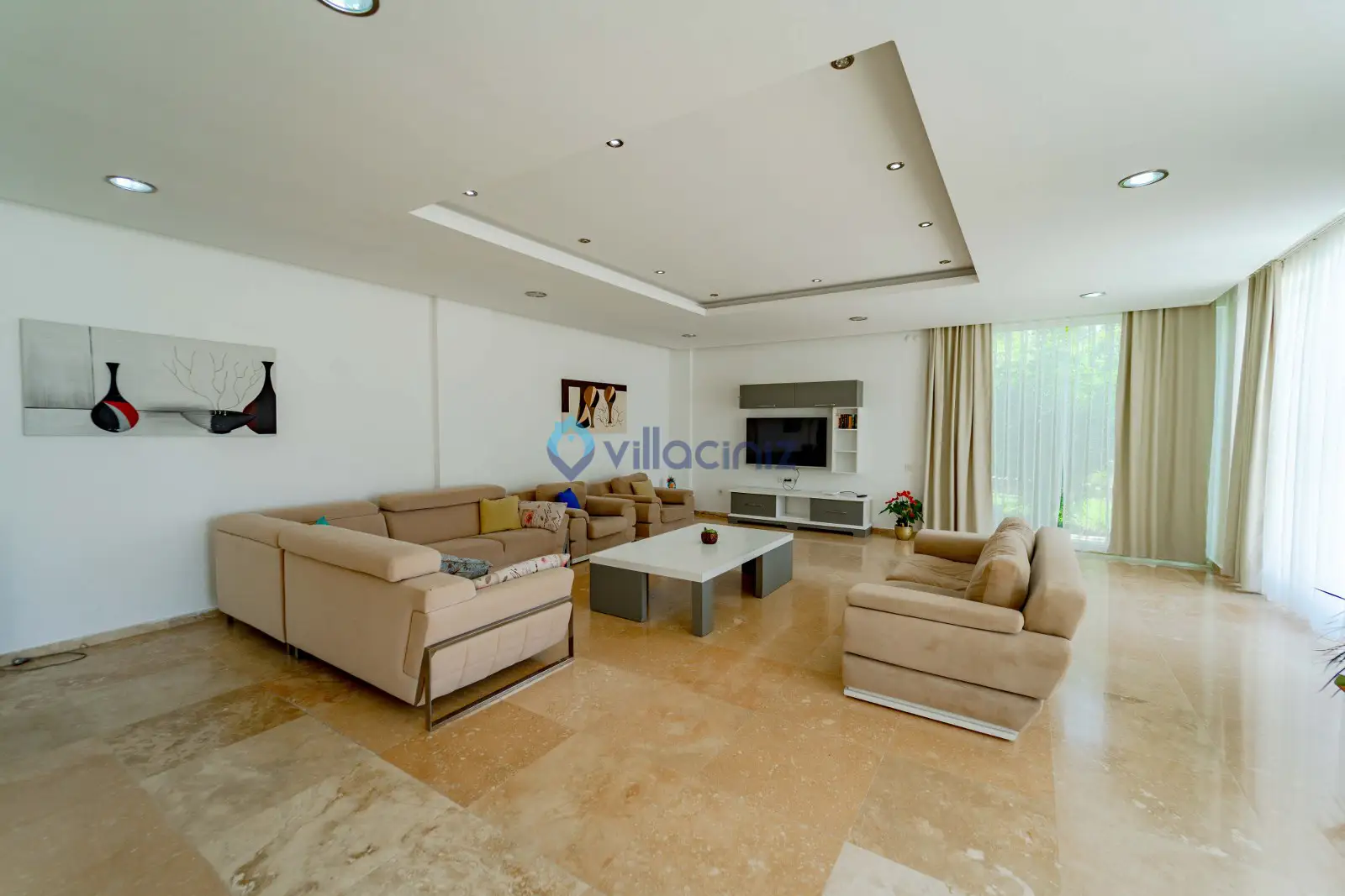 Doğa manzaralı salonunda oturma grubu, plazma TV, uydu alıcısı, klima, ütü ve ütü masası, sehpa, yemek masası ve havuz başına çıkış bulunmaktadır.