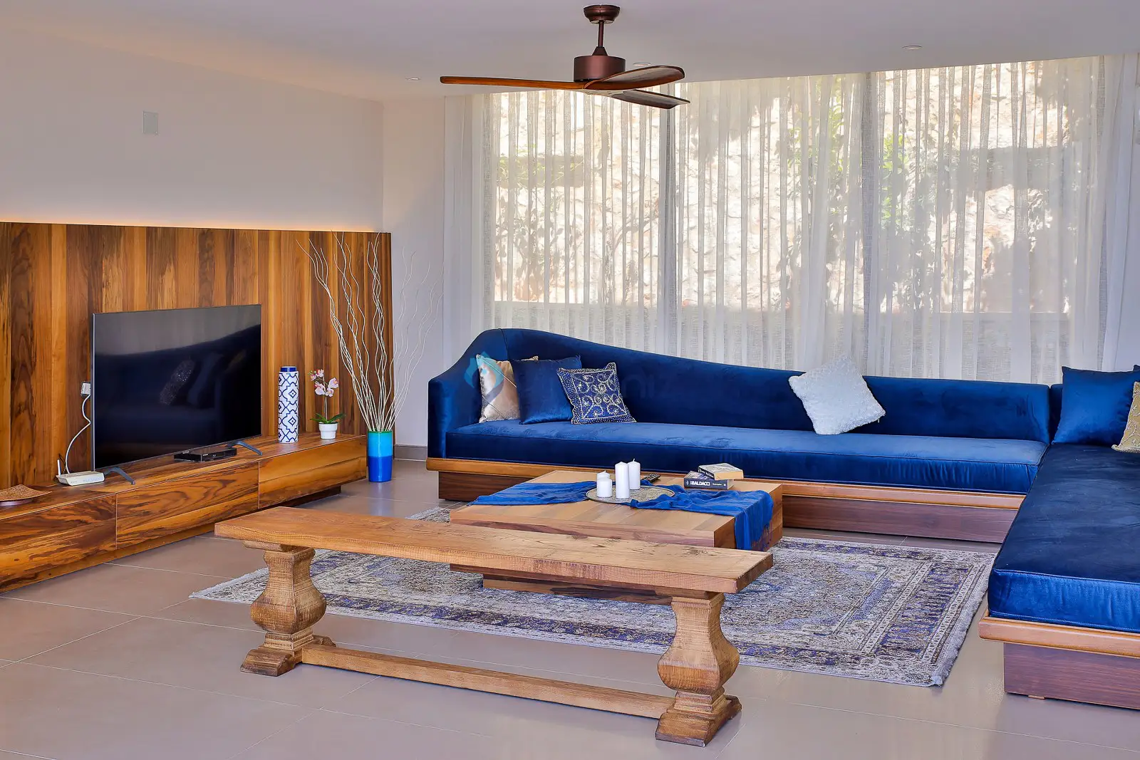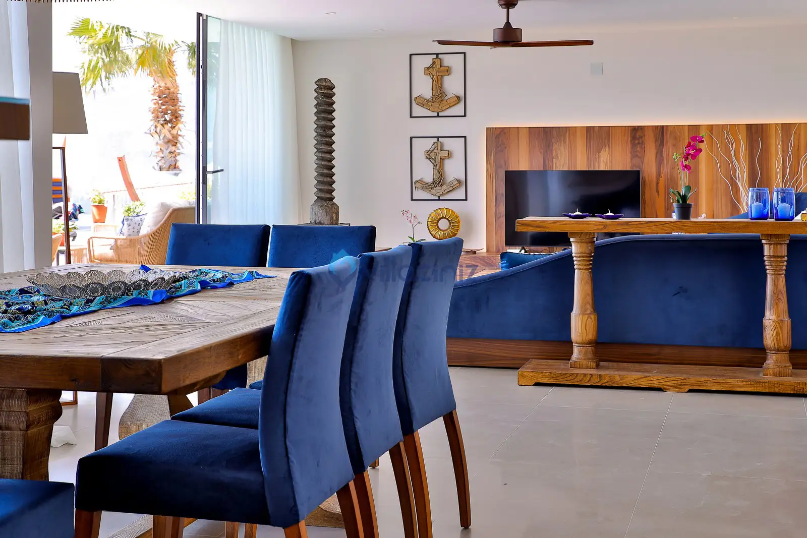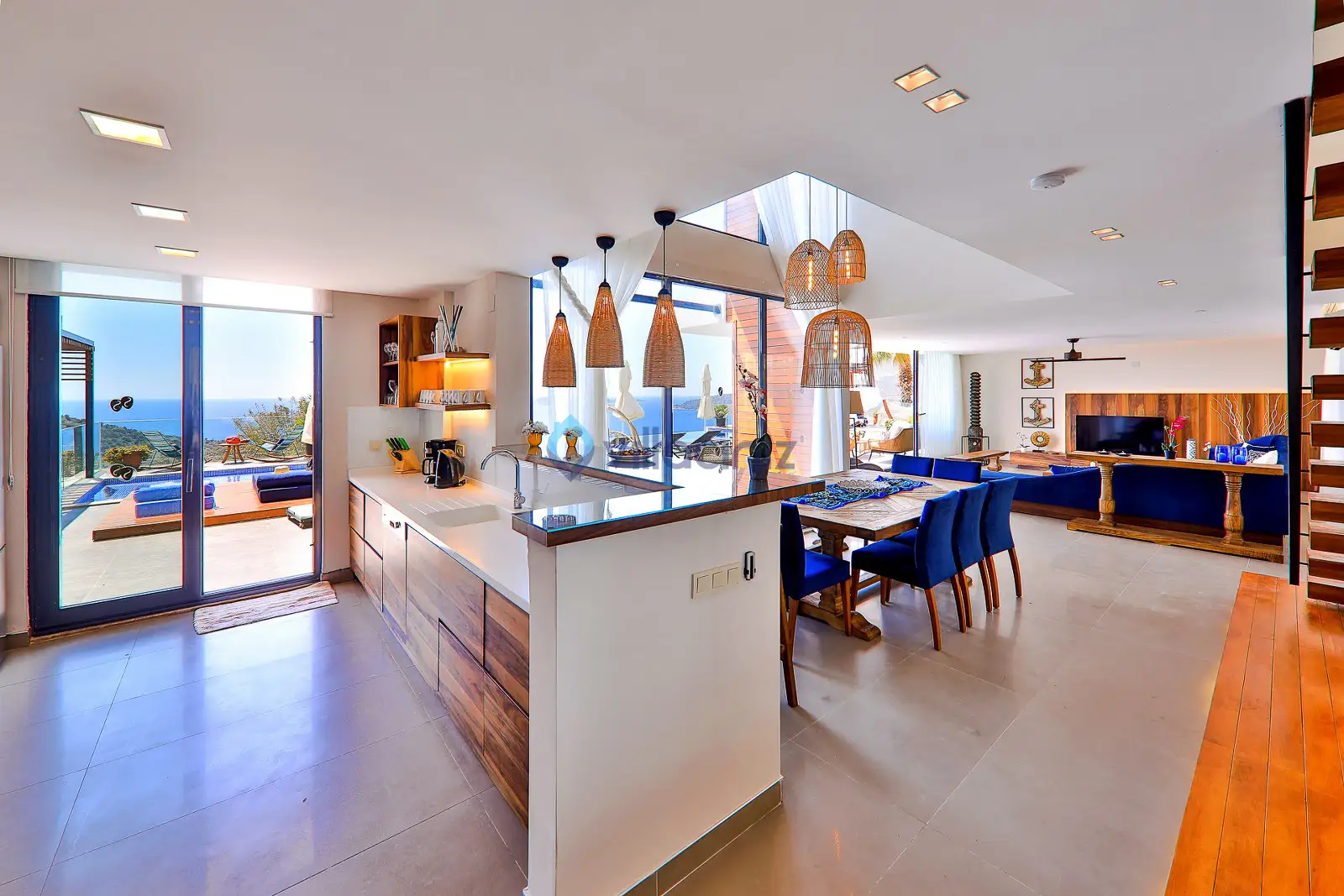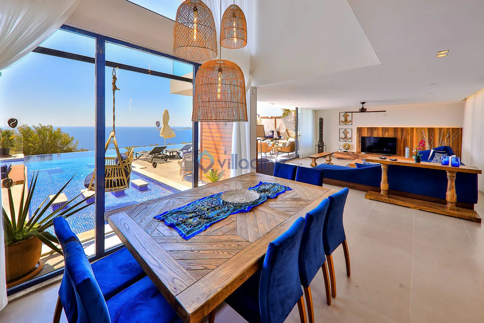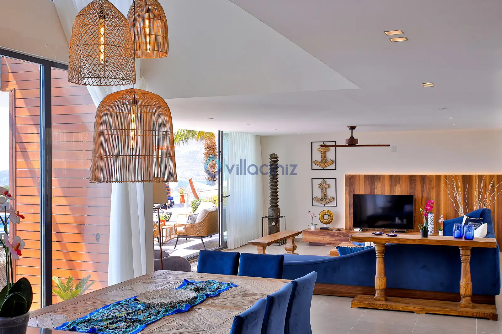 Genis ve modern deniz manzarali oturma odasi. Oturma grubu, sehpa, televizyon, uydu alicisi, klima, internet, havuz terasina çikis bulunmaktadir.