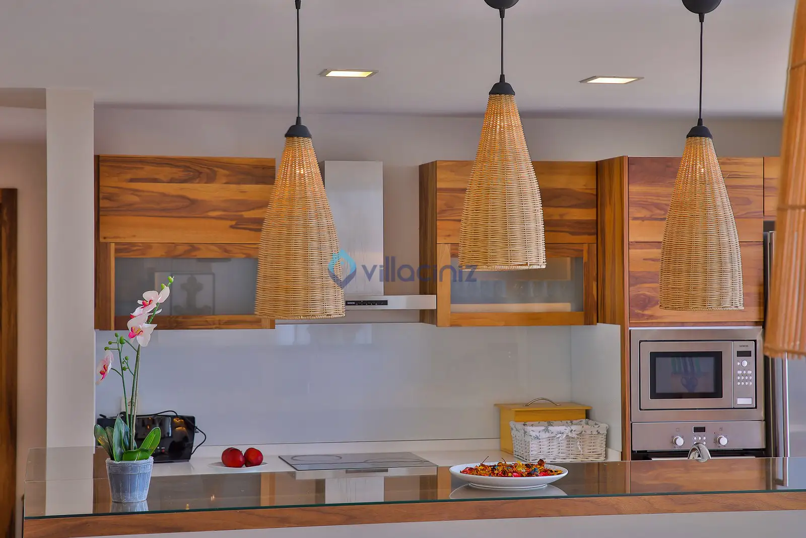 Modern tam donanimli Amerikan tipi mutfak. Yemek masasi ve sandalyeler, firin, mikro dalga, kisi sayisi kadar yemek takimi, tost makinesi, tava, çay-su bardaklari, tencereler, çatal biçak vs...
