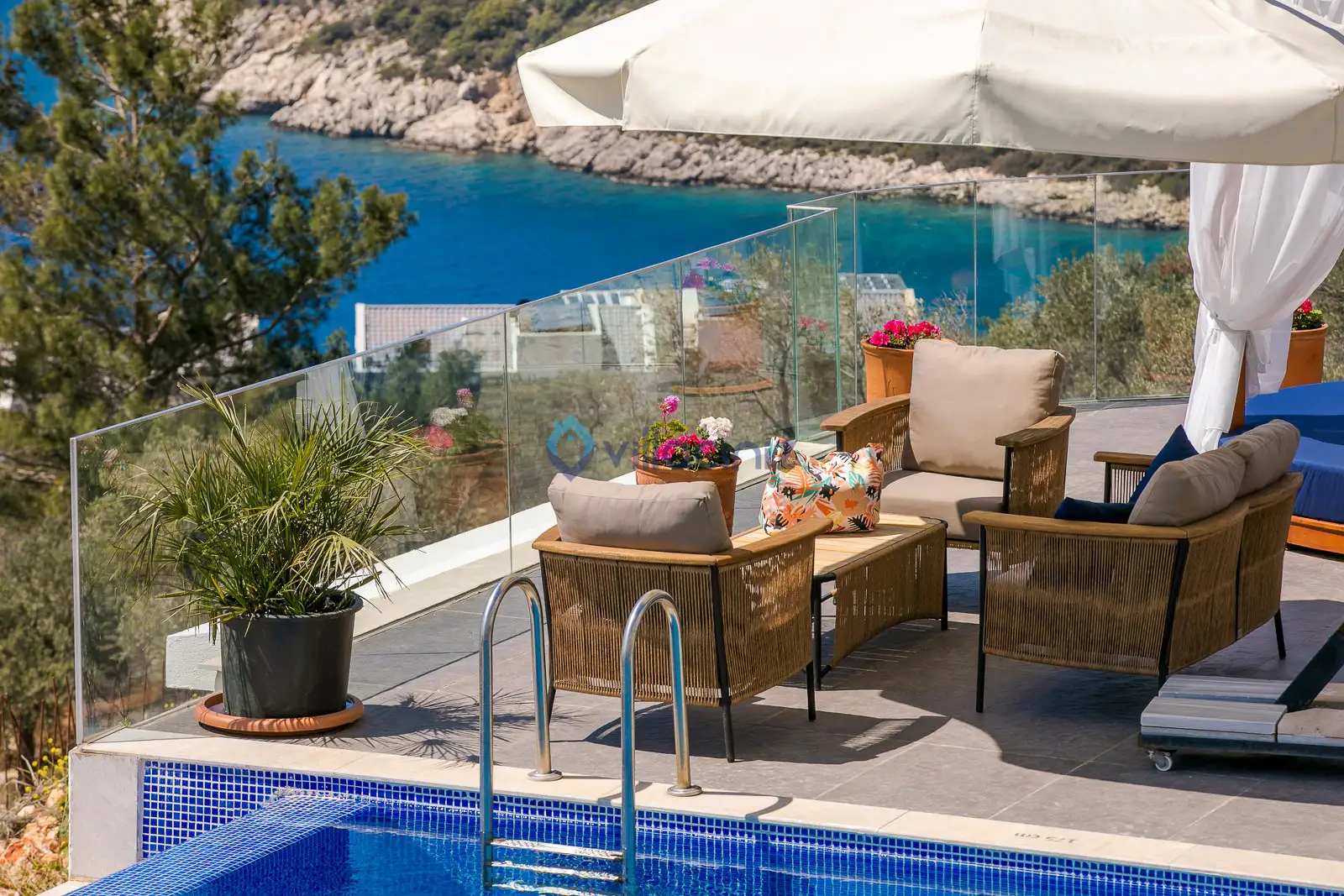Güneslenme alani, özel havuz ve bahçe. Sezlong ve semsiyeler, Oturma takimi, masa ve sandalyeler, sömine ve dus bölümü.