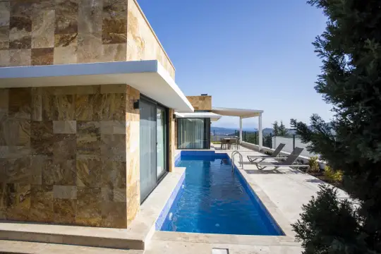 Güneslenme alani, özel havuz, özel bahçe, 8 kisilik masa ve sandalye, sezlong, mangal, günes semsiyesi bulunmaktadir.