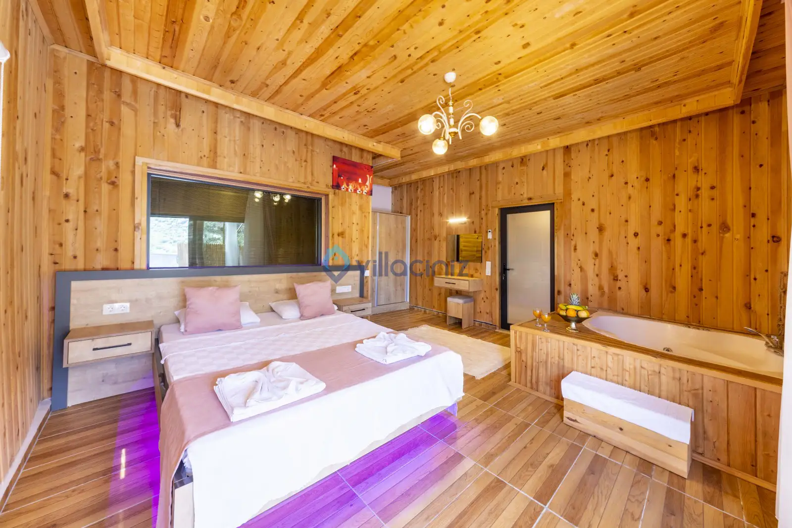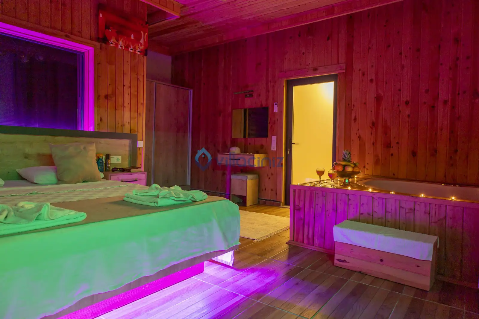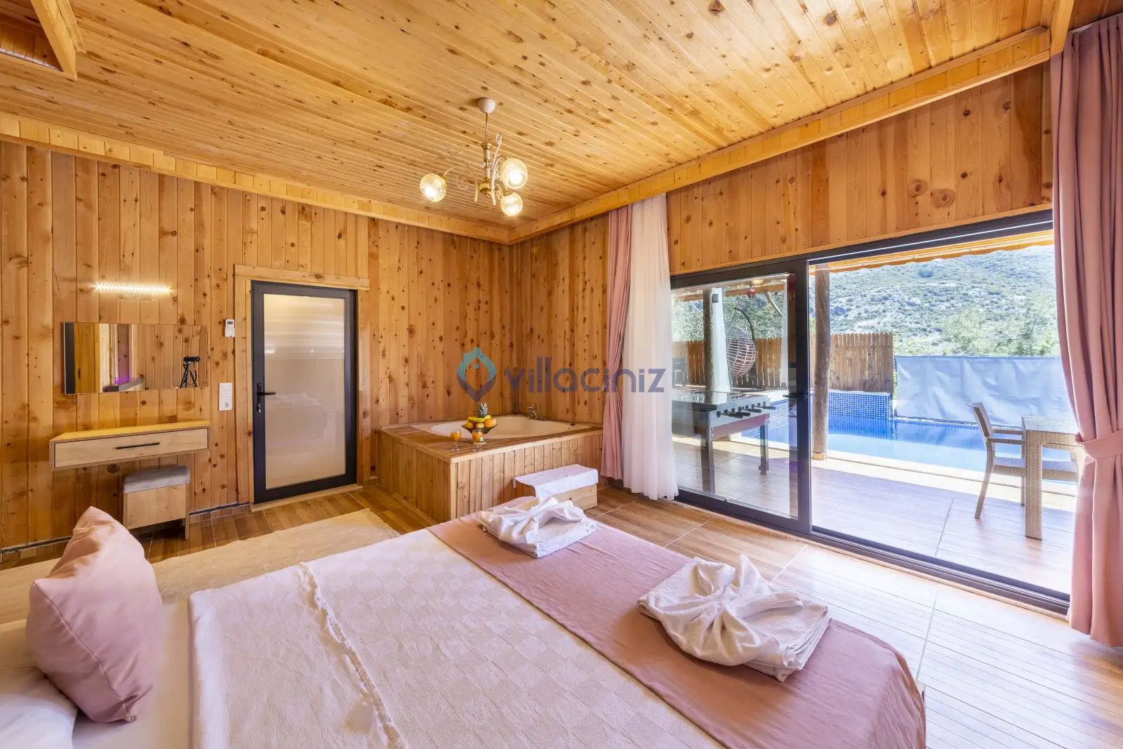 Yatak Odası 1: Çift kişilik yatak, klima, komodin, elbise dolabı, tv, makyaj masası, jakuzi, banyo ve tuvalet, havuz başına çıkış bulunmaktadır.