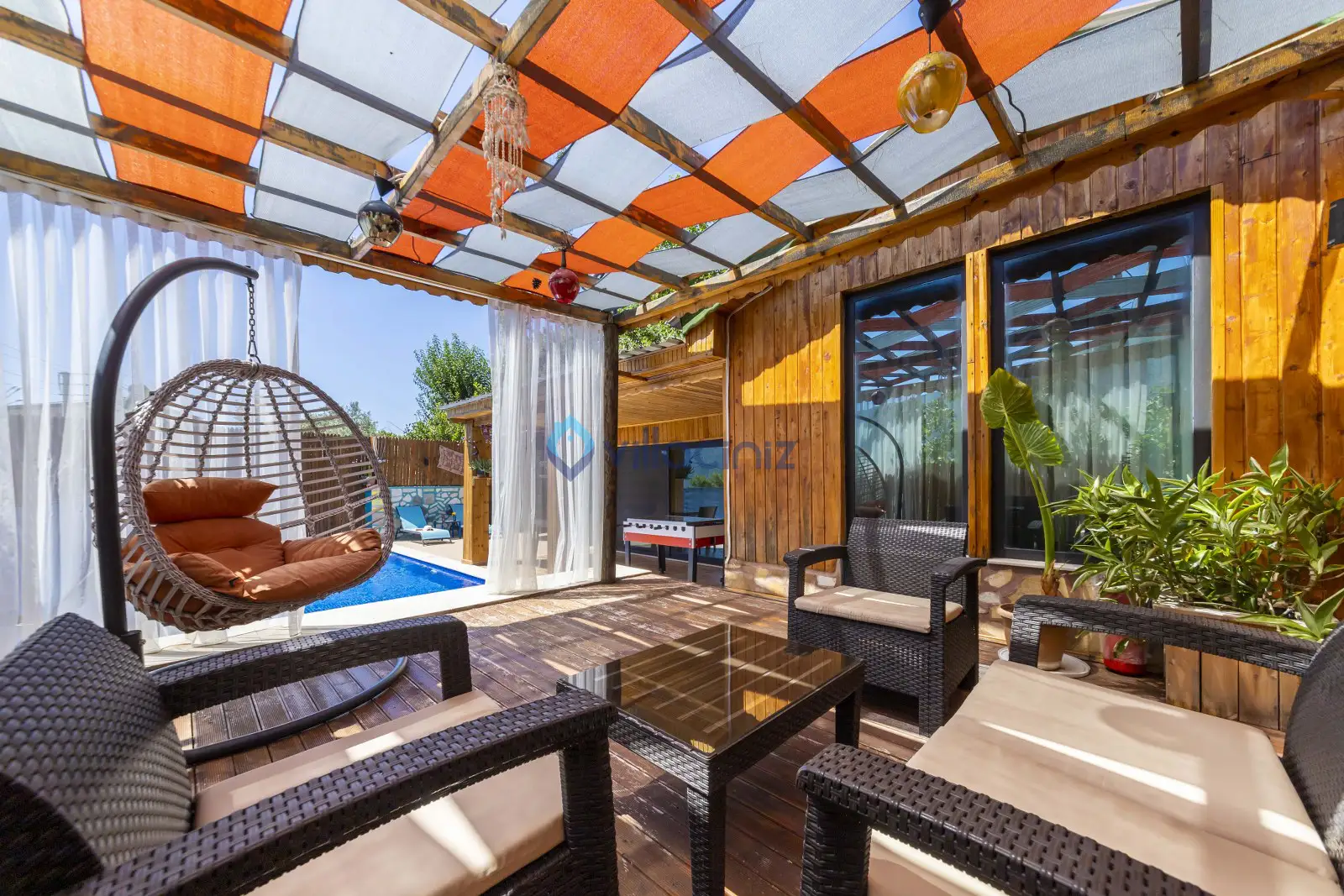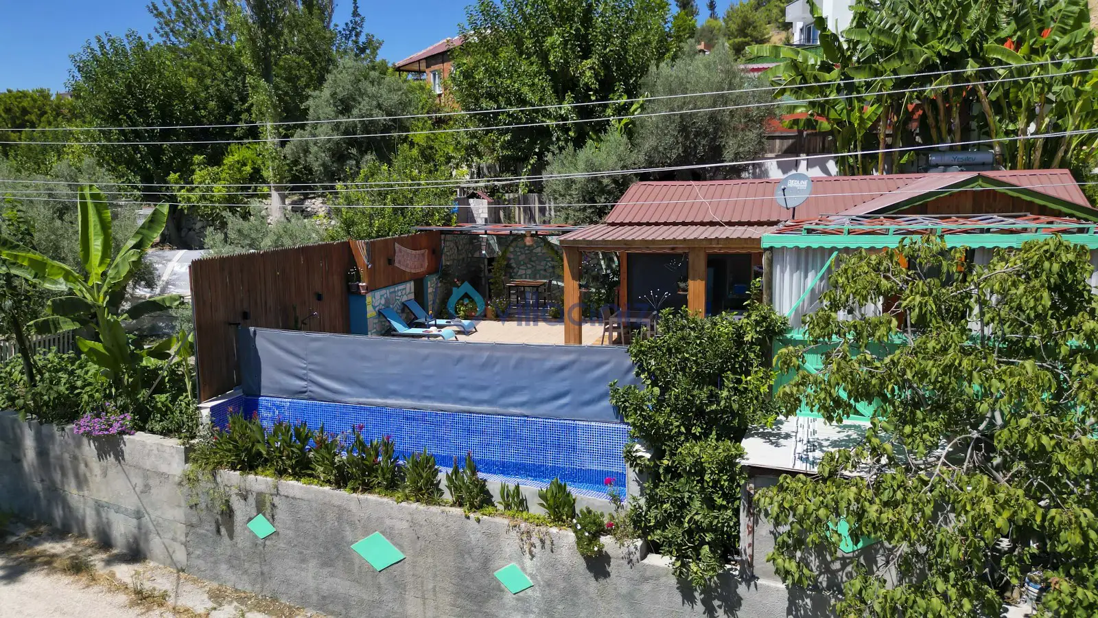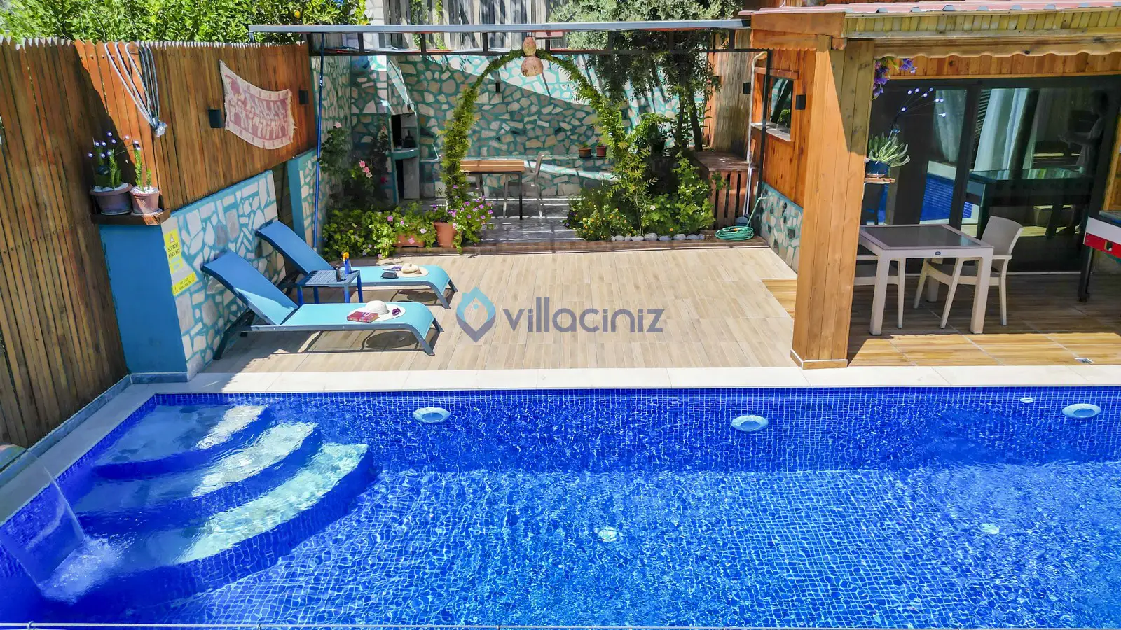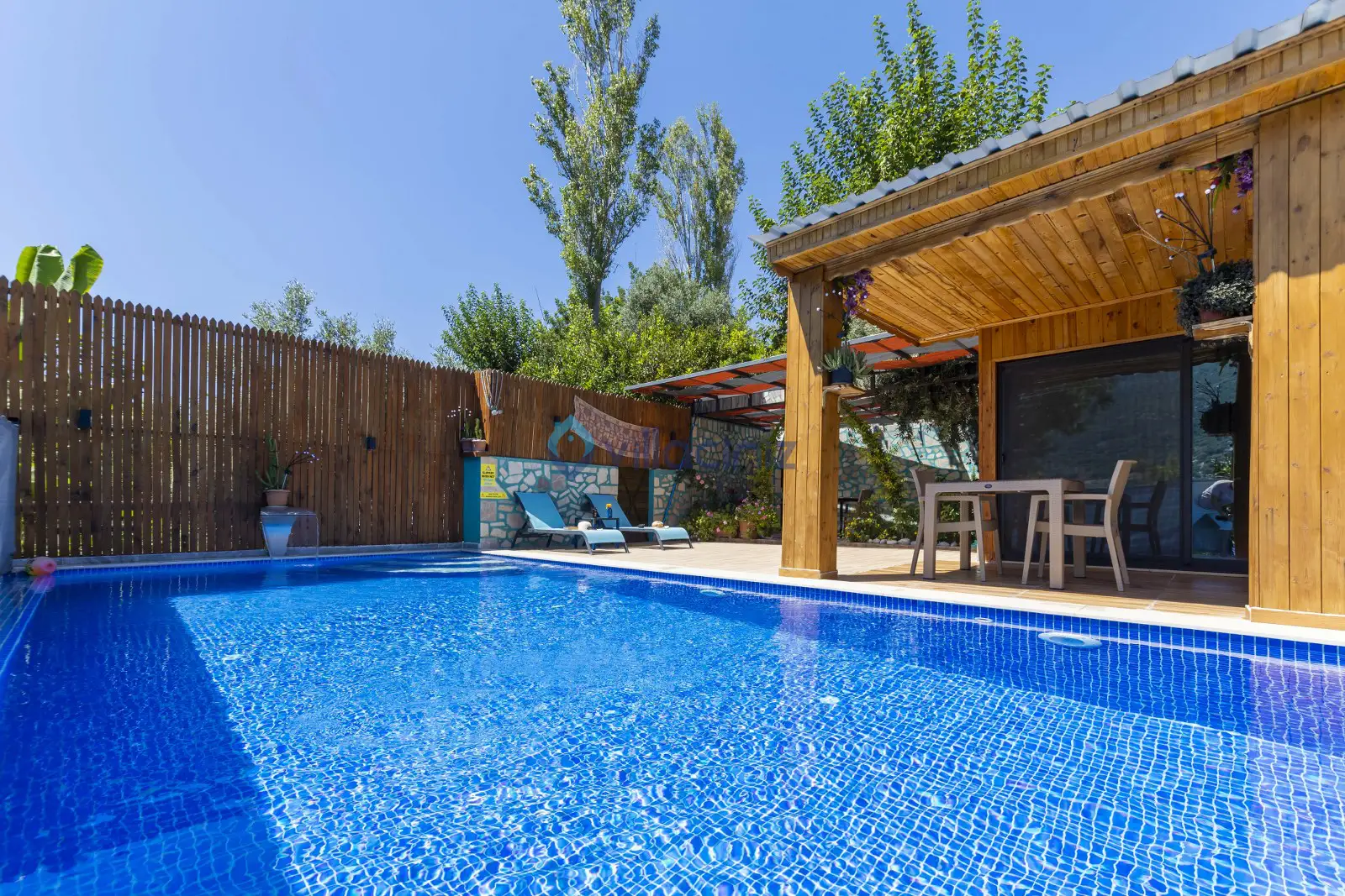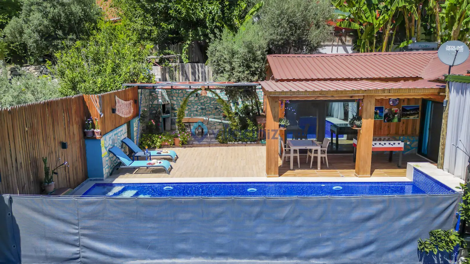 Havuz terası korunaklıdır dış taraftan görünmemektedir. Havuz terasında şezlong, şemsiye, mangal, salıncak, langırt 2 kişilik yemek masası bulunmaktadır.