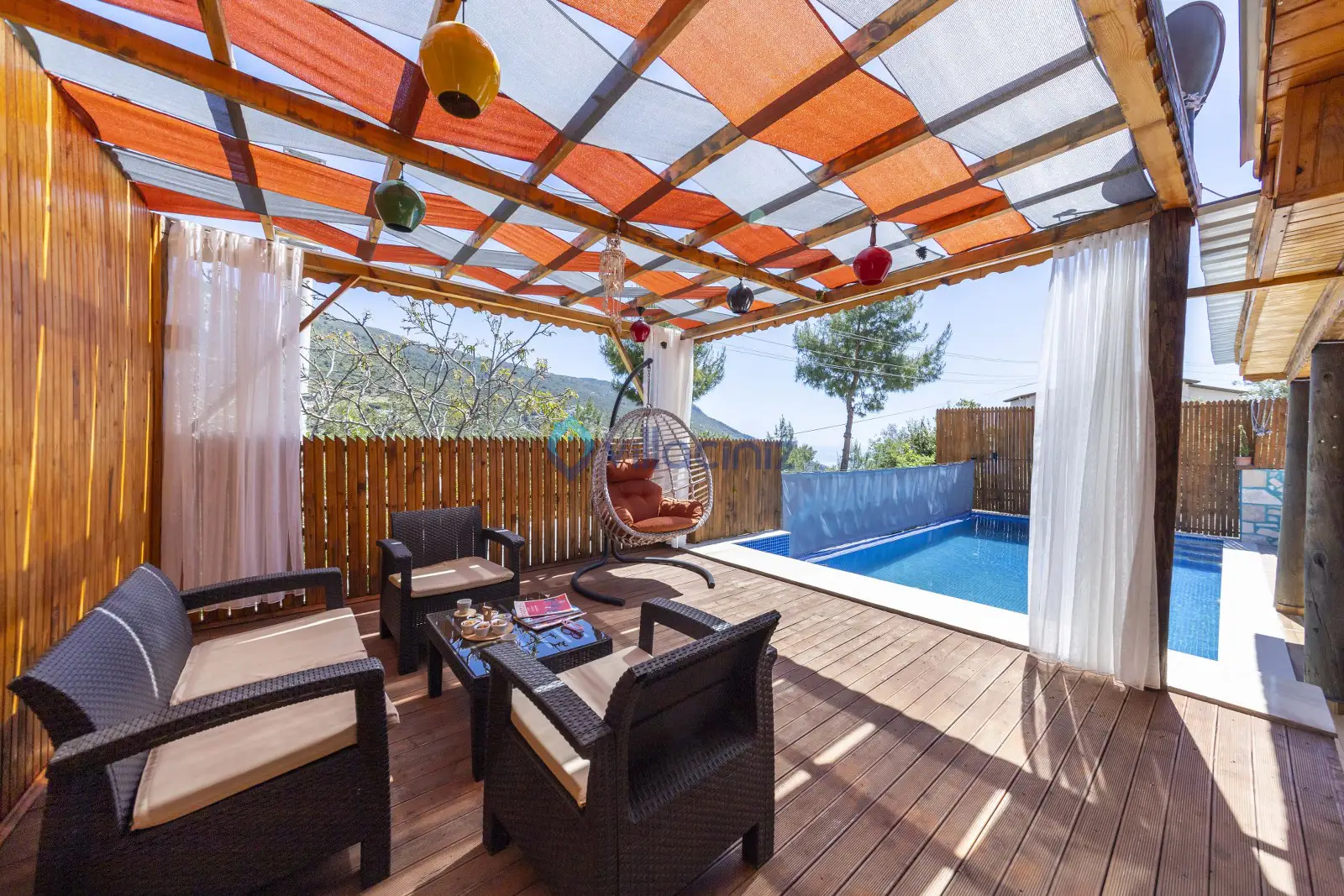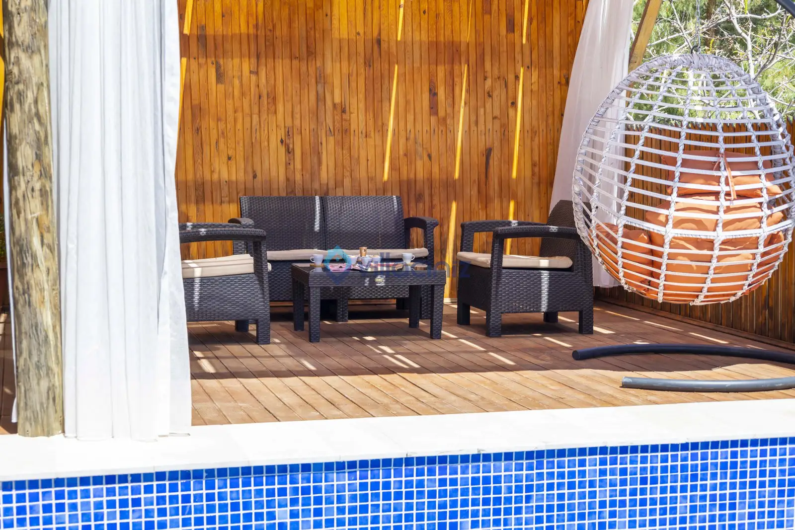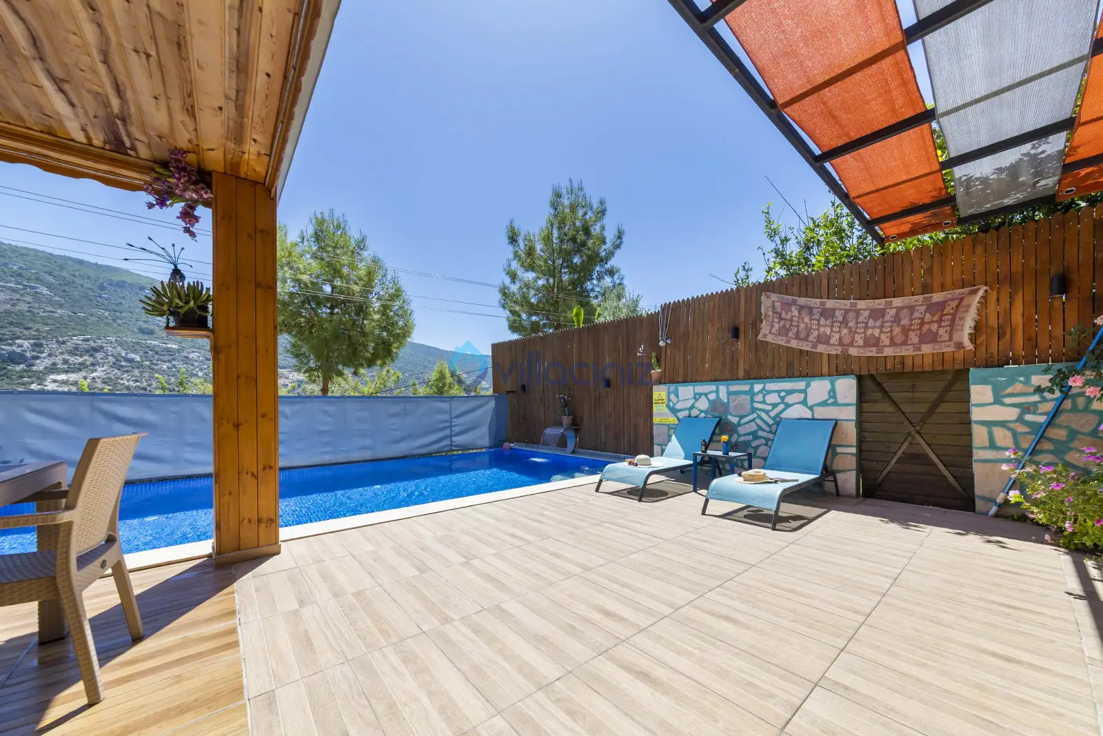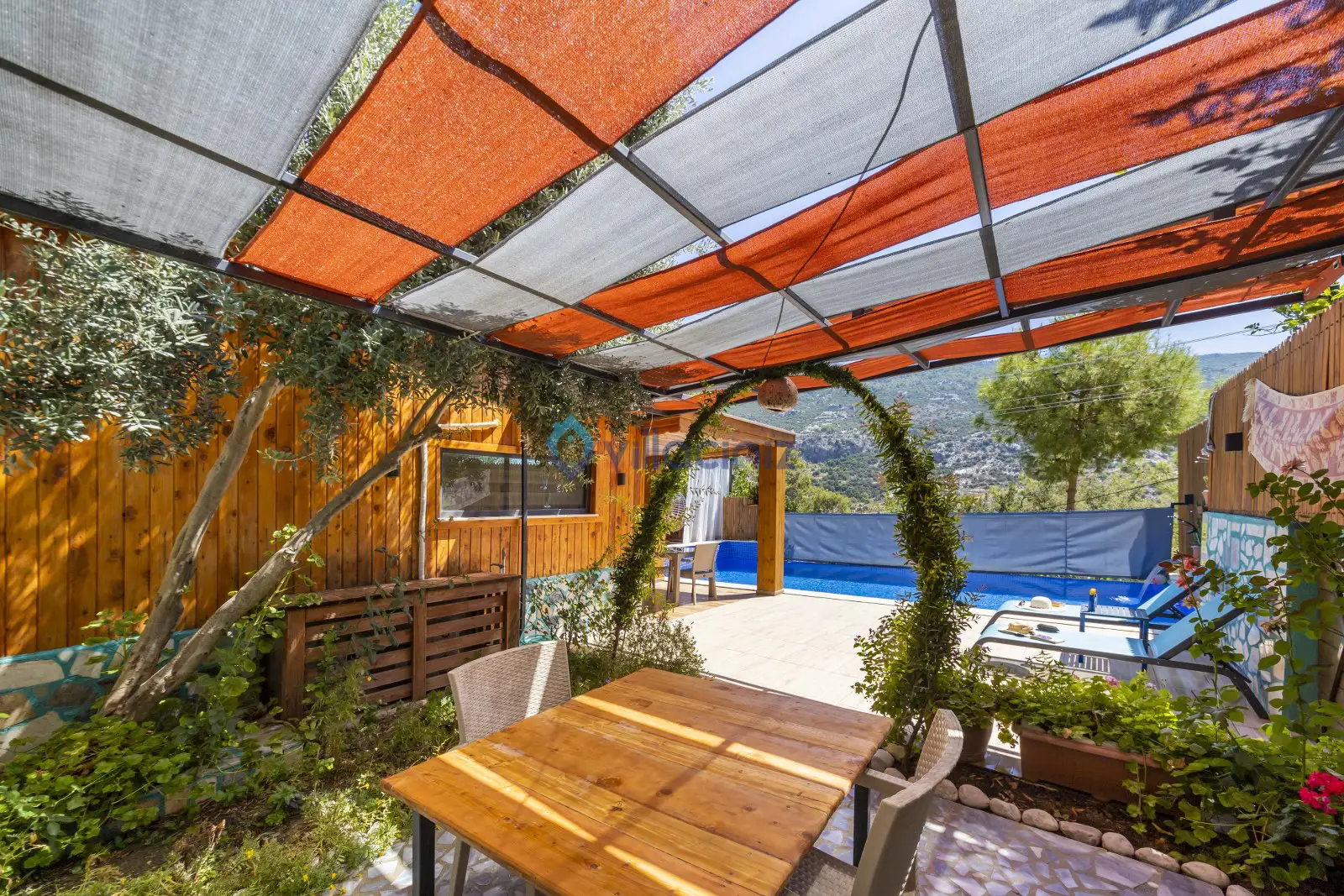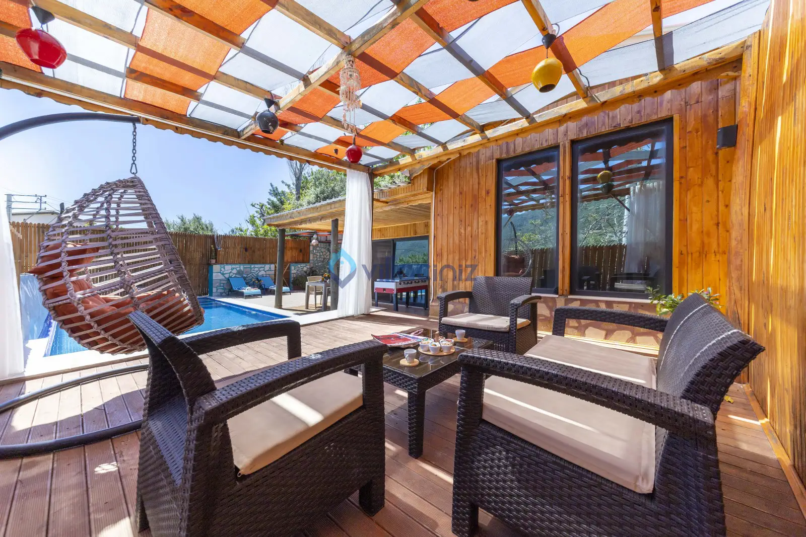 Havuz terası korunaklıdır dış taraftan görünmemektedir. Havuz terasında şezlong, şemsiye, mangal, salıncak, langırt 2 kişilik yemek masası bulunmaktadır.