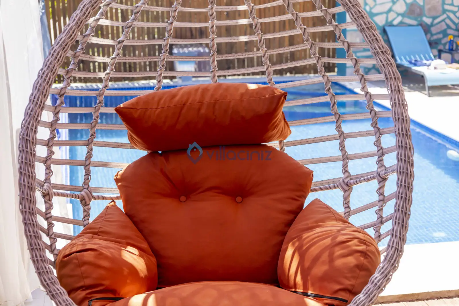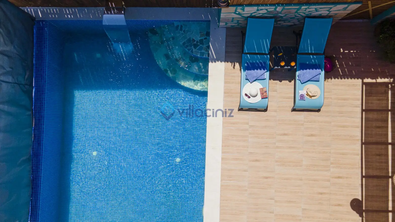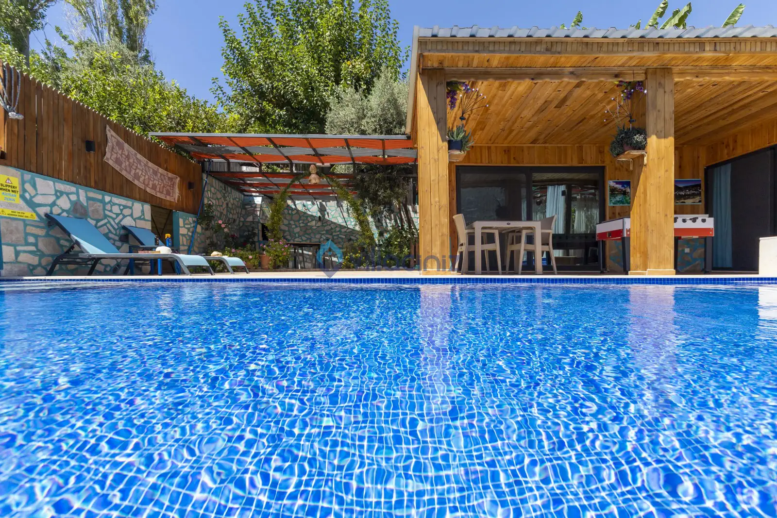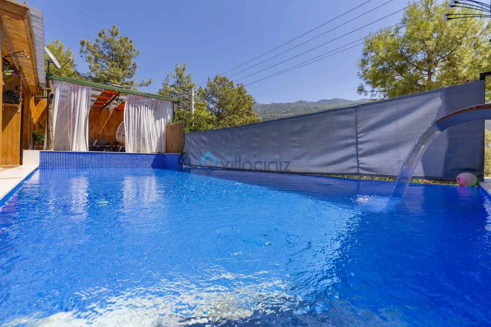 Havuz terası korunaklıdır dış taraftan görünmemektedir. Havuz terasında şezlong, şemsiye, mangal, salıncak, langırt 2 kişilik yemek masası bulunmaktadır.