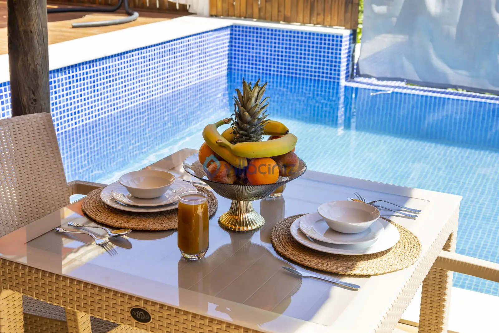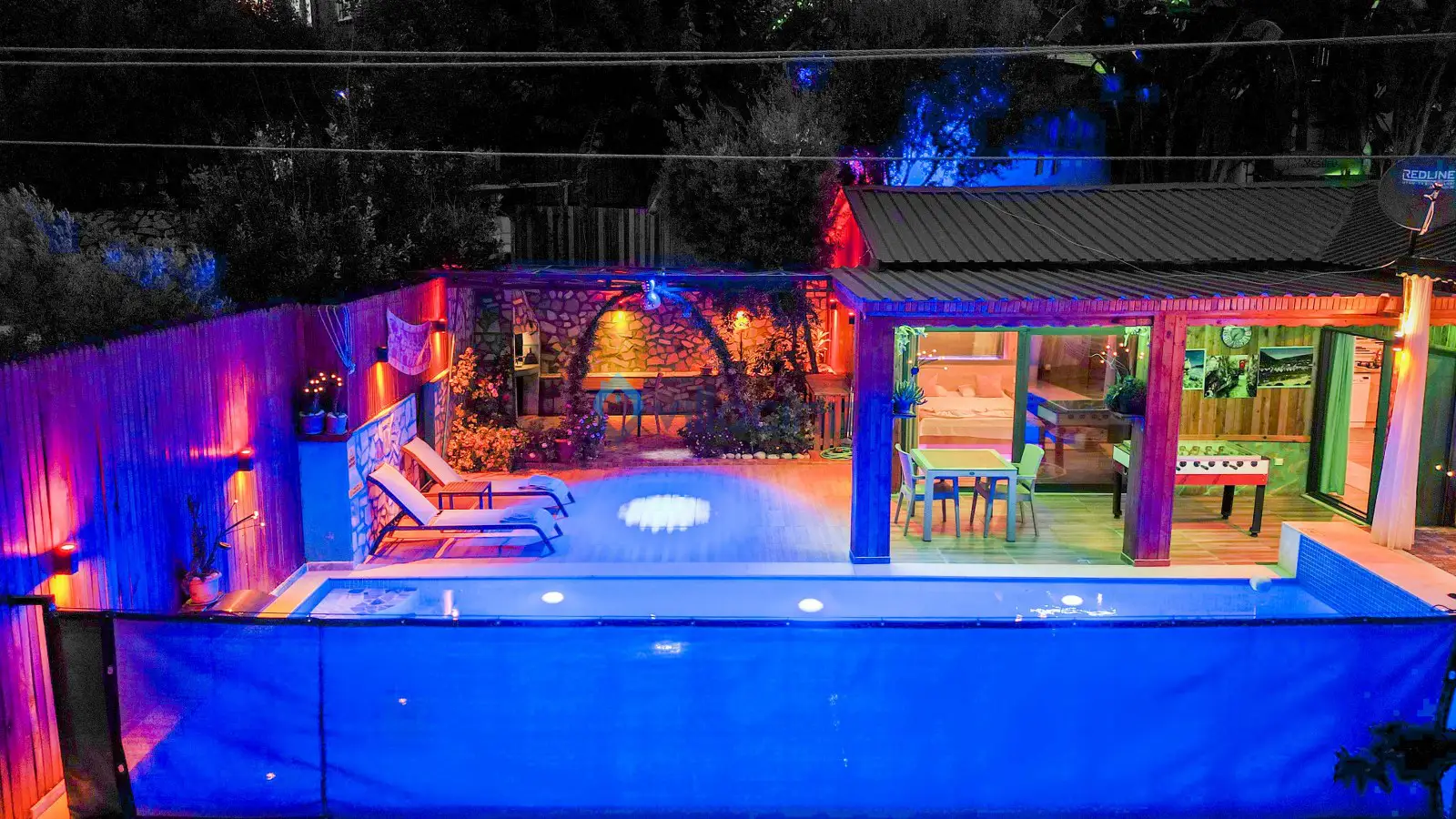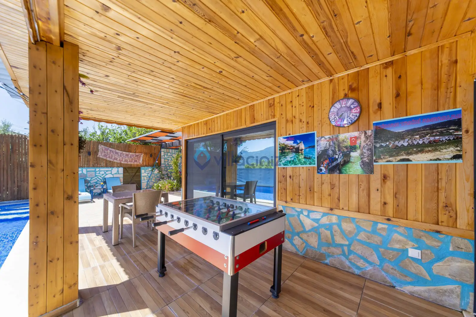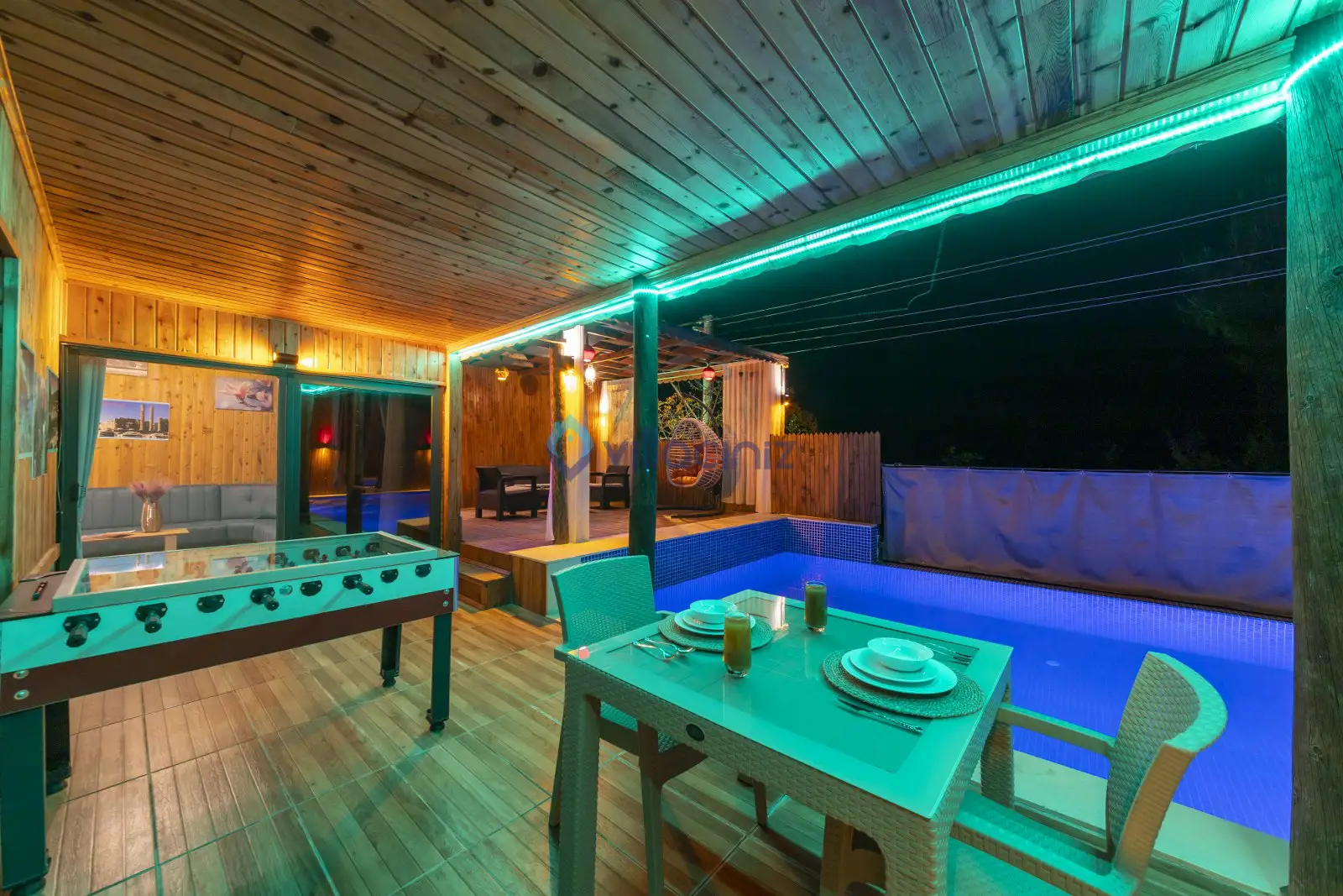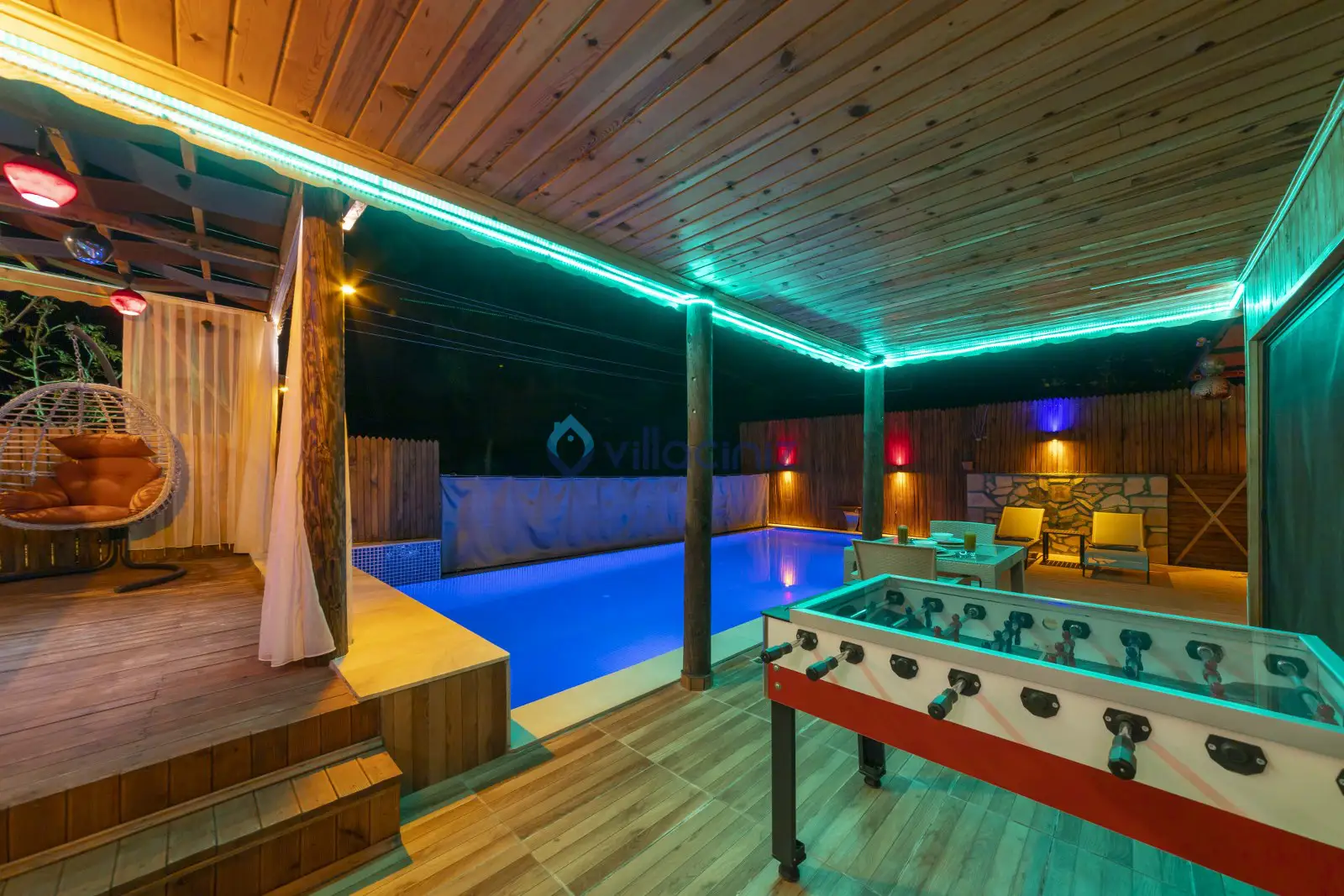 Havuz terası korunaklıdır dış taraftan görünmemektedir. Havuz terasında şezlong, şemsiye, mangal, salıncak, langırt 2 kişilik yemek masası bulunmaktadır.