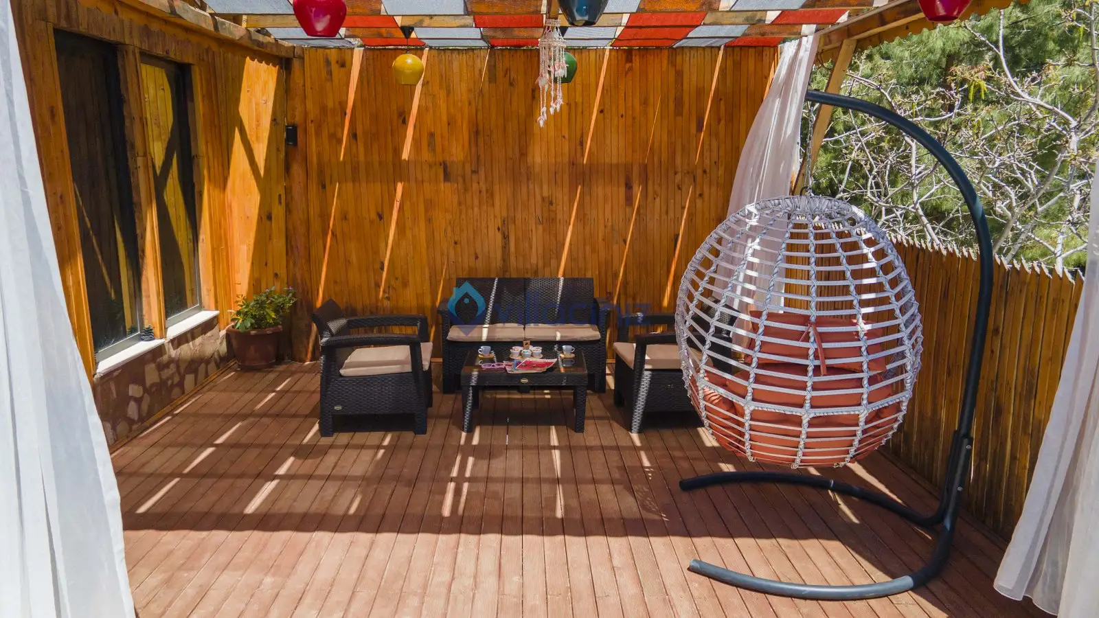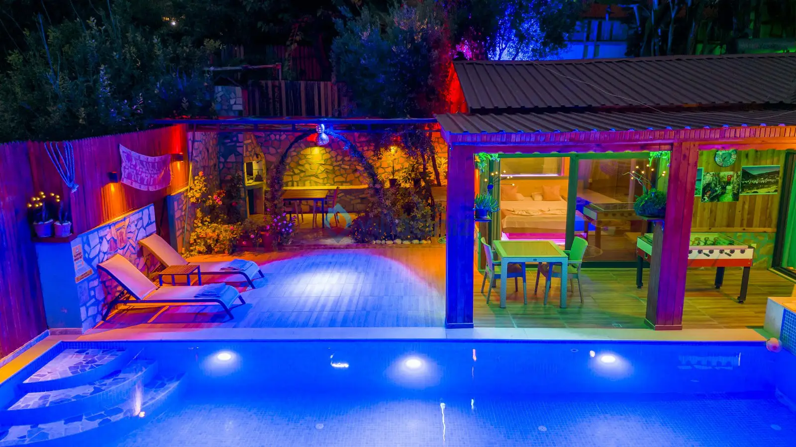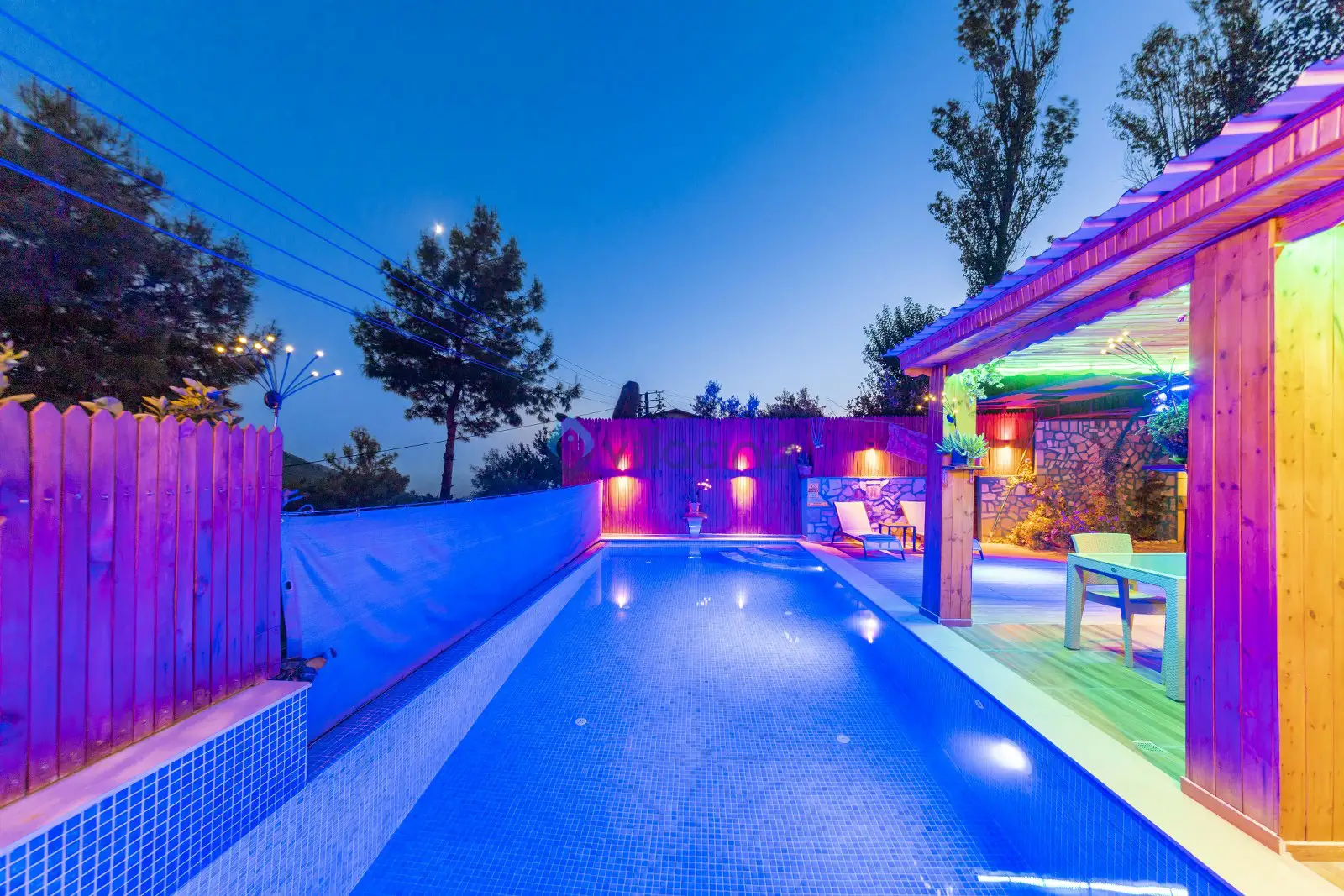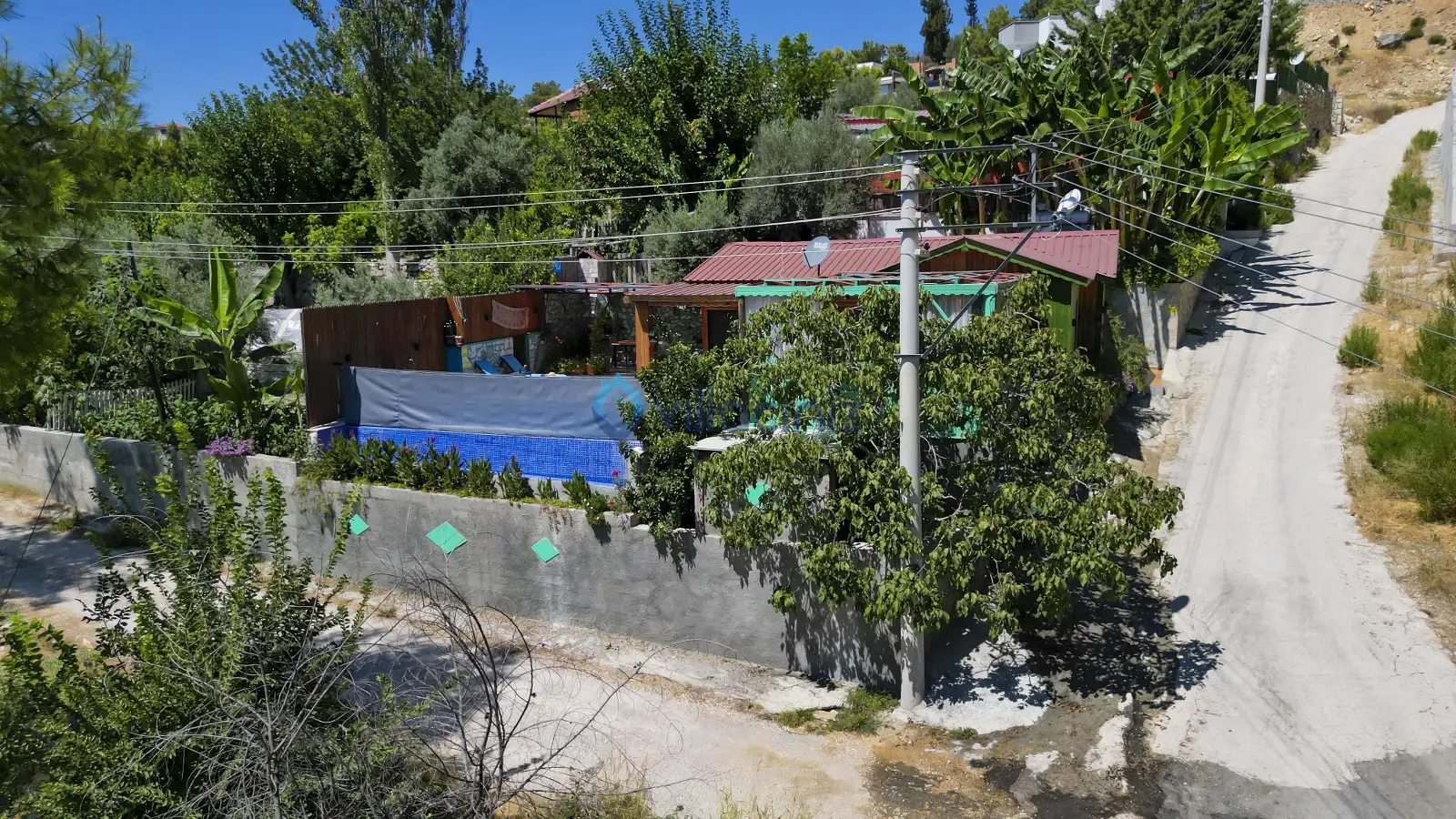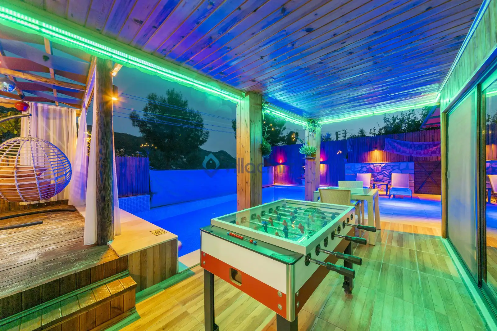Havuz terası korunaklıdır dış taraftan görünmemektedir. Havuz terasında şezlong, şemsiye, mangal, salıncak, langırt 2 kişilik yemek masası bulunmaktadır.