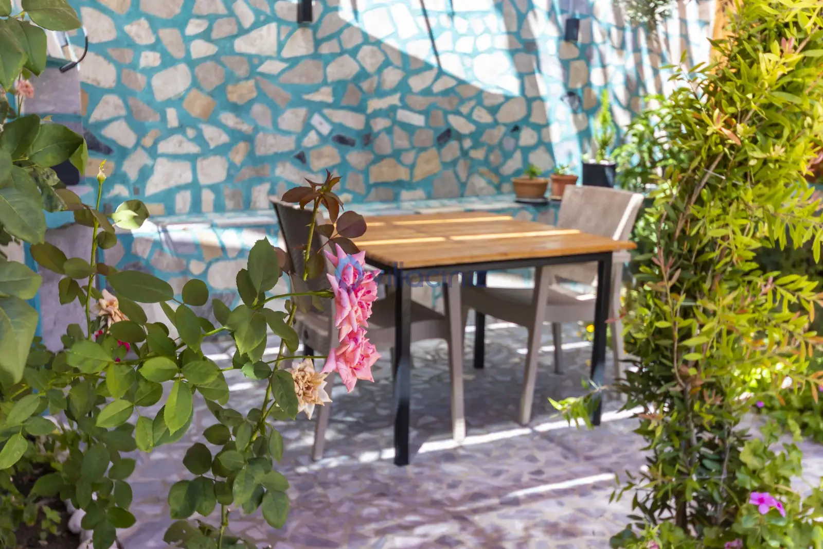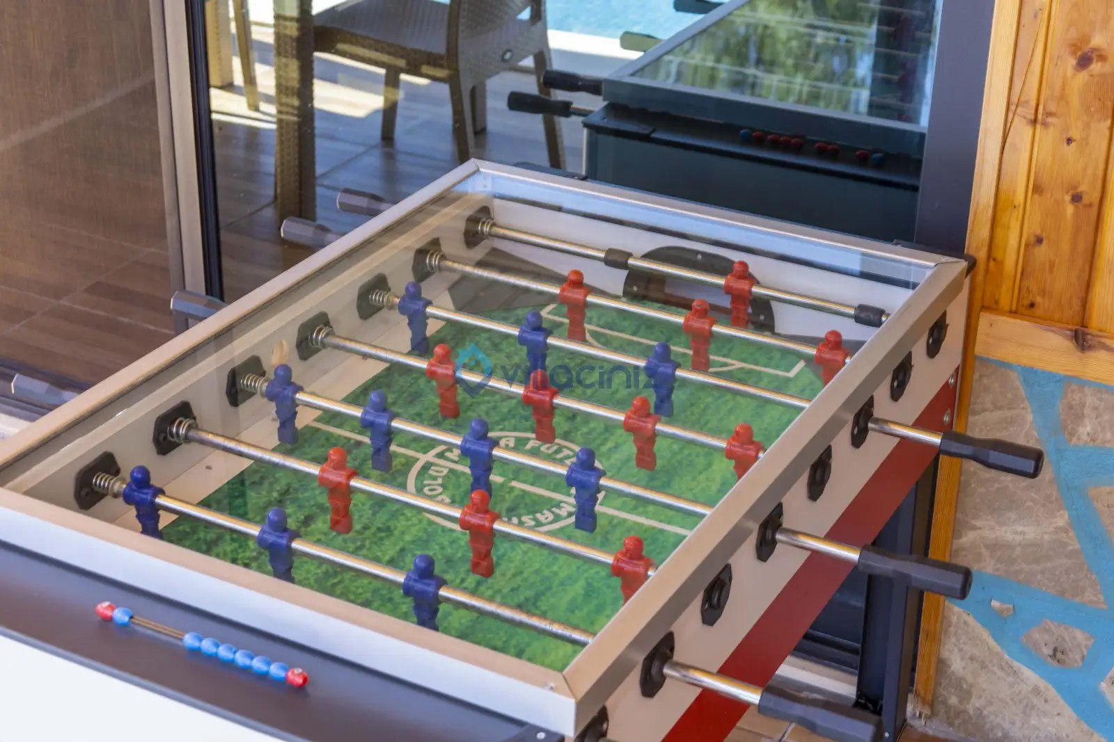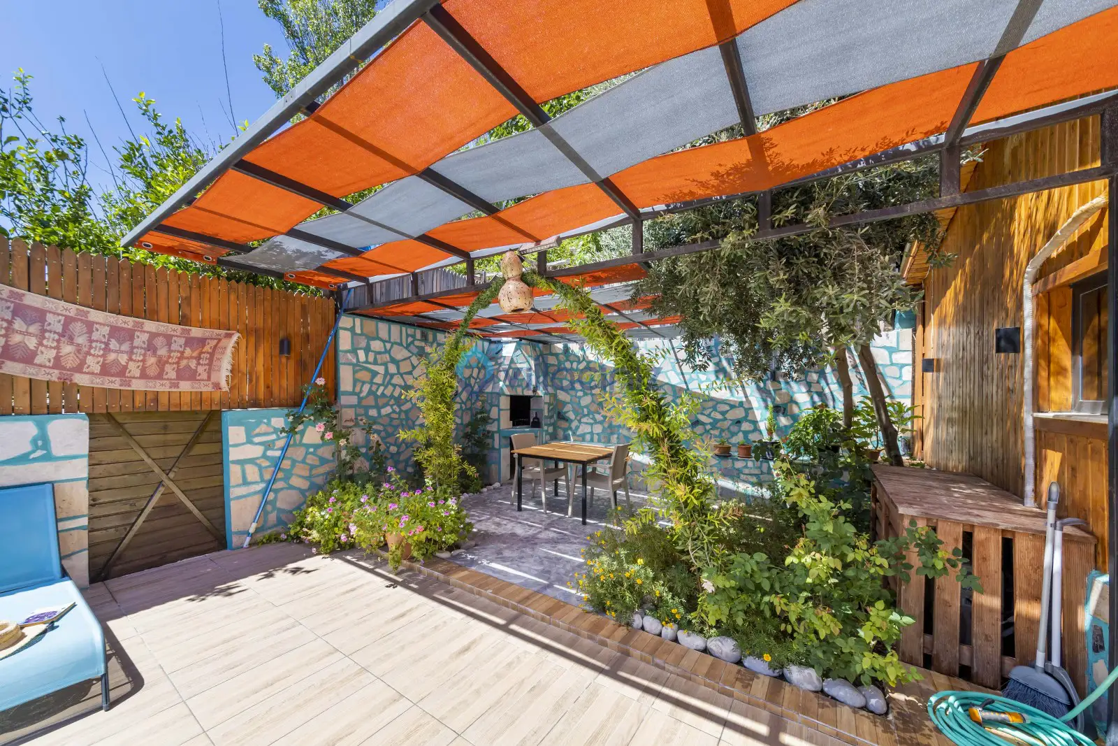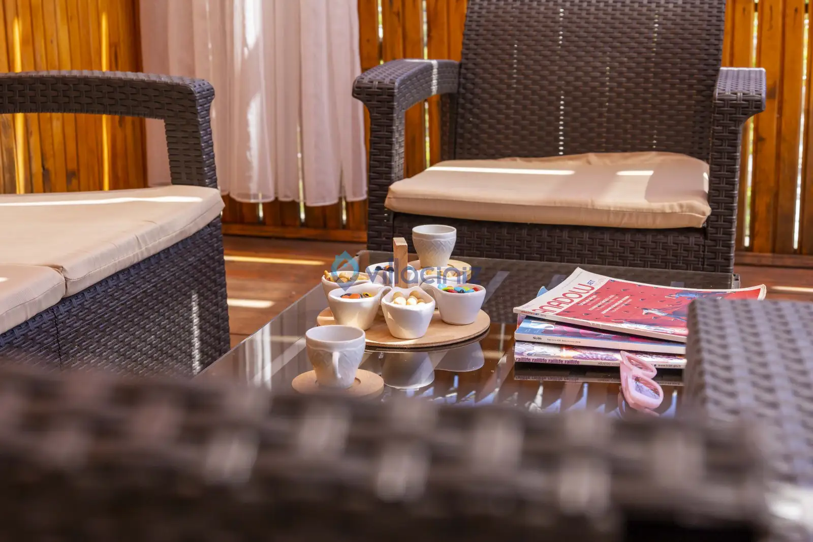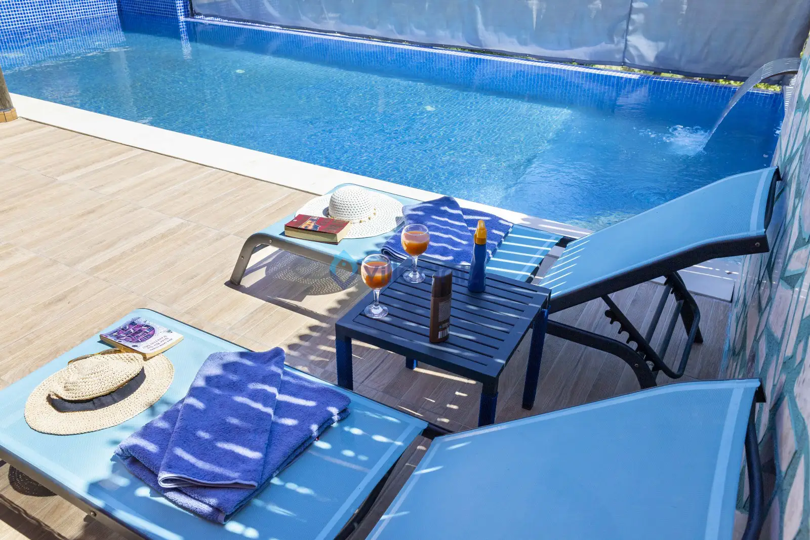Havuz terası korunaklıdır dış taraftan görünmemektedir. Havuz terasında şezlong, şemsiye, mangal, salıncak, langırt 2 kişilik yemek masası bulunmaktadır.