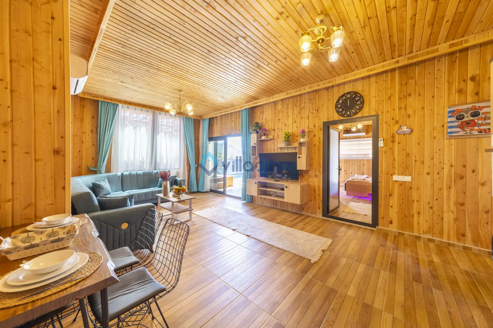 Doğa manzaralı salonunda oturma grubu, plazma televizyon, uydu alıcısı, klima, sehpa ve havuz başına çıkış bulunmaktadır.