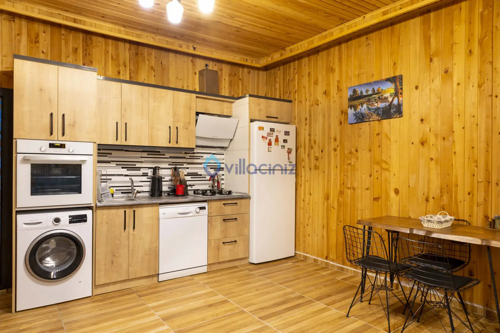 2 kişilik yemek masası, buzdolabı, çamaşır makinesi, bulaşık makinesi, fırın, mikrodalga fırın, ocak, elektrikli su ısıtıcısı, yemek takımı, mutfak araç ve gereçleri bulunmaktadır.